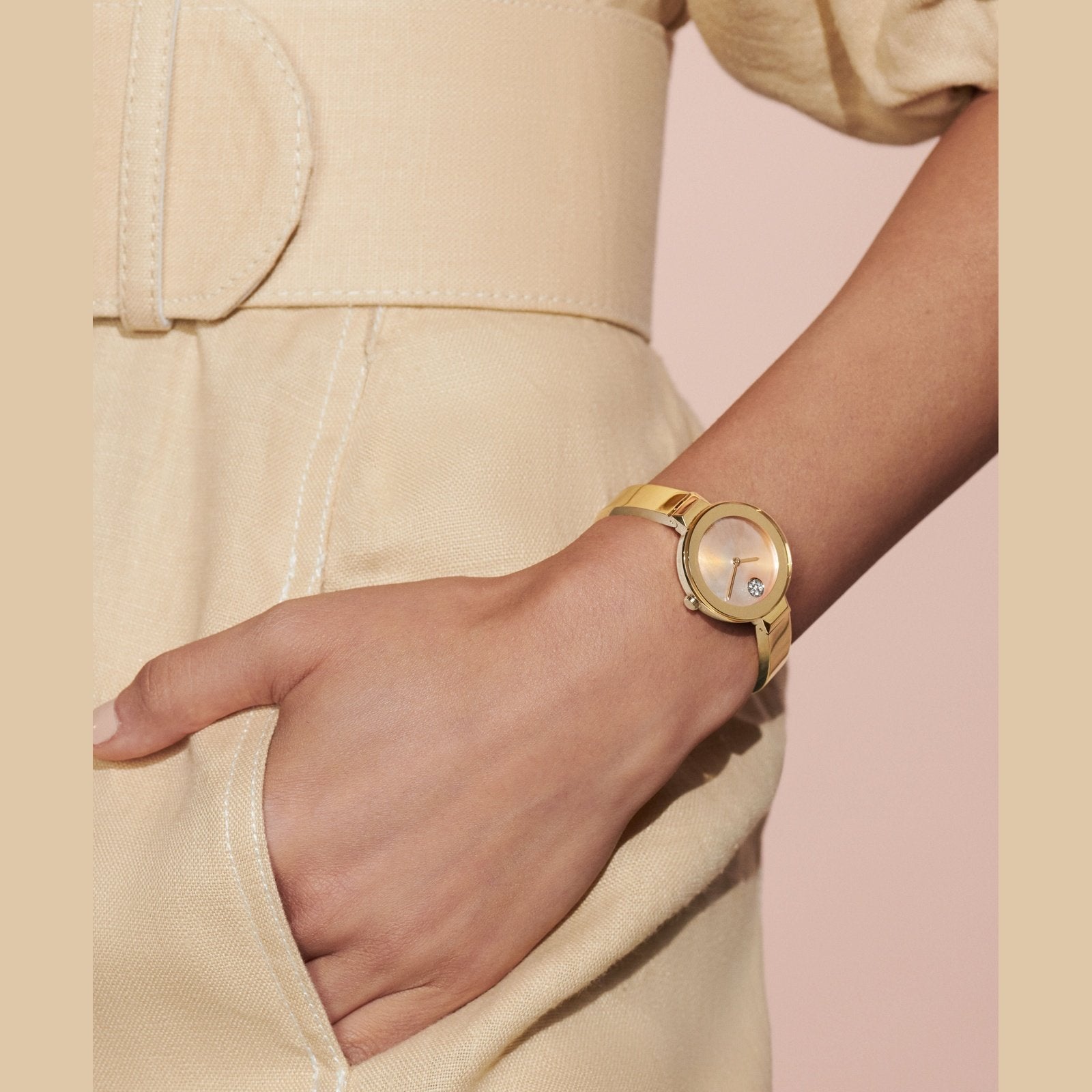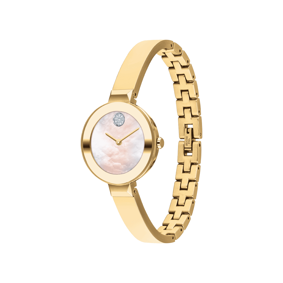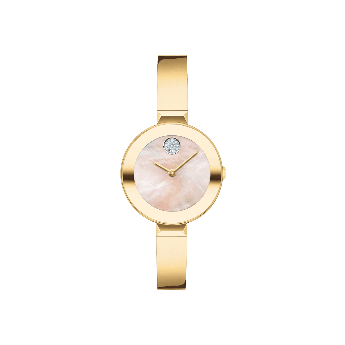 Movado BOLD, 28mm pale yellow gold ion-plated stainless steel case & bangle with a pale yellow gold toned mother-of-pearl top layer. Mother-of-Pearl dials may vary in color as each piece is unique making every watch one of a kind.