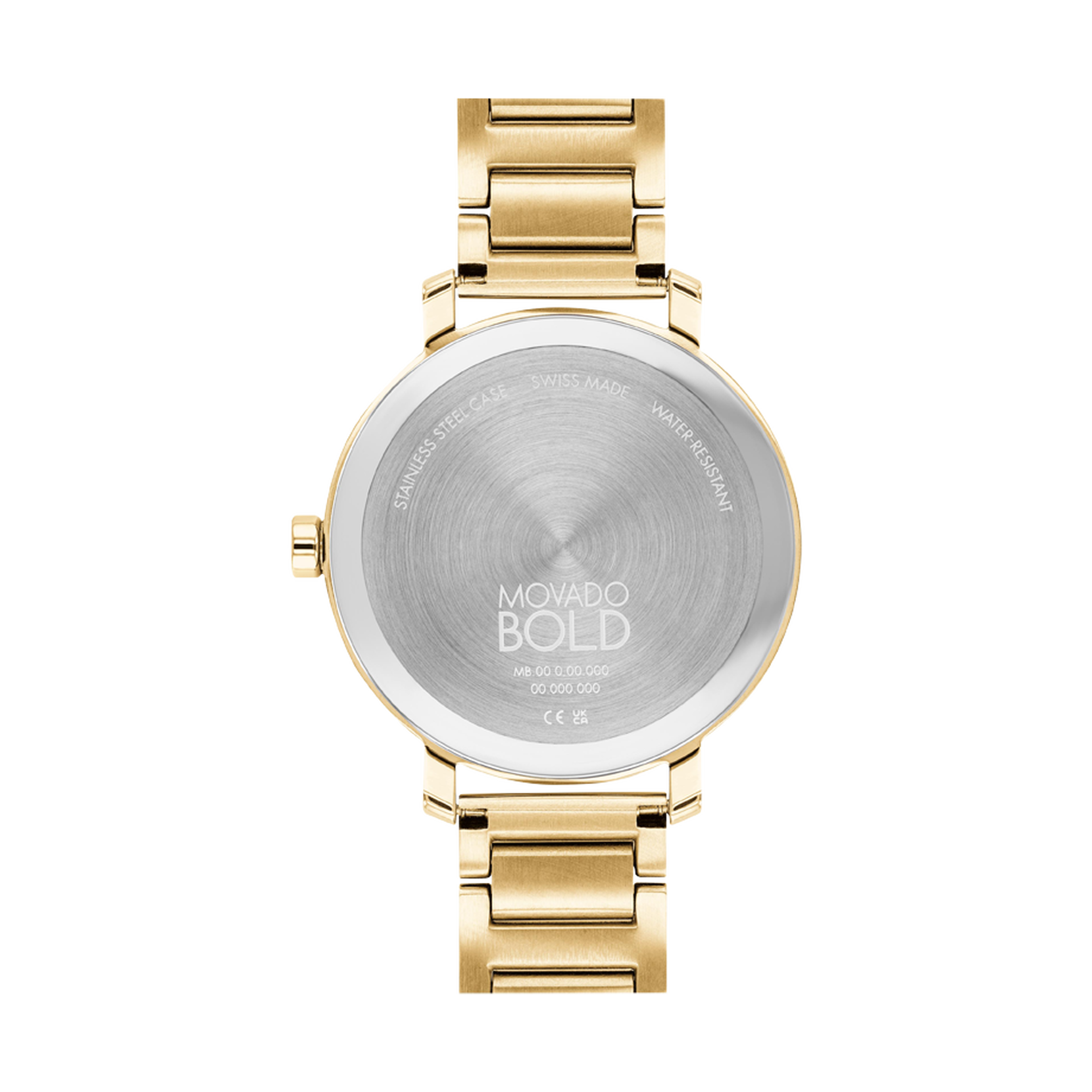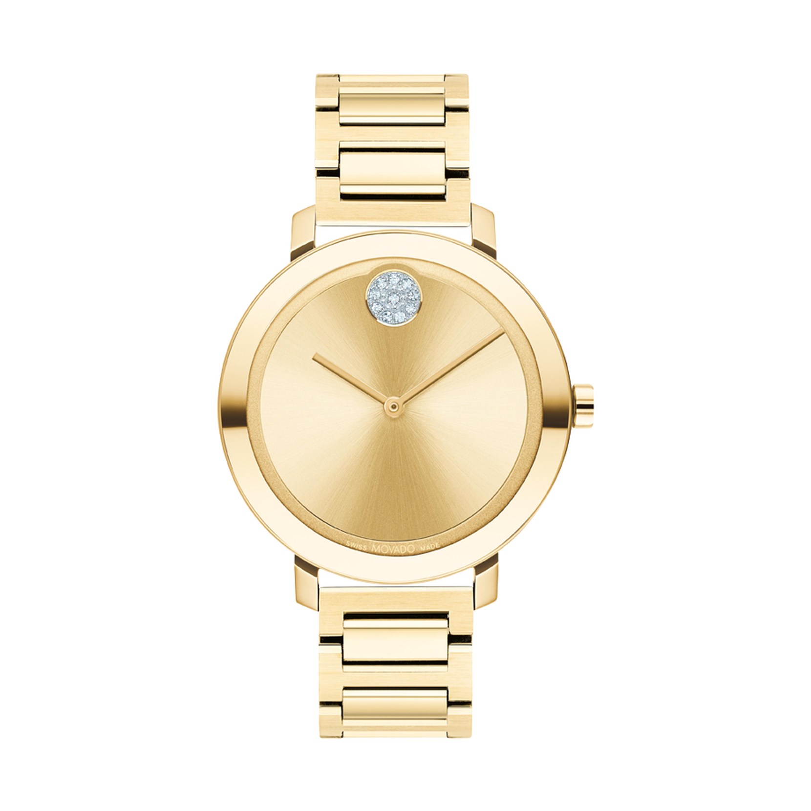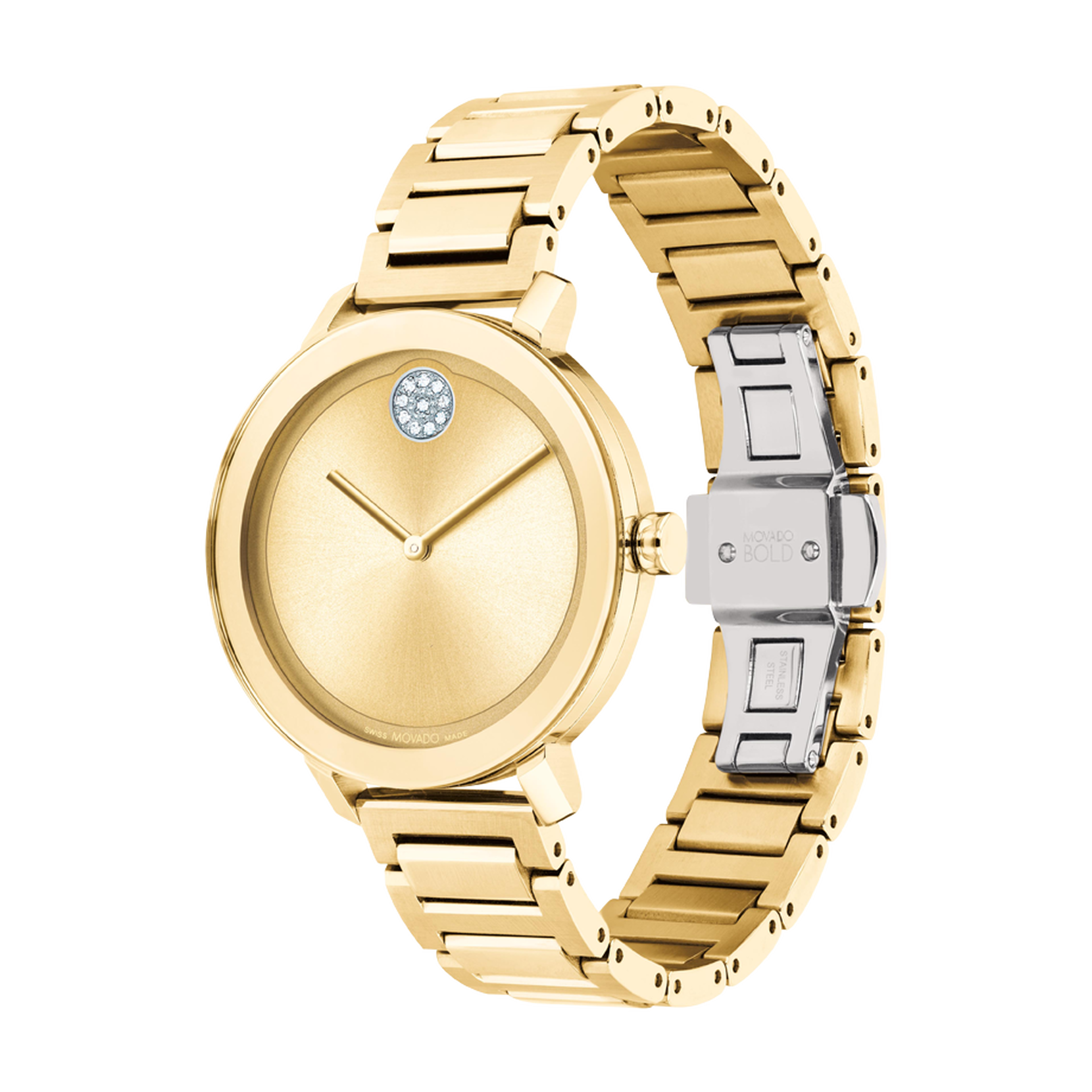 Movado BOLD Evolution, 34 mm pale yellow gold ion-plated stainless steel case and bracelet with a pale yellow gold-toned dial & crystal-set dot. Movado means ‘always in motion’ in the Esperanto language Was founded in Switzerland in 1881 by a 19 year-old entrepreneur Is recognized with 100 patents + 200...