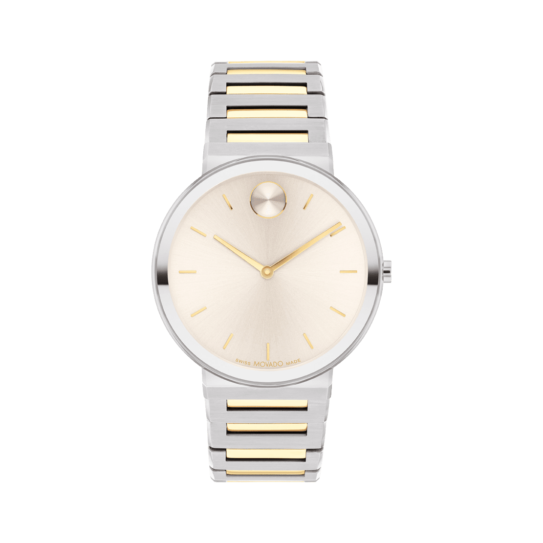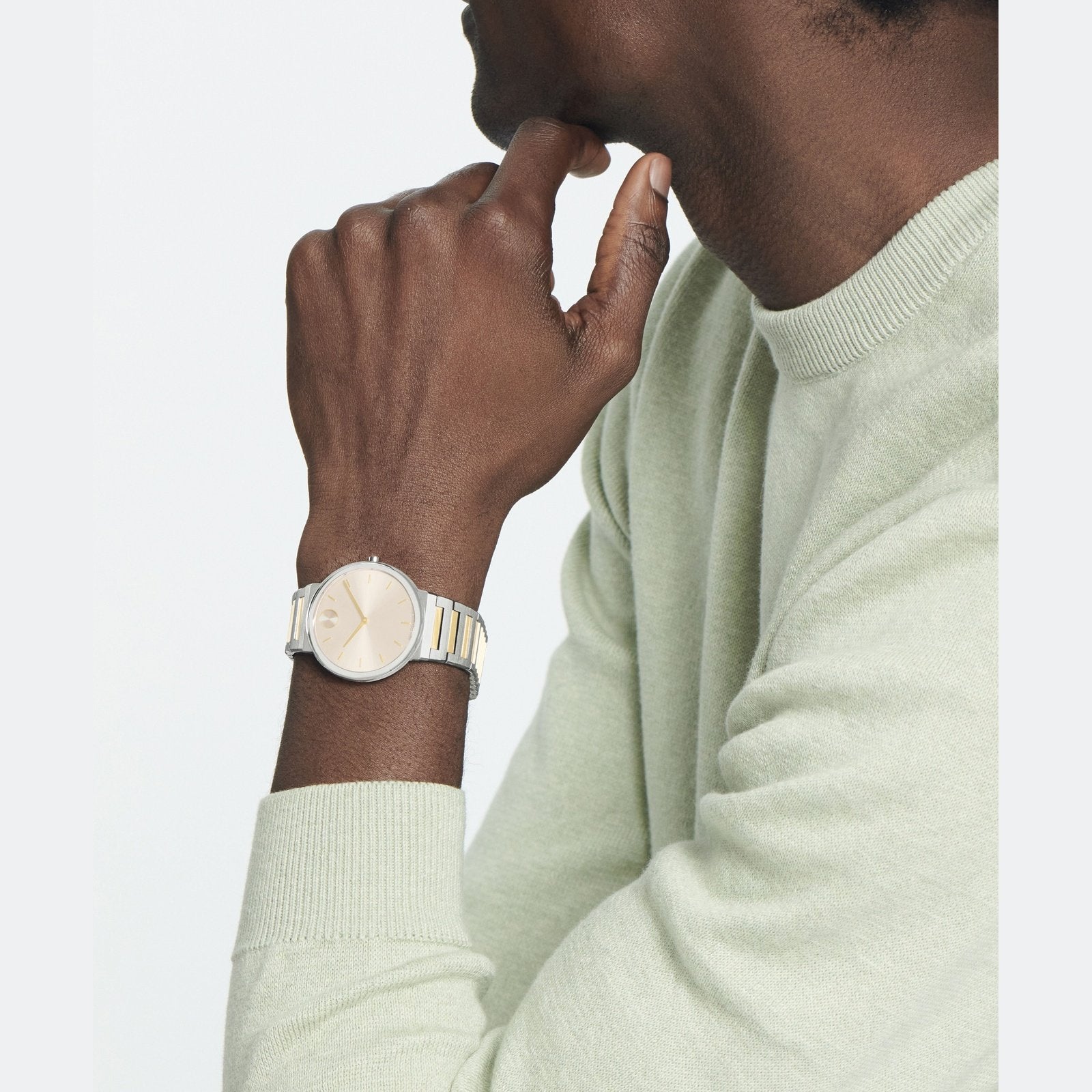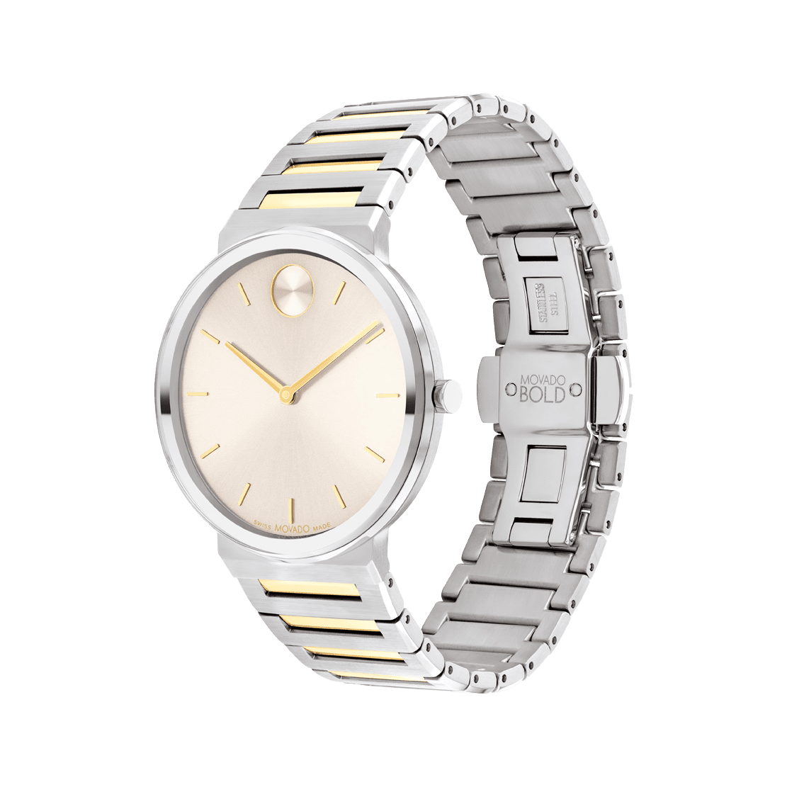 Refining sleek, contemporary style in an ultra-thin design. The 40mm case of this sophisticated watch is only 6.7mm thick, creating a super sleek silhouette. This two-tone timepiece is crafted from stainless steel and yellow gold ion-plated stainless steel. A matching Y-link bracelet and chalk dial with yellow gold-toned accents complete...
