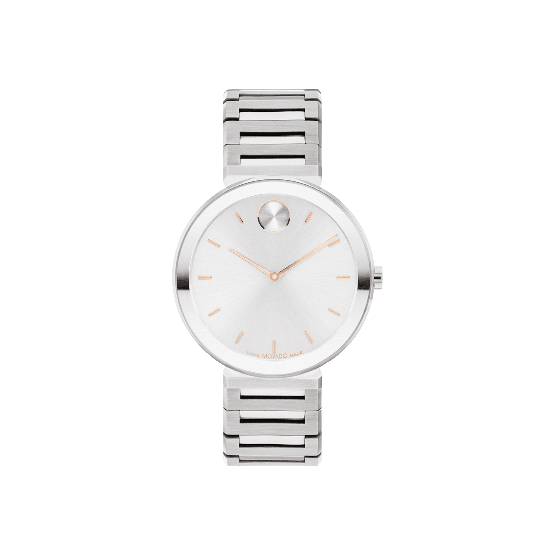Refining sleek, contemporary style in an ultra-thin design. The 34mm case of this sophisticated watch is only 6.5mm thick, creating a super sleek silhouette. This timepiece is crafted from shimmering stainless steel and features a matching Y-link bracelet and tonal dial with pale rose gold-toned accents.