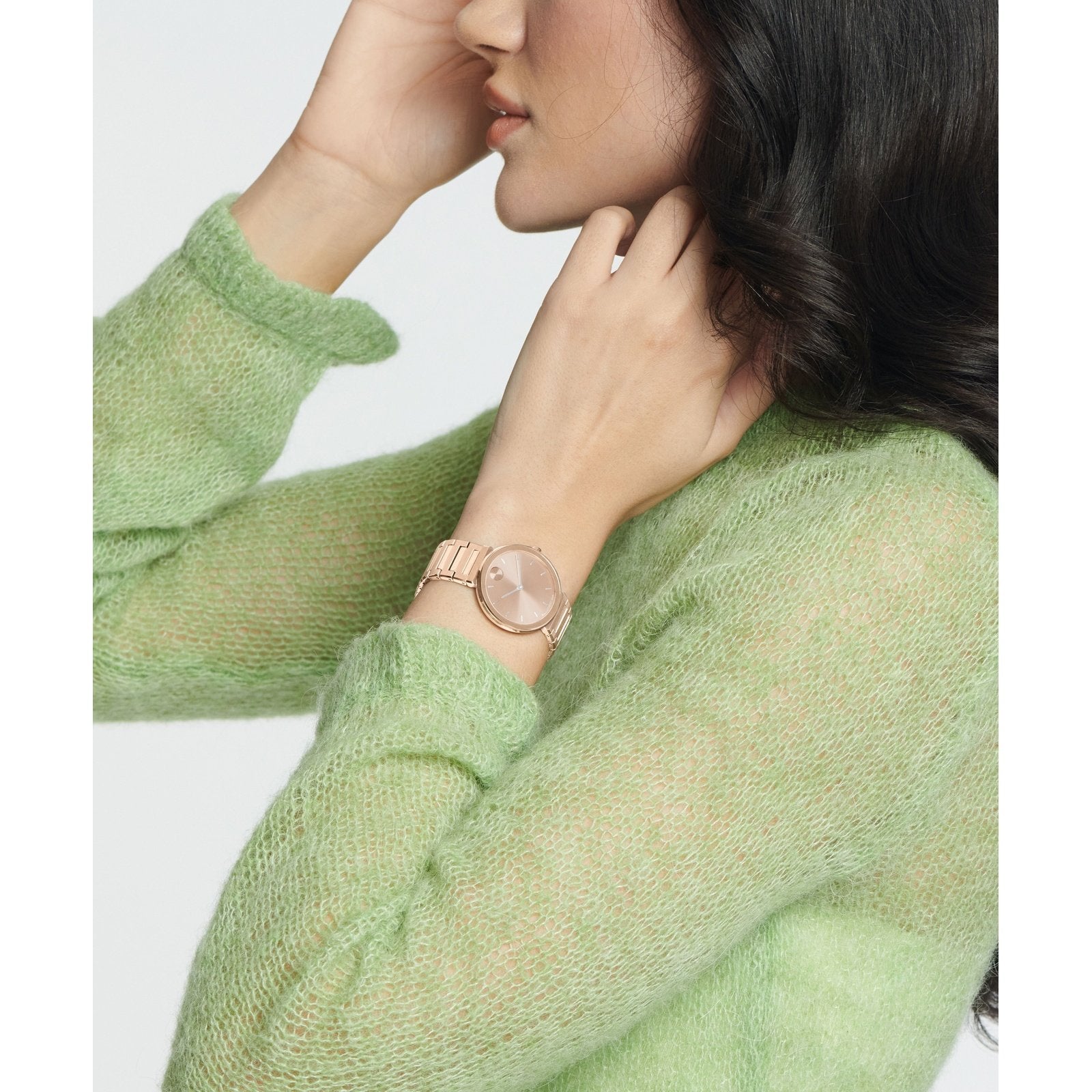 Refining sleek, contemporary style in an ultra-thin design. The 34mm case of this sophisticated watch is only 6.5mm thick, creating a super sleek silhouette. This timepiece is crafted from pale rose gold ion-plated stainless steel and features a matching Y-link bracelet and tonal dial with stainless steel accents.