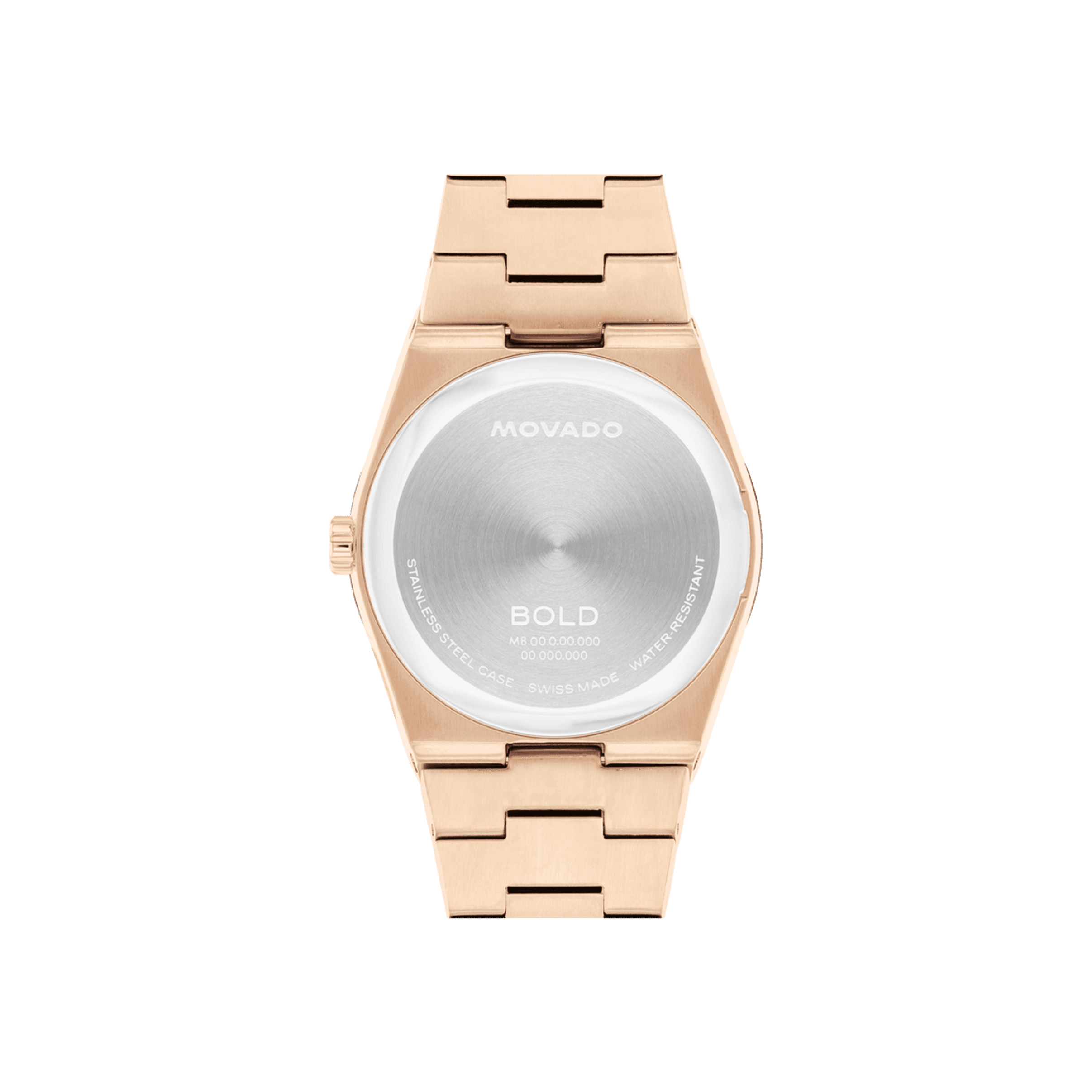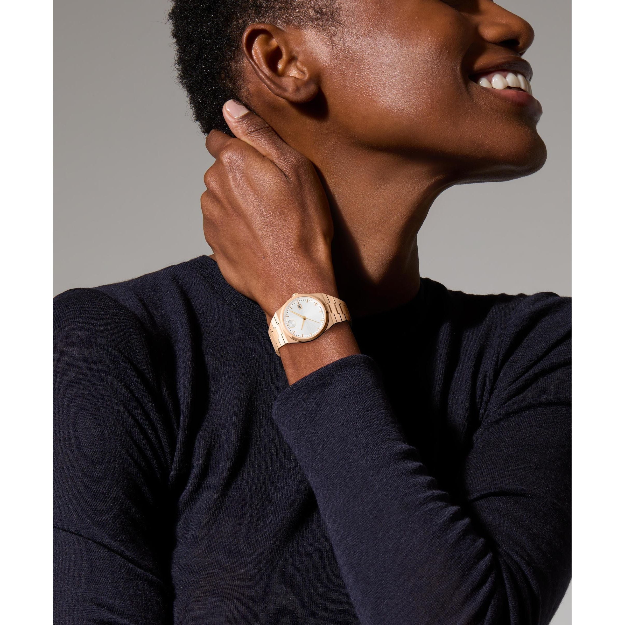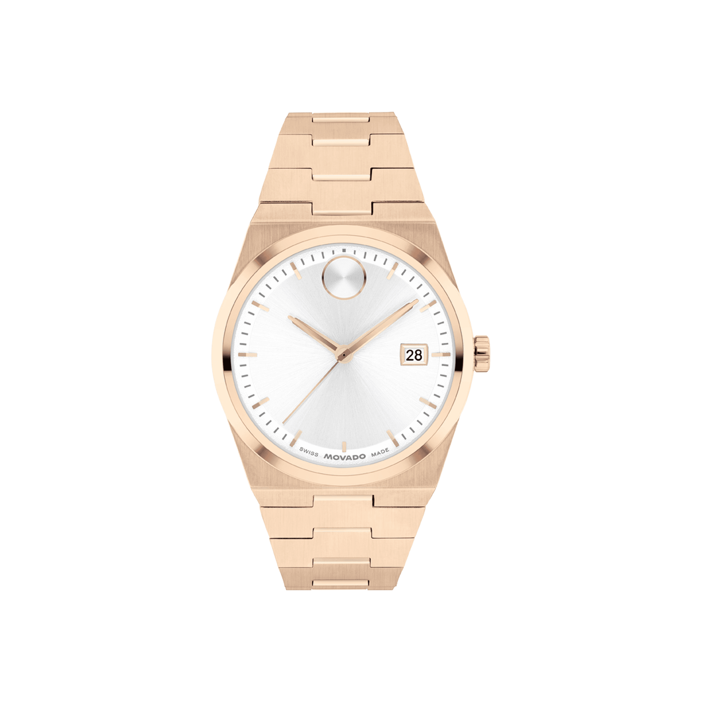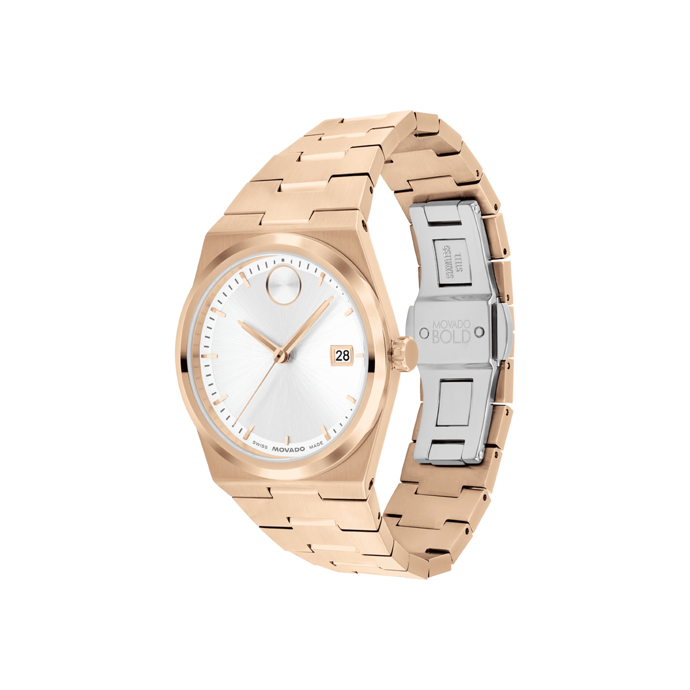 Expertly designed with a shaped case and an integrated bracelet, the BOLD Quest watch takes style to the next level. Boasting a white dial, rose gold tone hands, and our iconic dot at 12 o'clock, this 35mm timepiece exudes elegance and sophistication. Embrace the future of fashion with BOLD Quest.