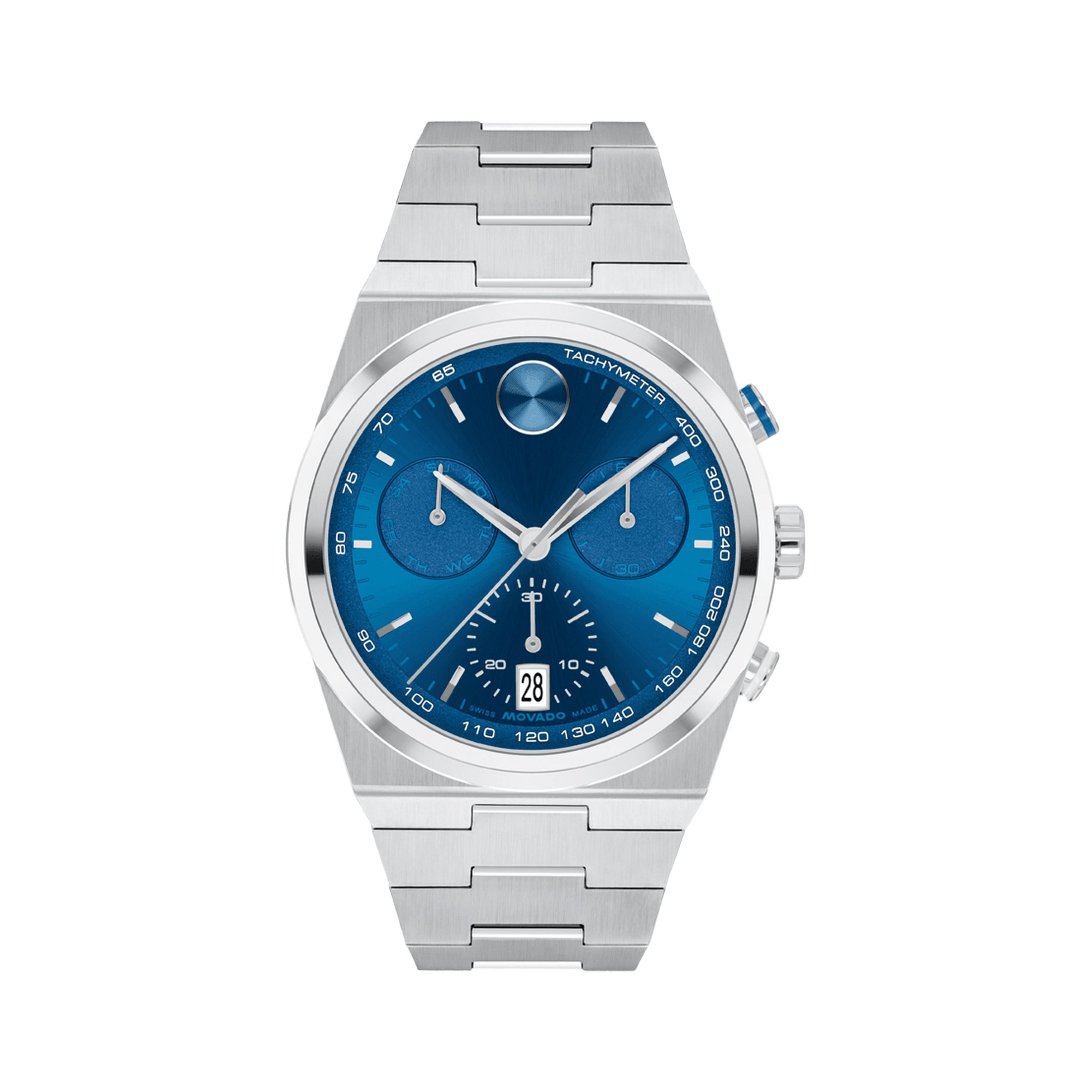 The BOLD Quest Chronograph offers a modern design with a uniquely shaped case and integrated bracelet. This 42mm chronograph boasts a sleek blue dial with satin-finish subdials, stainless steel hands, and the recognizable dot at 12 o'clock. Keep track of time with precision and style.