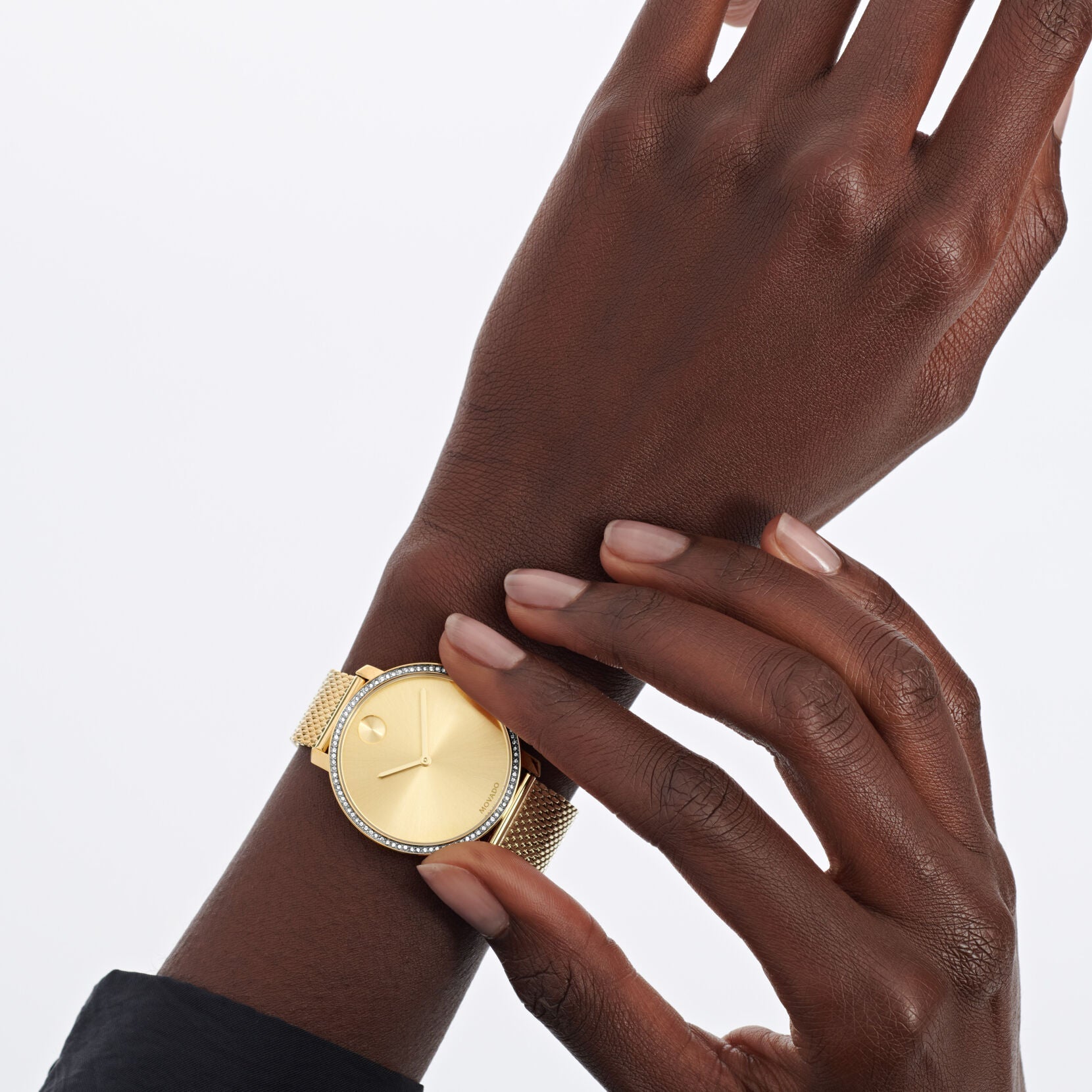 Movado BOLD, 34 mm pale yellow gold ion-plated stainless steel case and mesh bracelet with a pale yellow gold-toned dial & a crystal pave bezel. Movado Facts: Movado means ‘always in motion’ in the Esperanto language Was founded in Switzerland in 1881 by a 19 year-old entrepreneur Is recognized with...