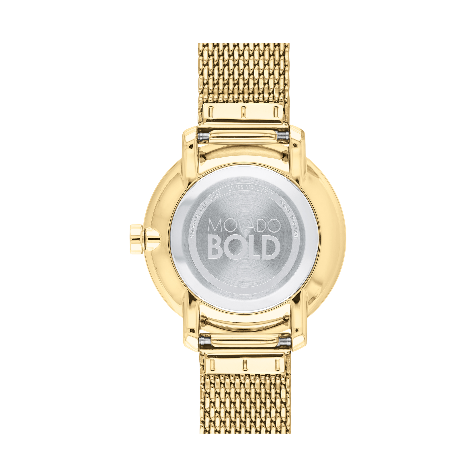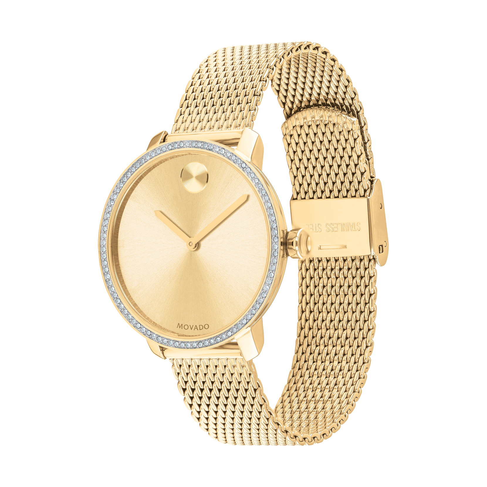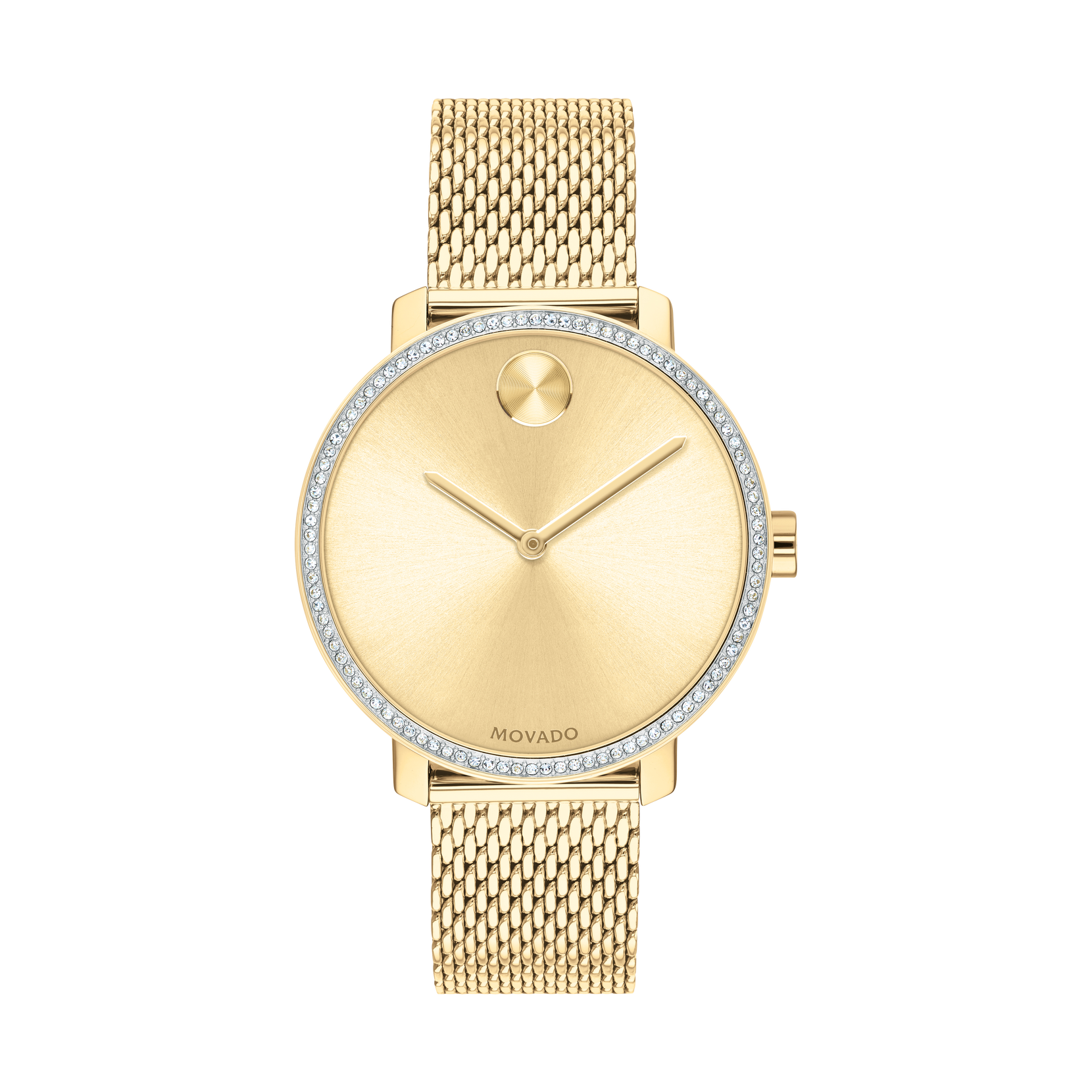 Movado BOLD, 34 mm pale yellow gold ion-plated stainless steel case and mesh bracelet with a pale yellow gold-toned dial & a crystal pave bezel.