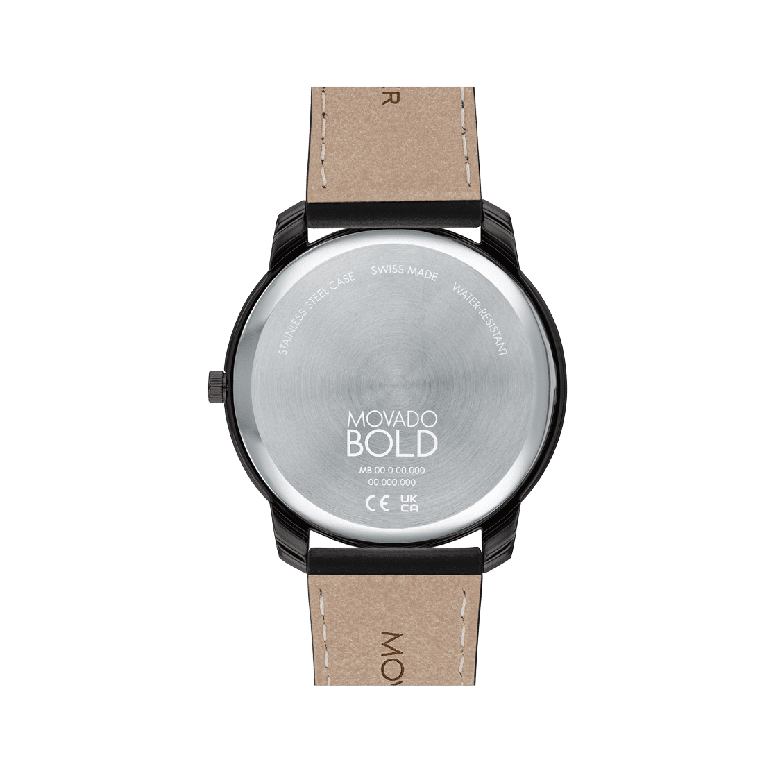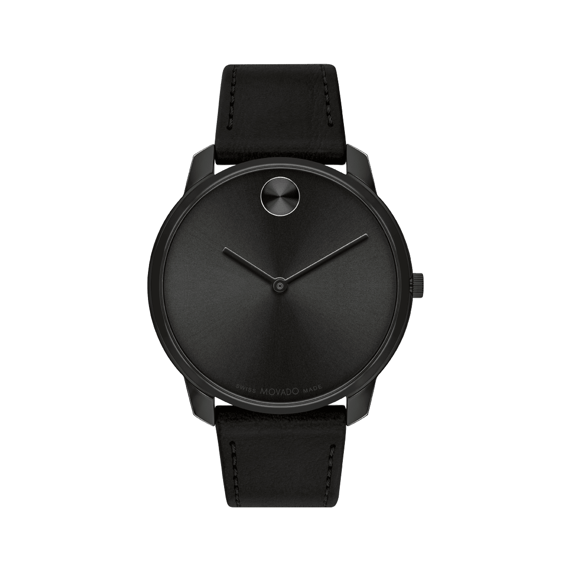 Go to the shopMovado BOLD, 42 mm black ion-plated stainless steel case with a black-toned dial on black leather strap.