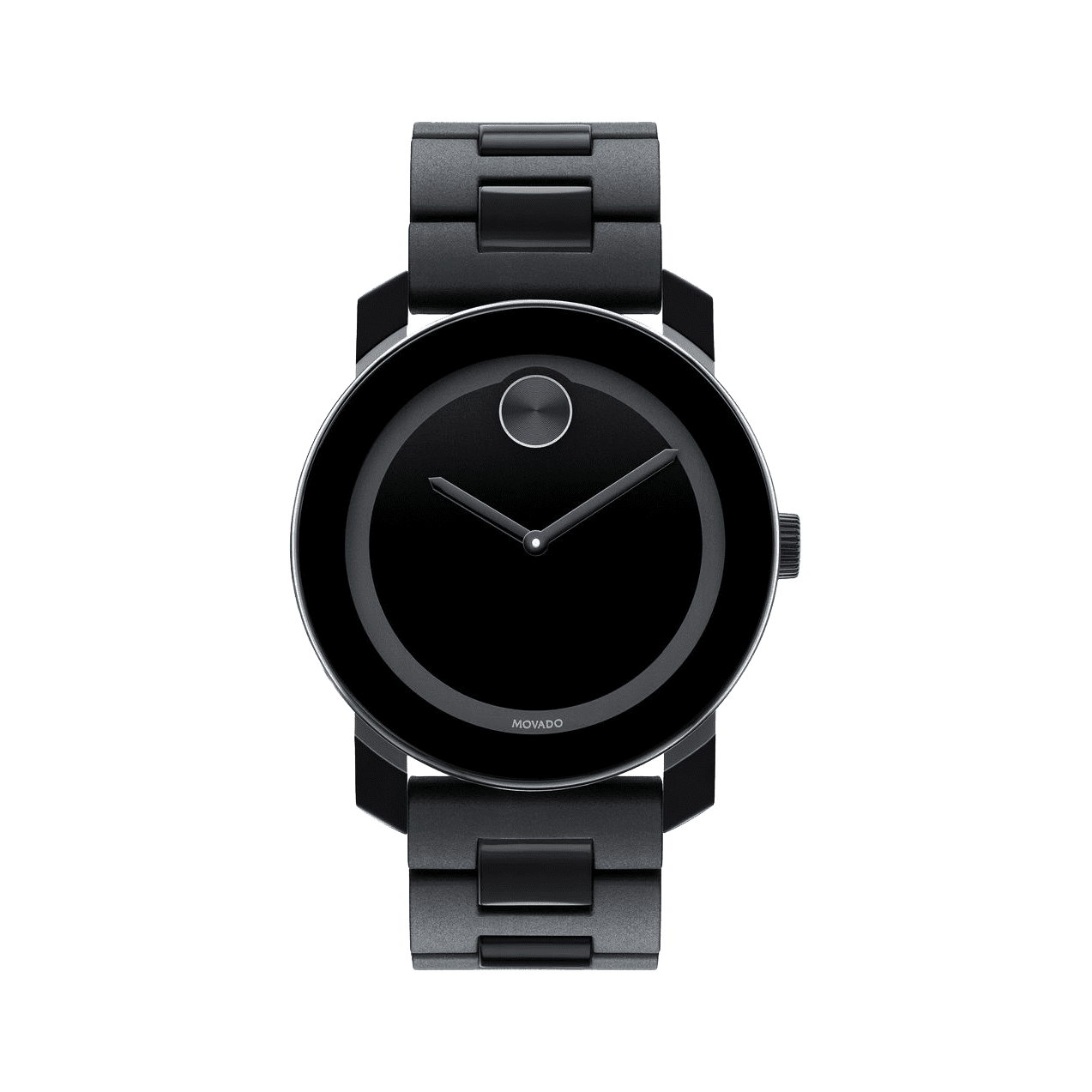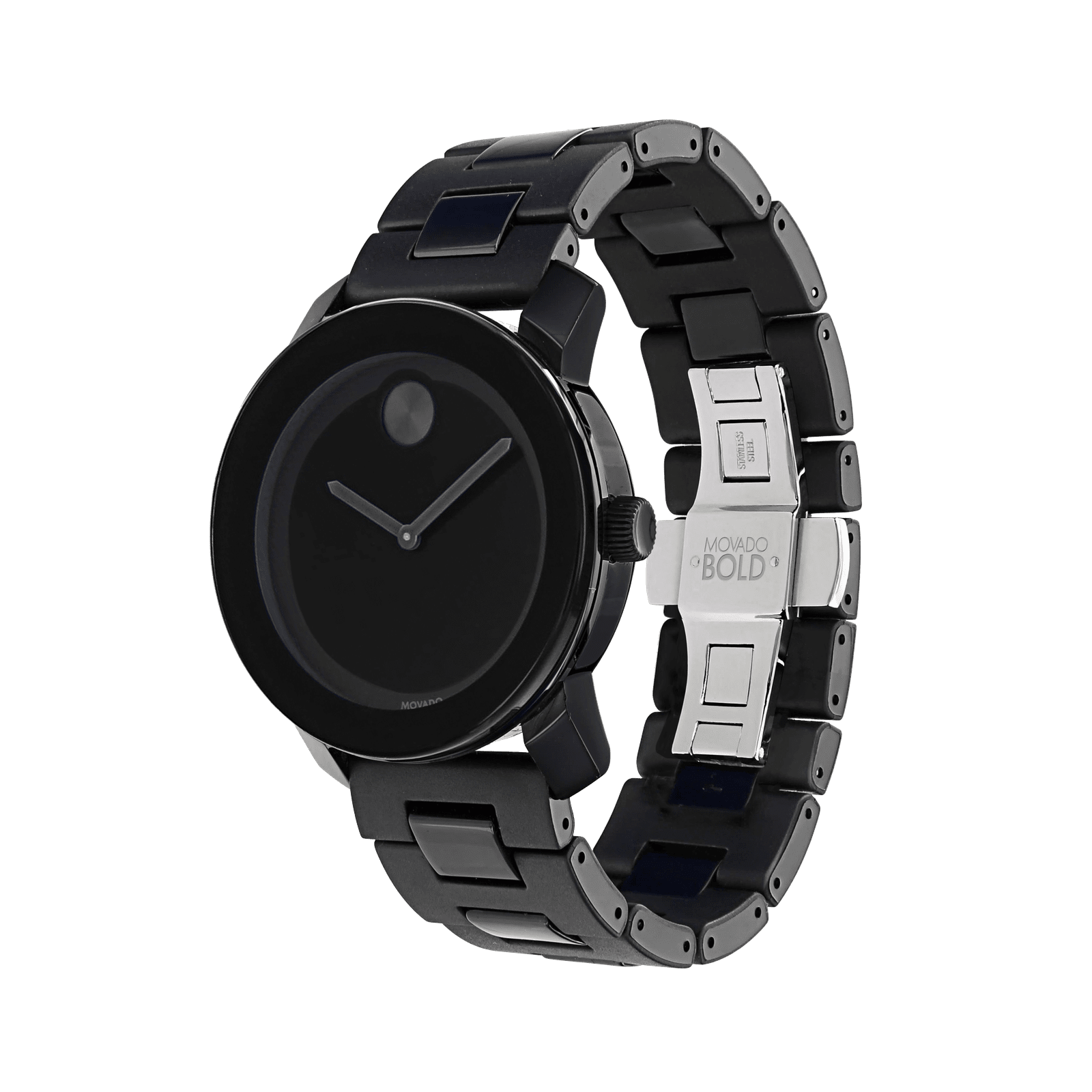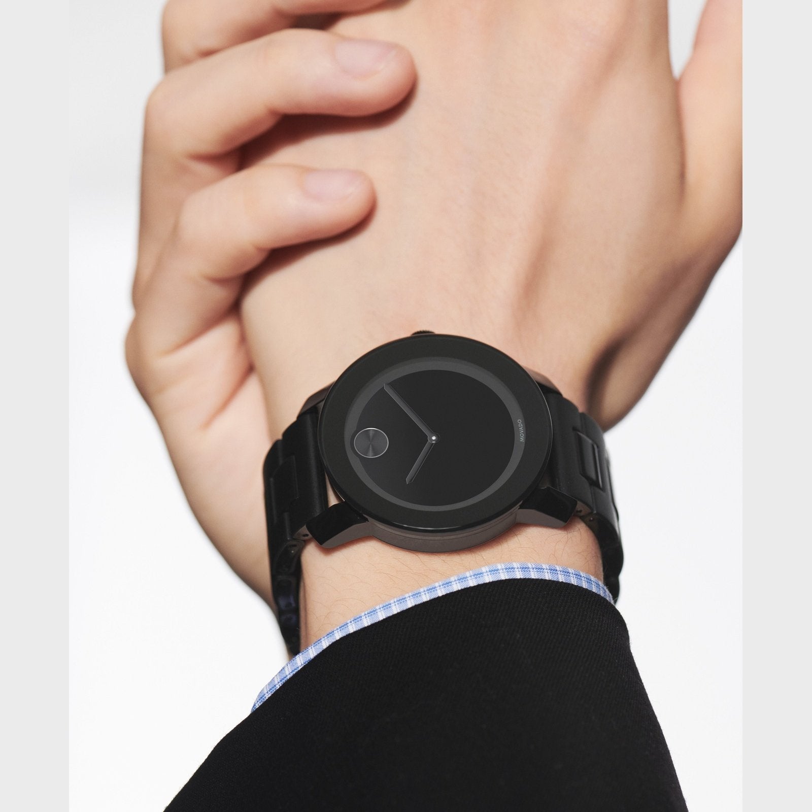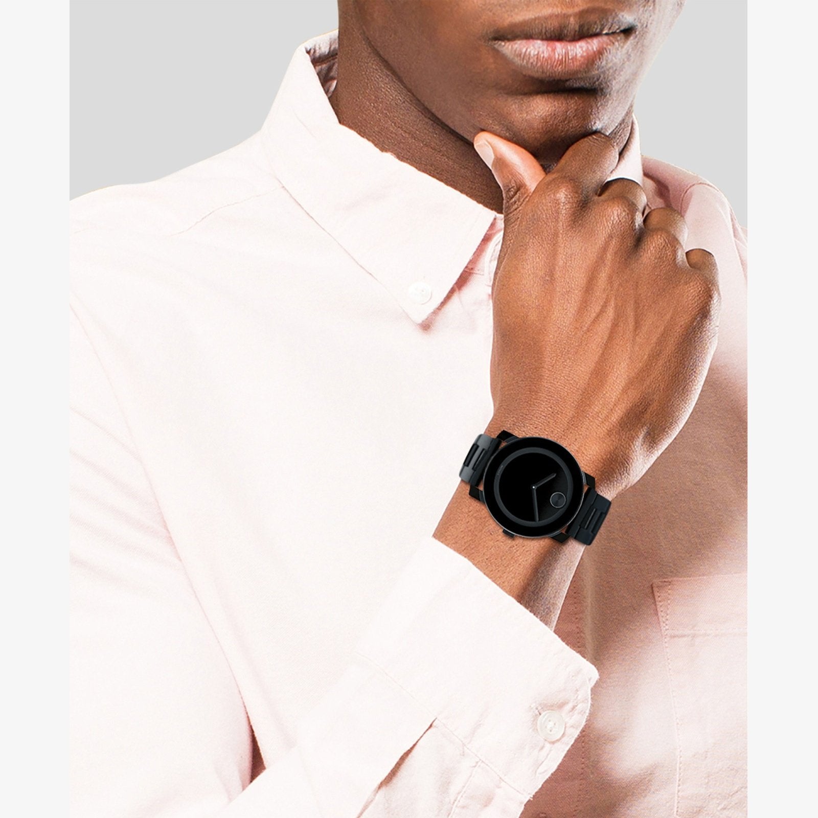 Large Movado BOLD watch, 42 mm black TR90 composite material and stainless steel case, black dial with matching sunray dot and hands, black TR90, black polyurethane and stainless steel link bracelet with deployment clasp.