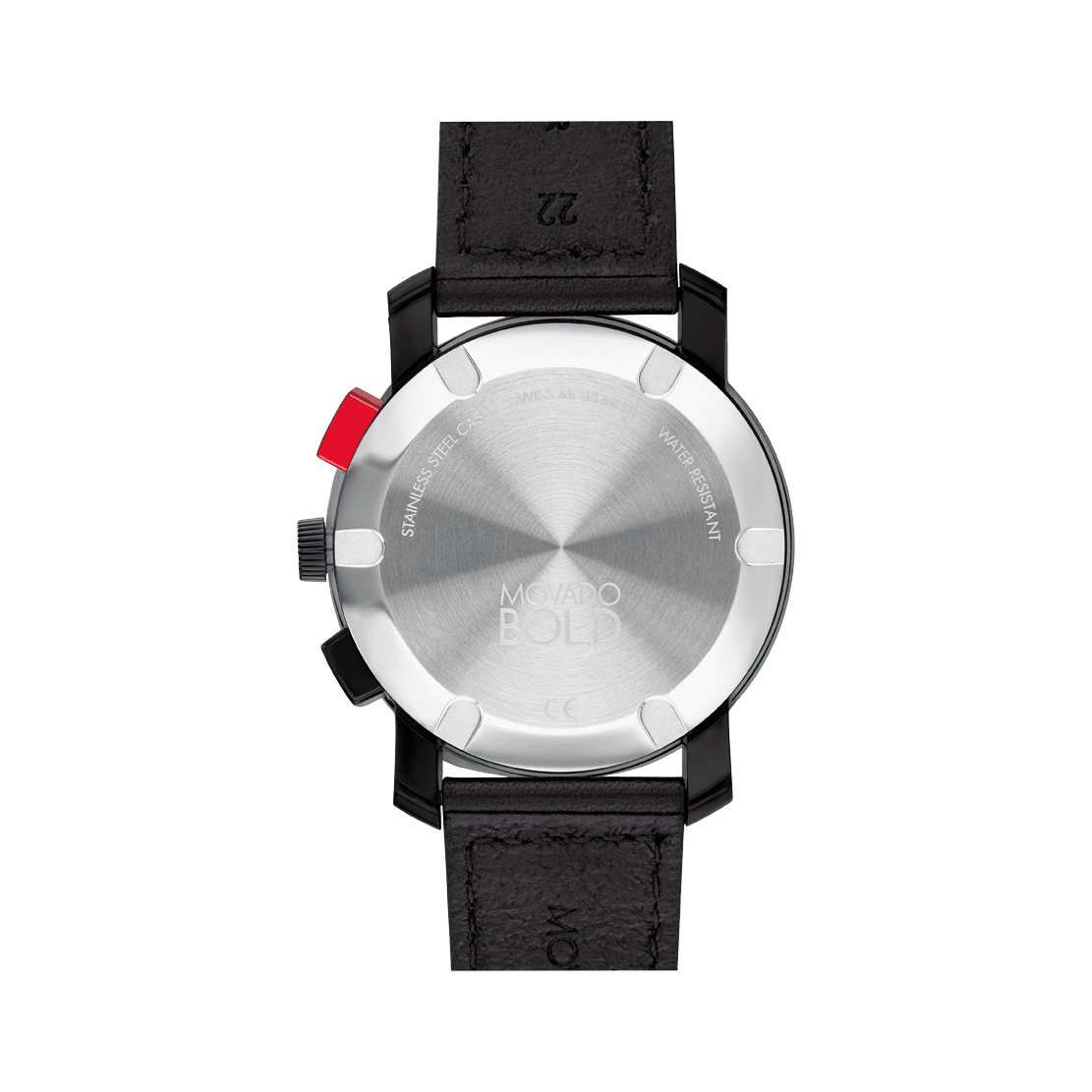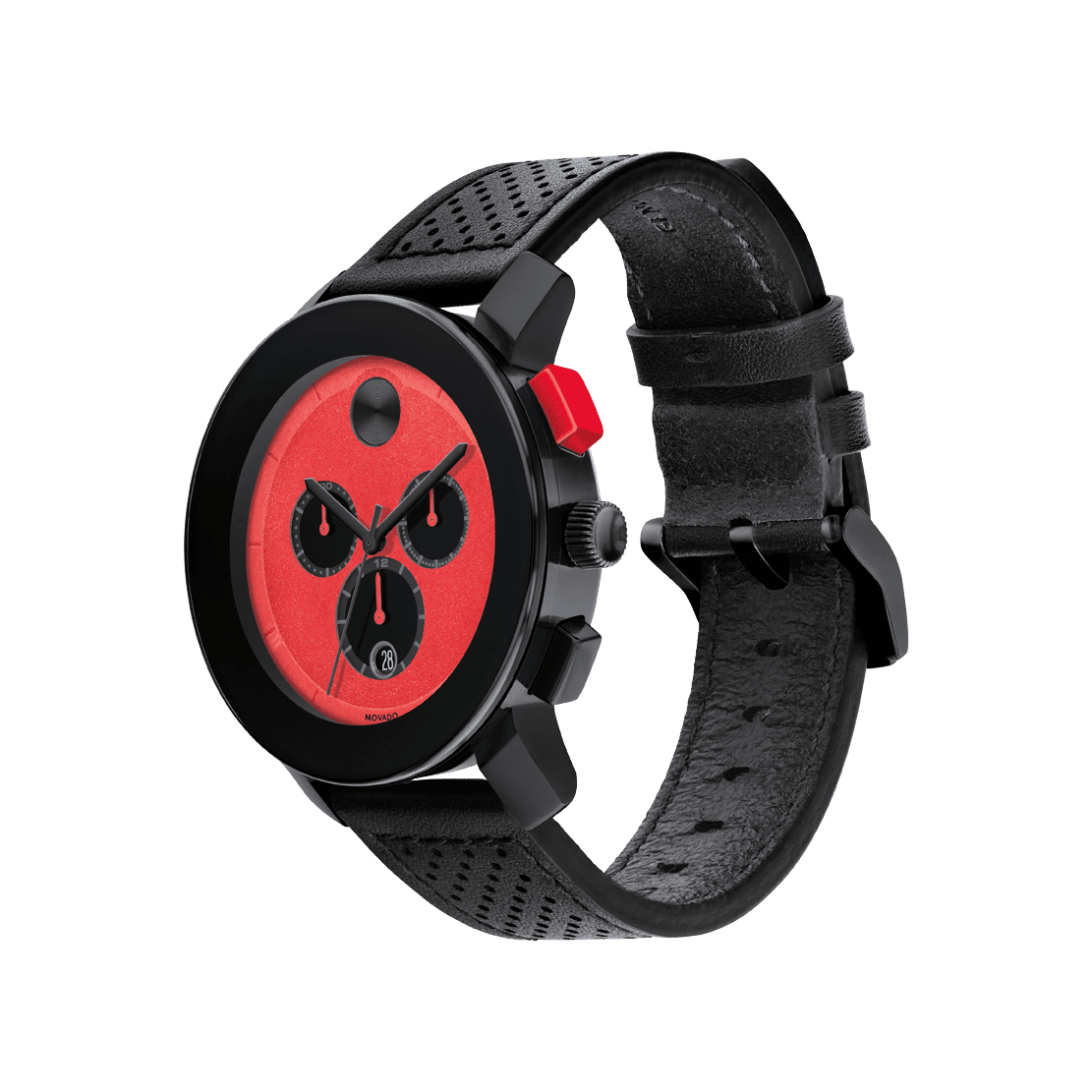 Go to the shopMovado BOLD TR90 Chronograph, 43.5mm Black TR90 composite material and stainless steel case, sporty red dial with black sunray dot and hands on a black perforated leather strap.