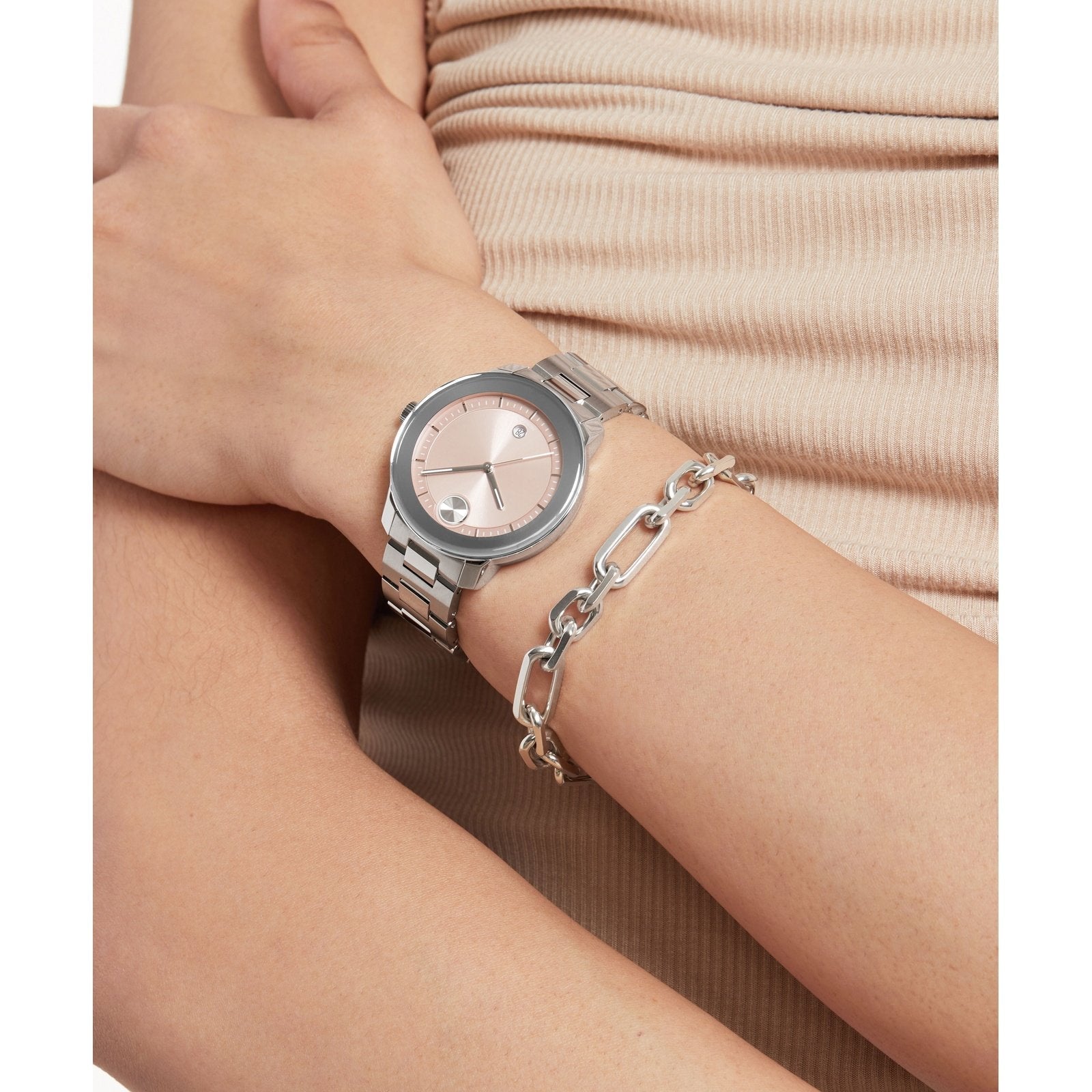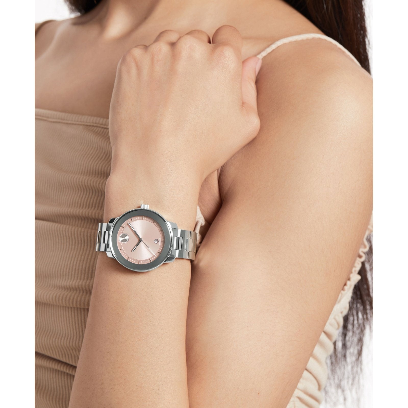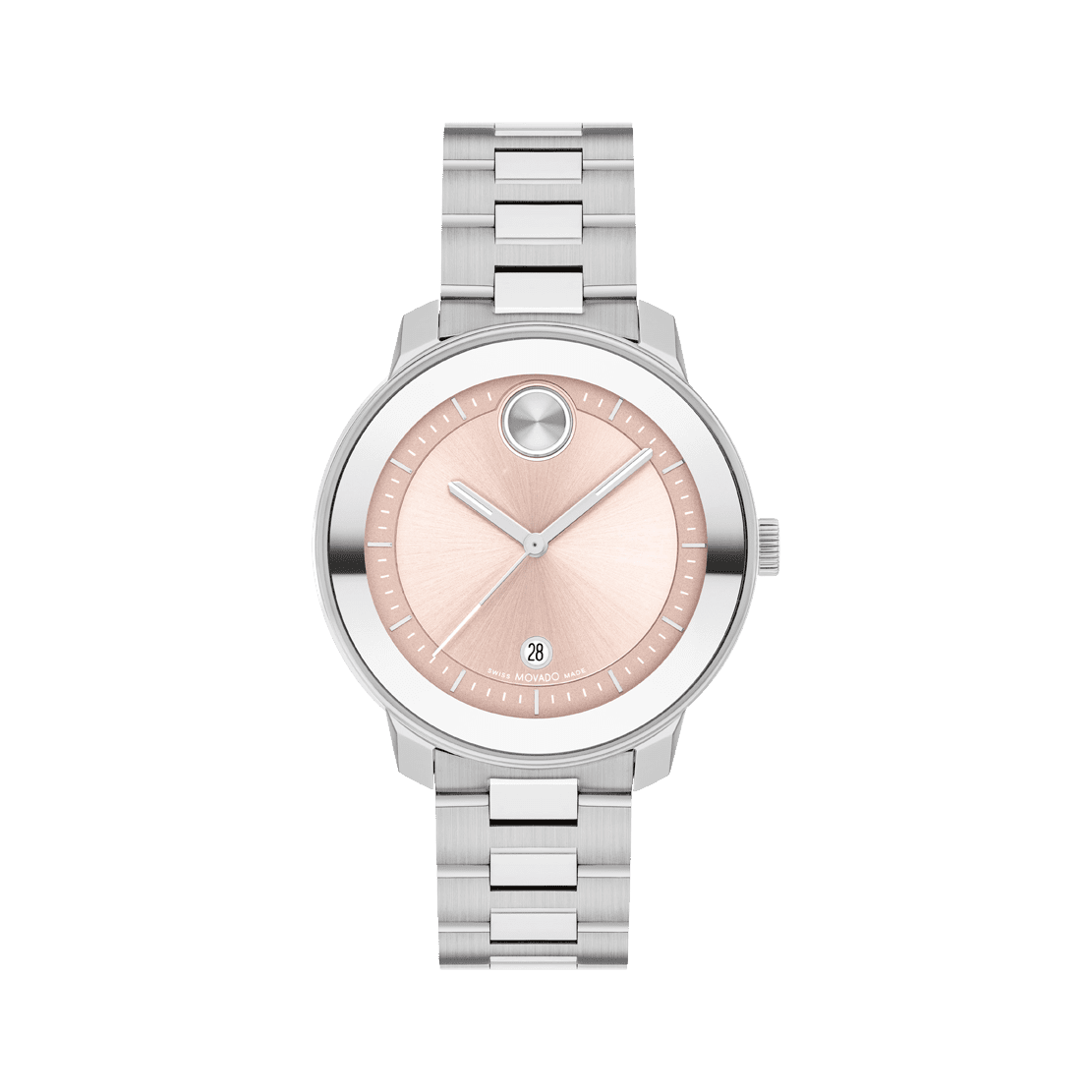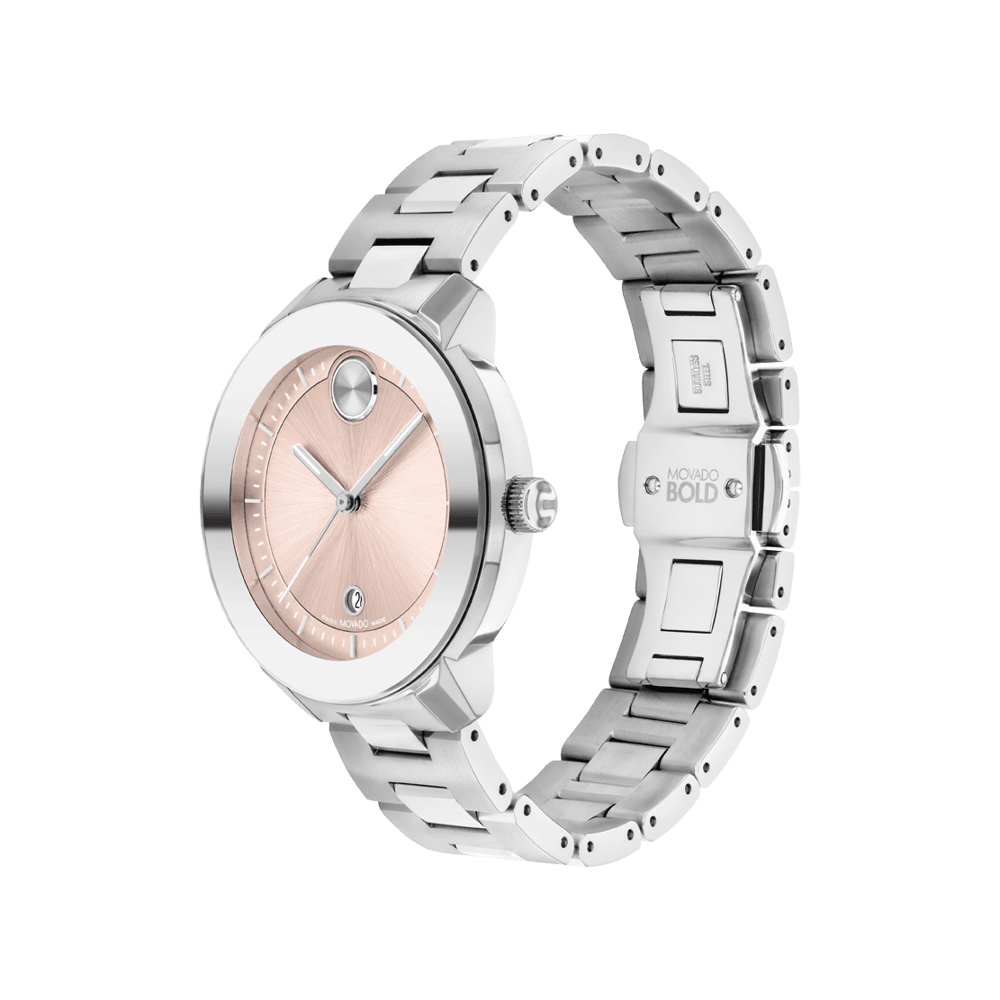 Fresh, modern design with a sporty edge. Crafted from sleek stainless steel, this 38mm watch boasts a feminine blush dial with a matching minute track and a date window. Stainless steel hands and our iconic dot at 12 o’clock complete this contemporary-chic design.