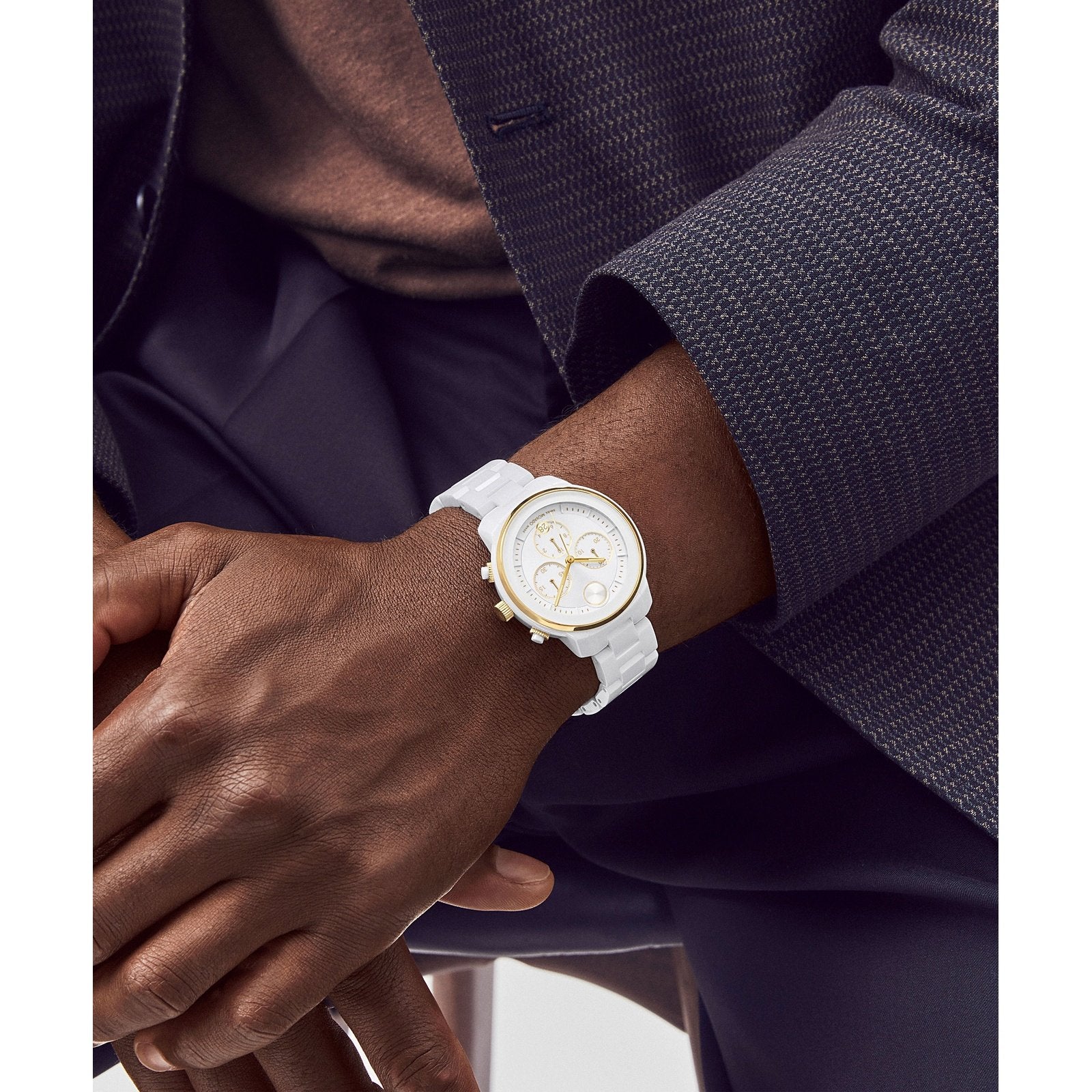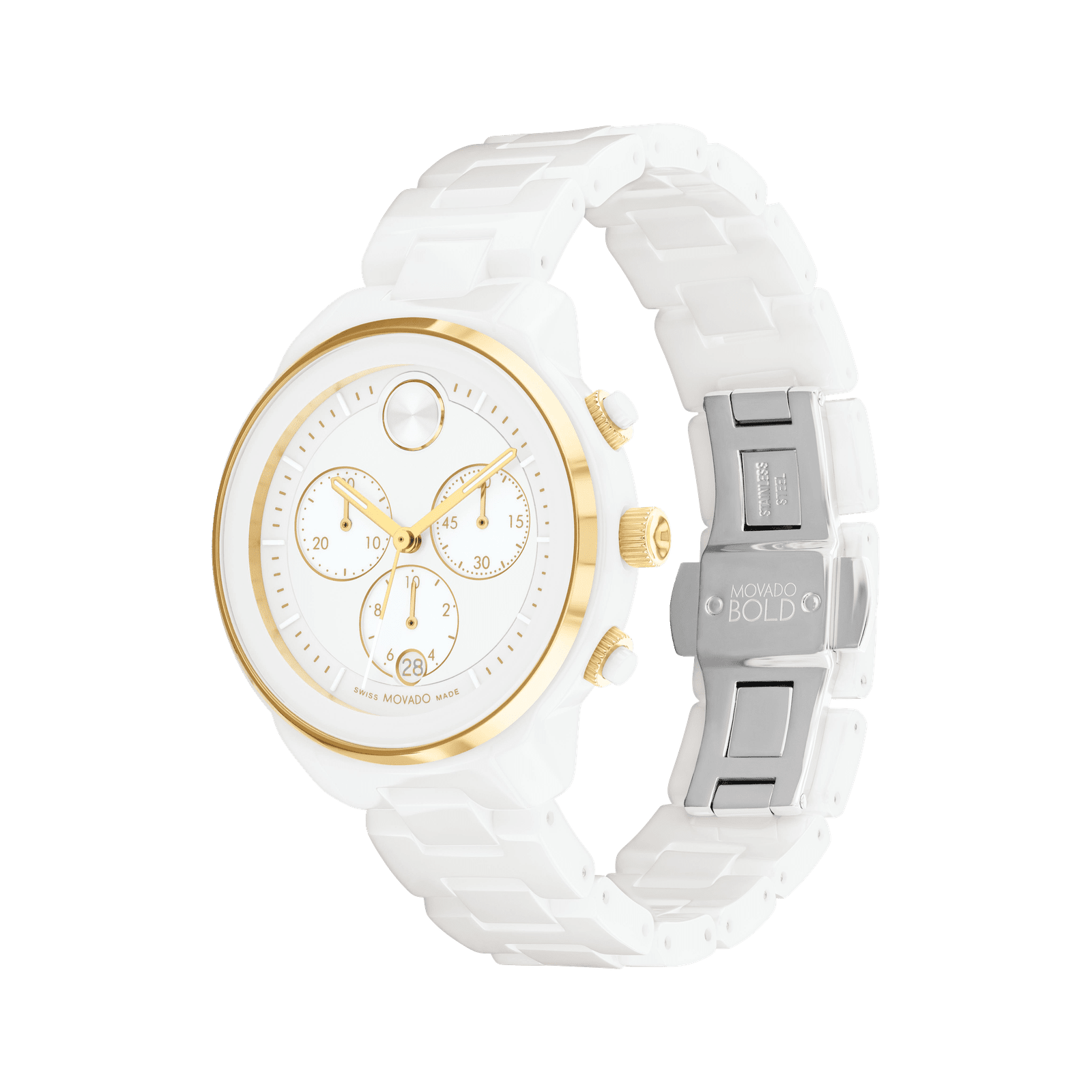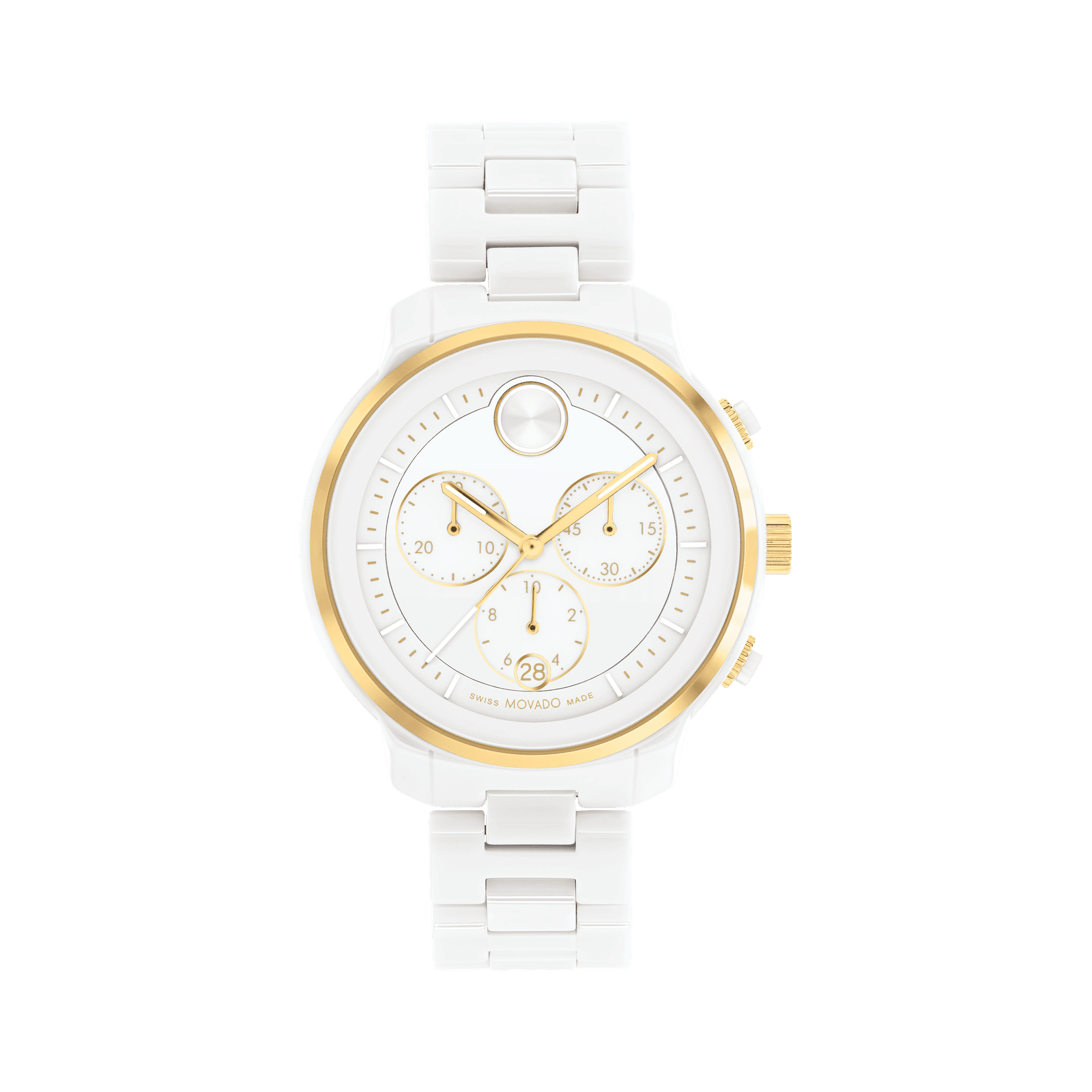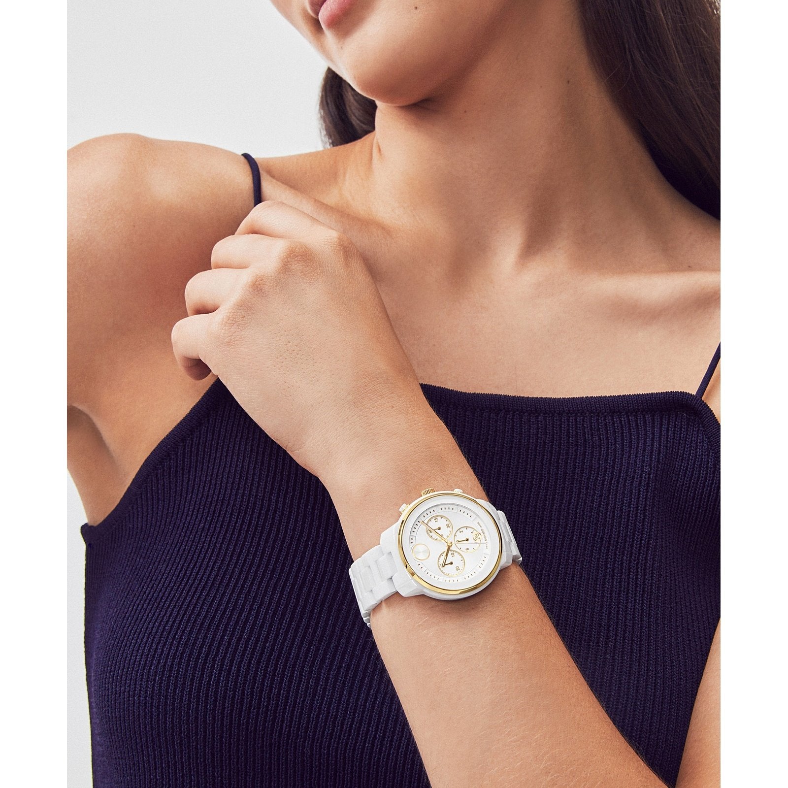 The sporty, eternally chic chronograph gets fresh feel with striking contemporary design that combines modern minimalism and a bold edge. The classic bracelet and statement-making 40mm case are crafted from bright white ceramic for a flawlessly refined finish. The matching white chronograph dial features three subdials, a date window with...