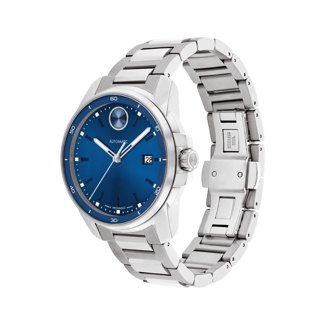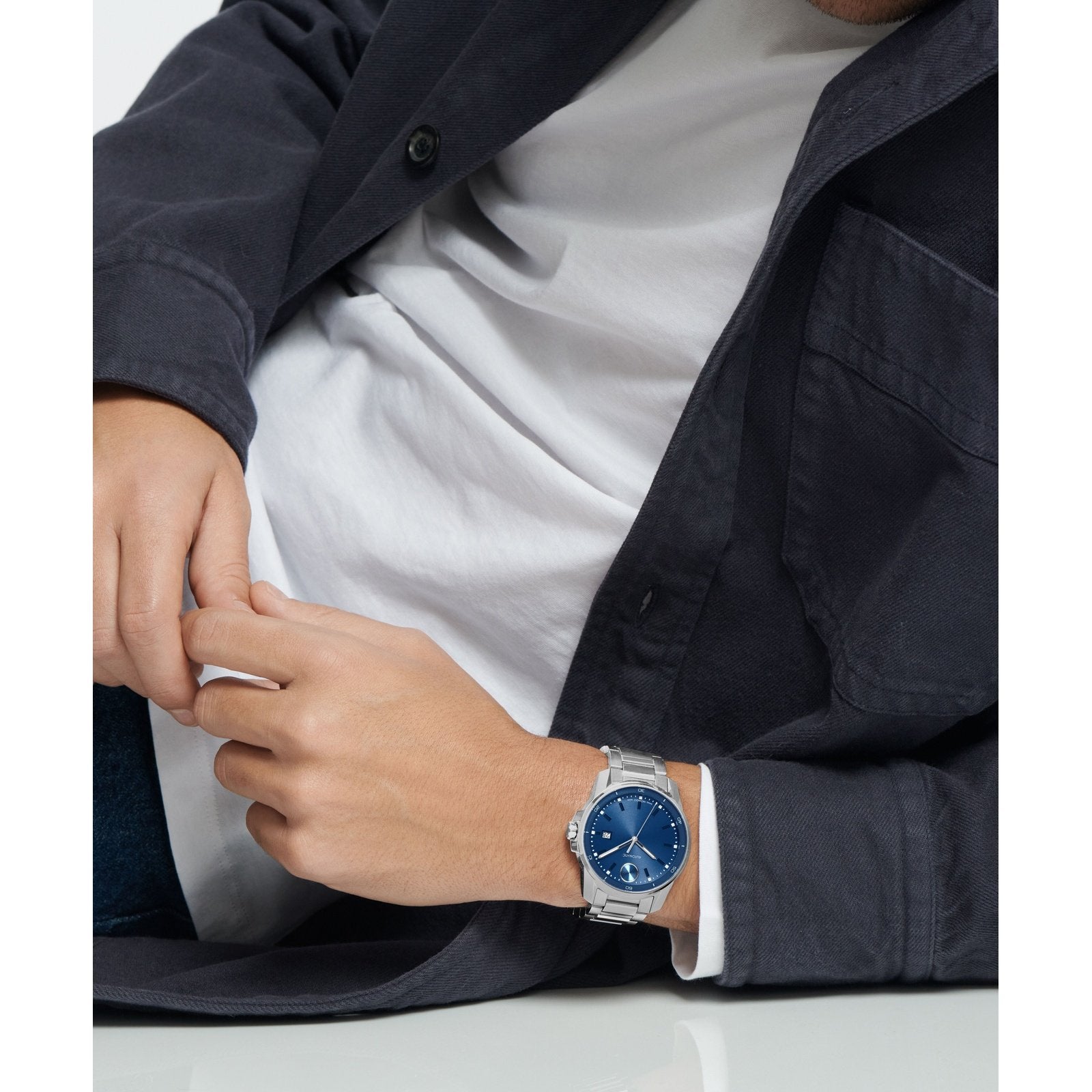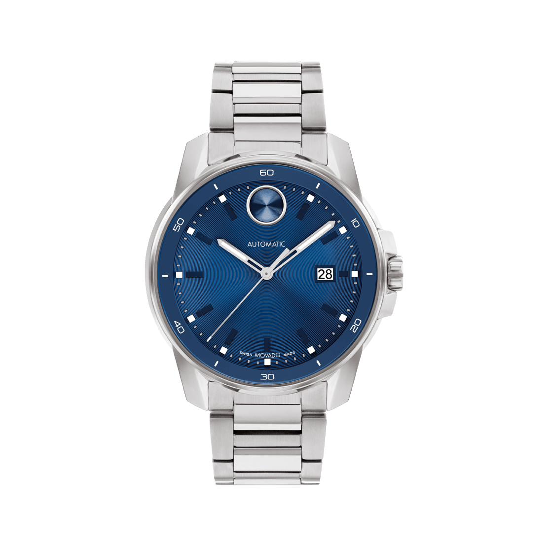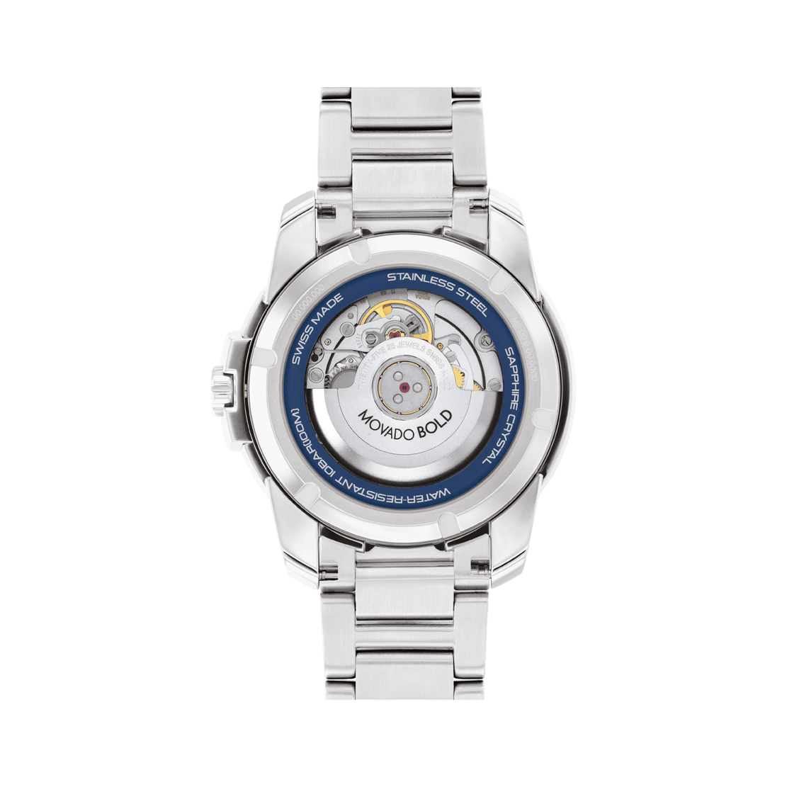 Sporty, ultra-modern design, powered by you. Crafted from rugged stainless steel, this timepiece boasts a 43mm case, blue dial with a date window and Swiss Super-LumiNovaᆴ accents. This contemporary-cool design features a self-winding movement driven by the motion of your wrist with no need for batteries, displayed with an exhibition...