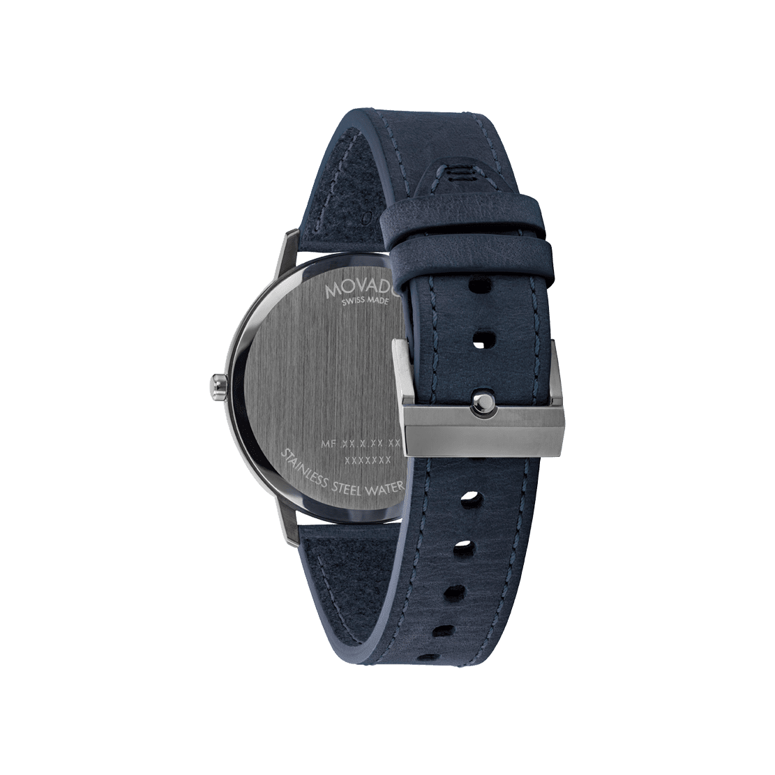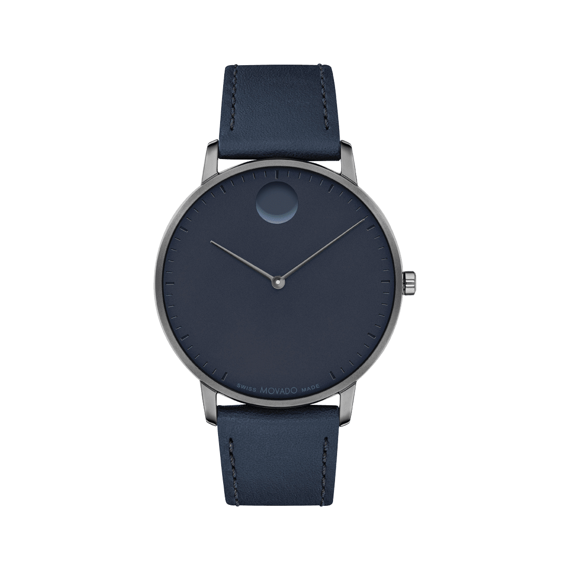 Go to the shopMovado Face, 41mm grey ion-plated stainless steel case with a navy dial on a navy leather strap.