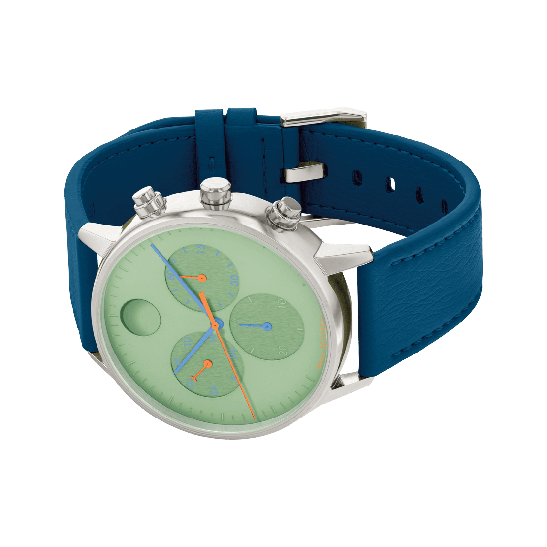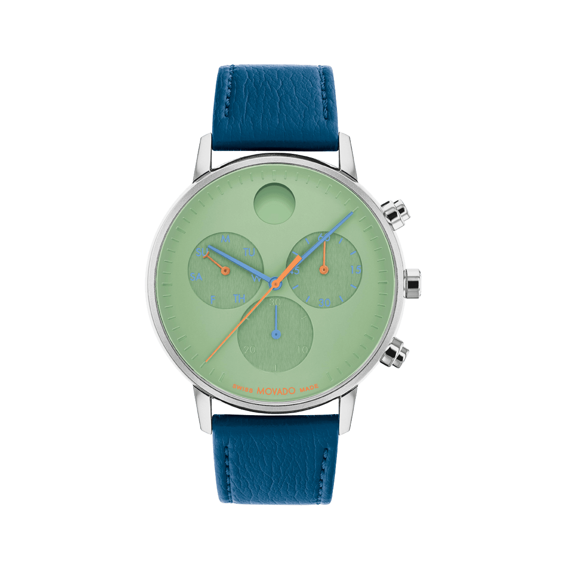 A fresh, fun take on ultra-modern, hyper-minimalist design. Add a pop of color to any look with this vibrant Face chronograph. Its 43mm ion-plated stainless steel case houses a fern dial with blue and apricot accents, slim hands, three subdials and a recessed dot at 12 o’clock. We’ve paired it...