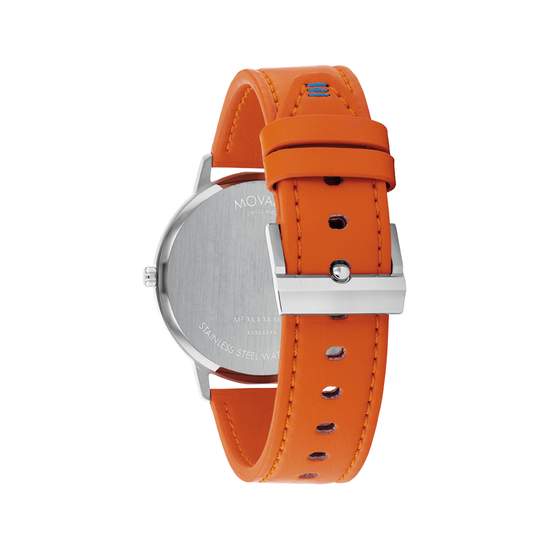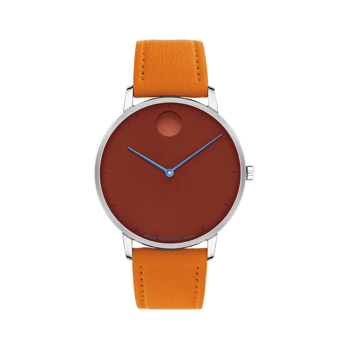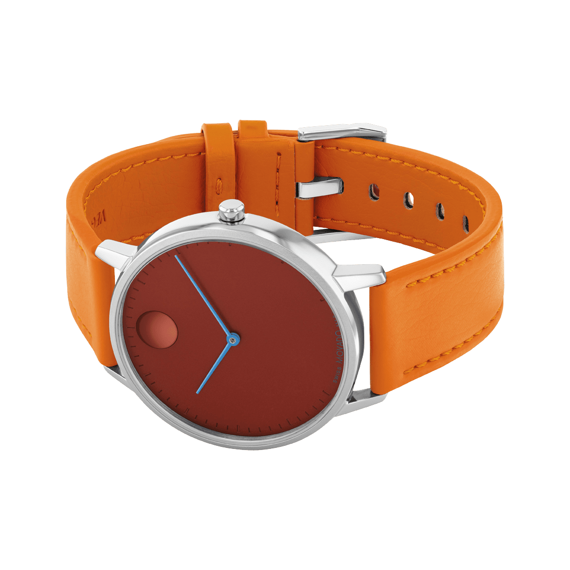 A fresh, fun take on ultra-modern, hyper-minimalist design. Add a pop of color to any look with this vibrant Face watch. Its 41mm stainless steel case houses a warm red dial with slim blue hands and a recessed dot at 12 o’clock. We’ve paired it with a bright orange strap...