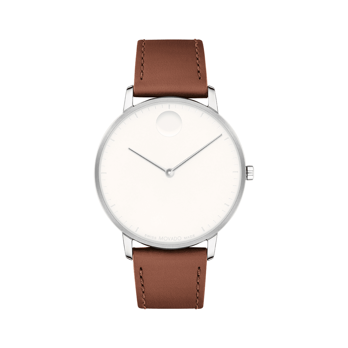 Movado Face, 41mm stainless steel case, white dial, stainless steel hands on a cognac leather strap.