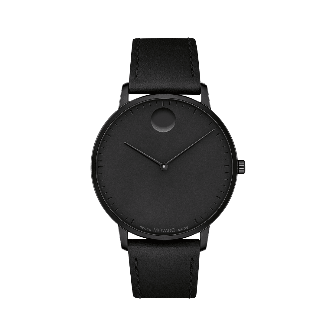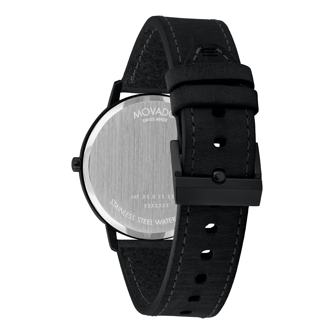 Movado Face, 41mm black ion-plated stainless steel case with a black dial on a black leather strap