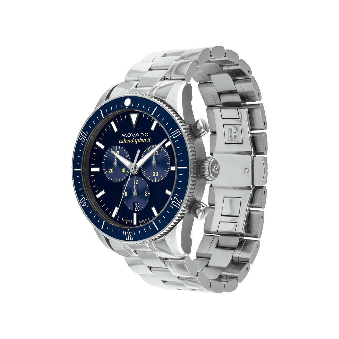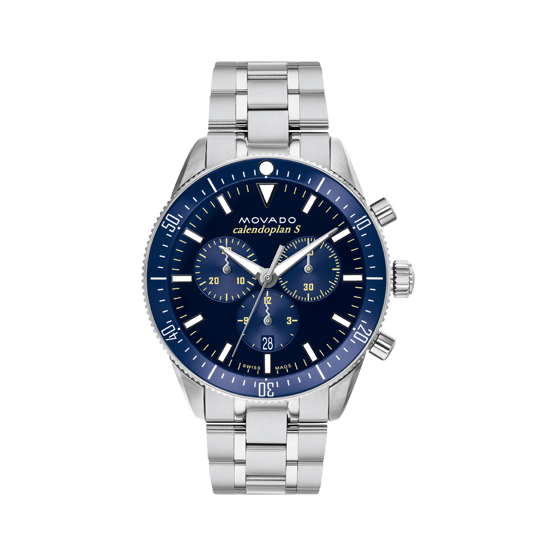 Movado Heritage Series Calendoplan Chronograph, 42 mm stainless steel case and bracelet with blue-toned dial & unidirectional rotating bezel.