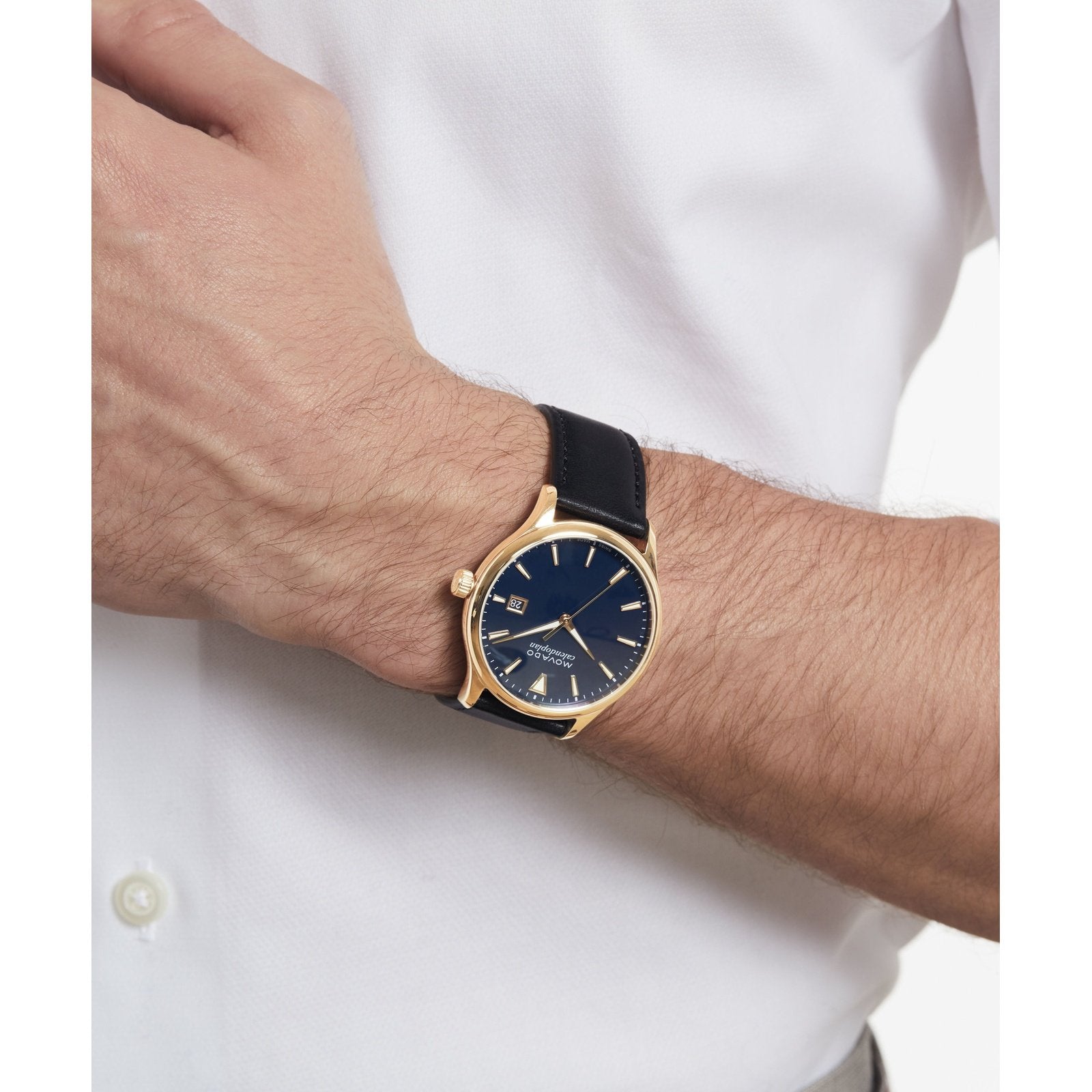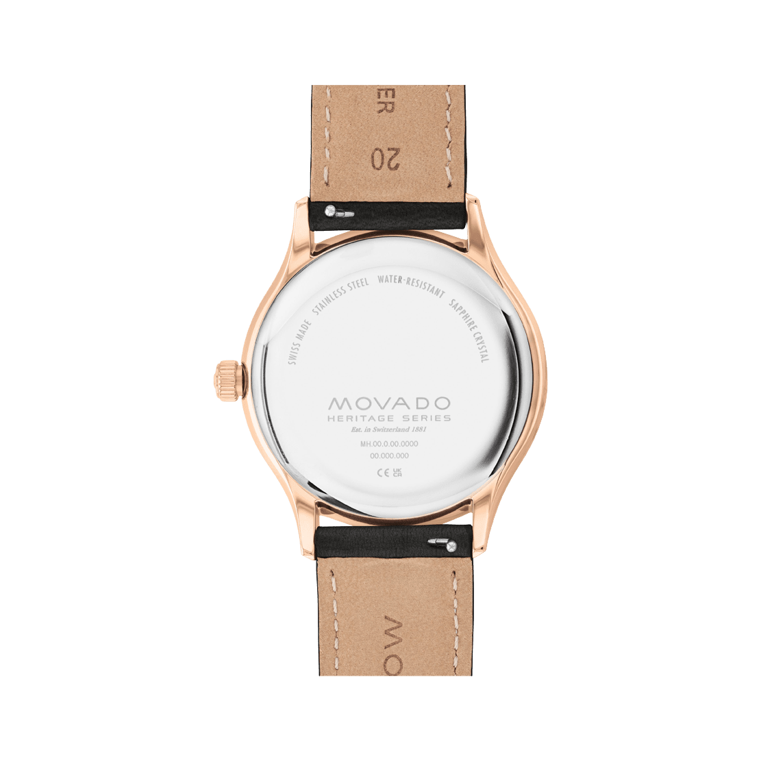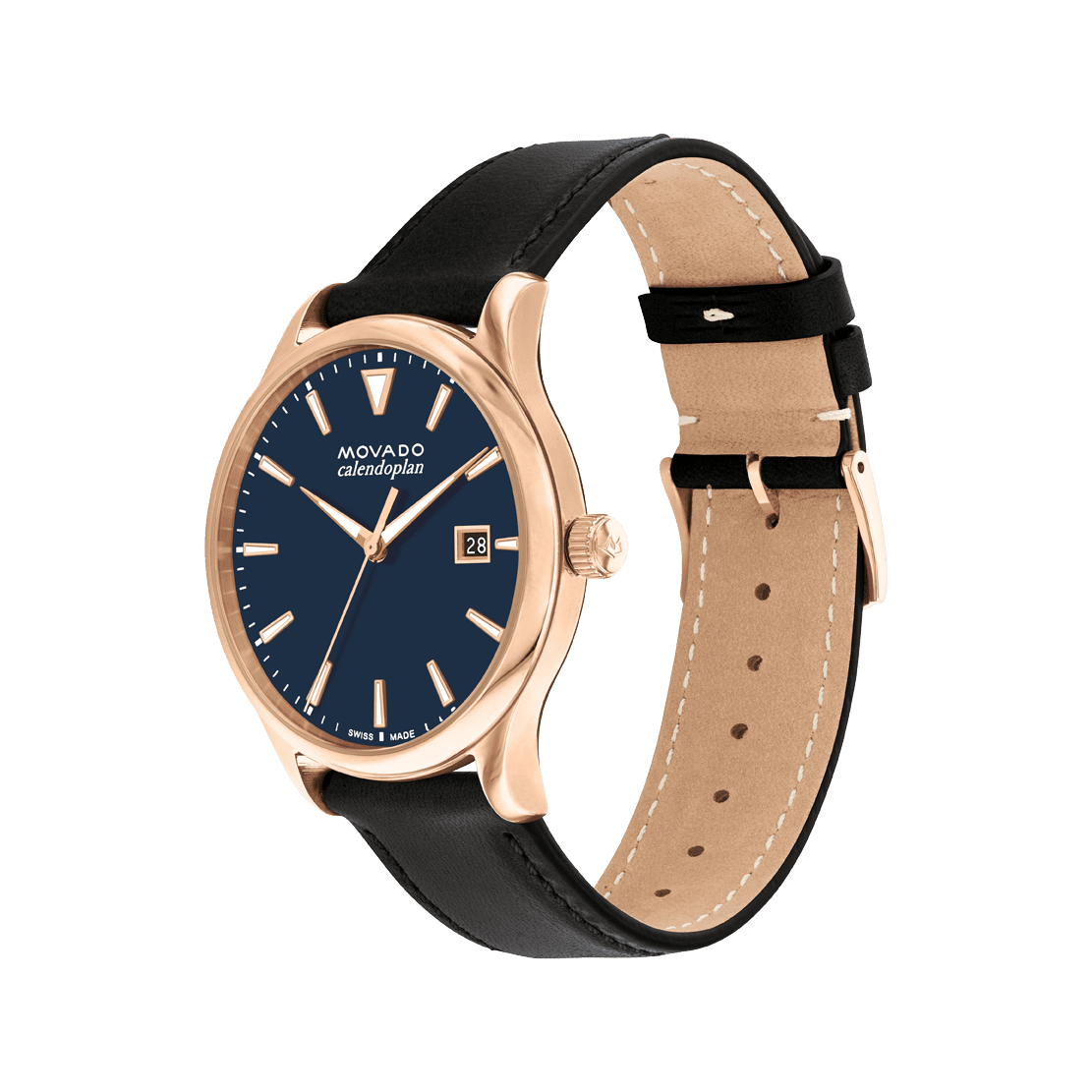 First introduced in 1950, the Movado Calendoplan captures the soul of mid-century design with contemporary details. This timeless design is inspired by our archives and features a 40mm case of rich rose gold ion-plated stainless steel framing a deep blue dial outfitted with Swiss Super-LumiNova® accents and a date window....