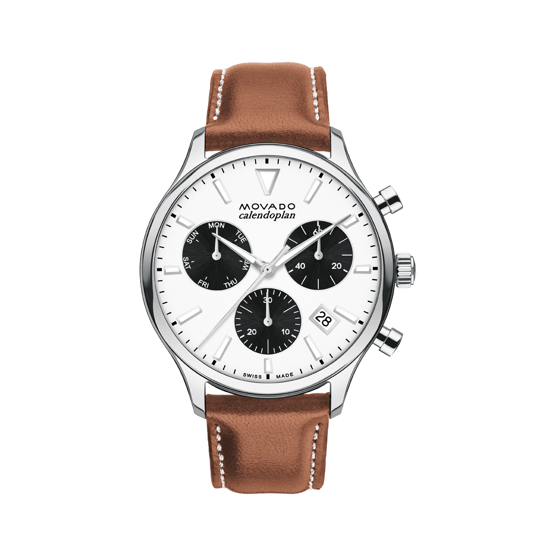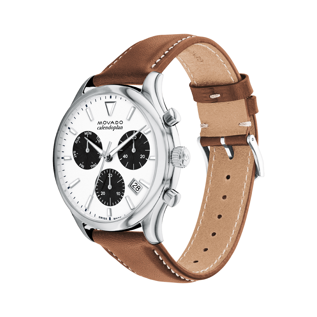 First introduced in 1950, the Movado Calendoplan captures the soul of mid-century design with contemporary details. This timeless chronograph timepiece is inspired by our archives and features a 43mm stainless steel case framing a white dial outfitted with three black subdials, Swiss Super-LumiNova® accents and a date window. The design is completed with a smooth leather strap in classic cognac with a matching stainless steel buckle.