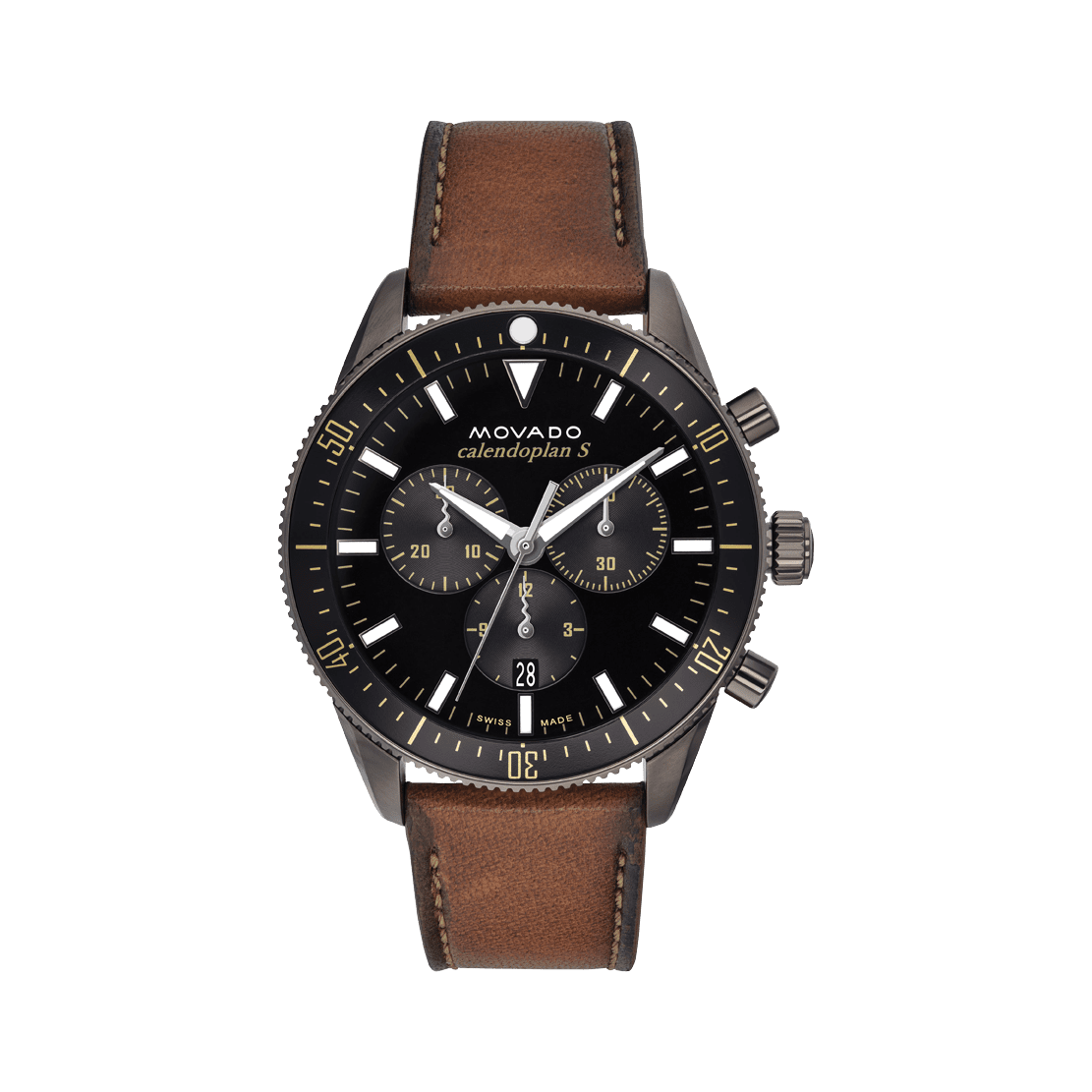 Movado Heritage Series Calendoplan S Chronograph, 42mm gunmetal-ion plated case with fluidly extended lugs, black aluminum bezel & black chronograph dial. Features Swiss Super-LumiNova® accents on cognac leather strap.