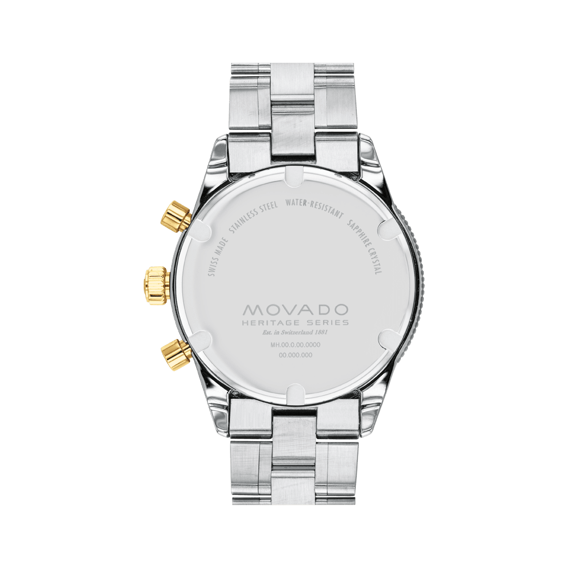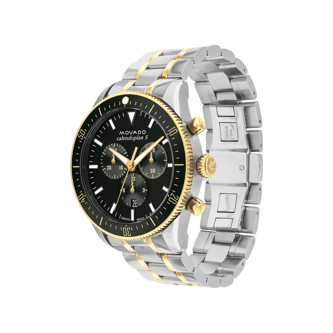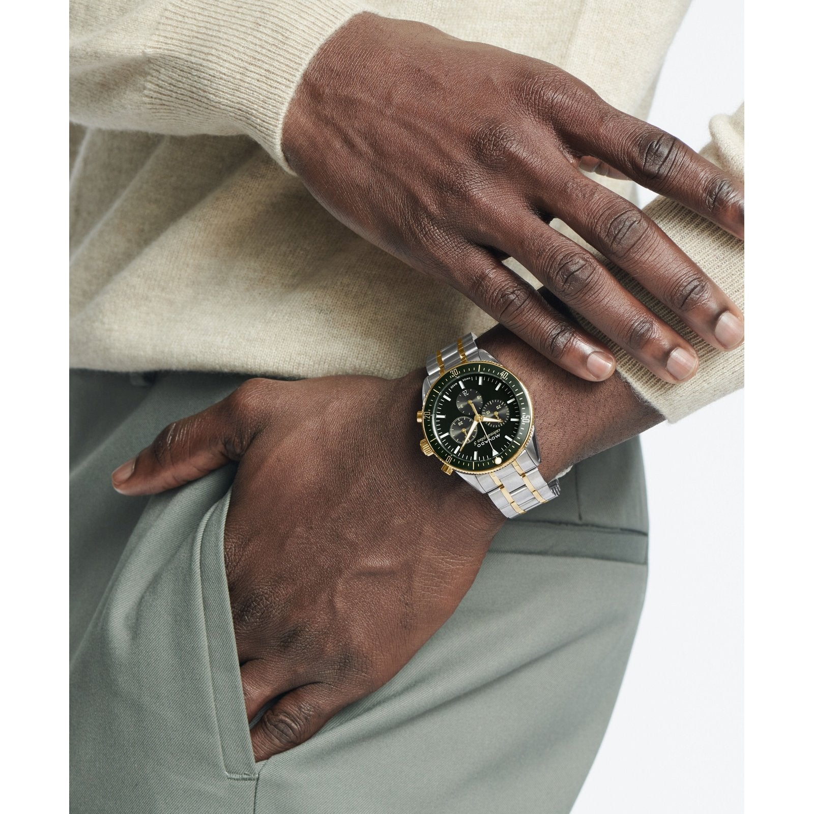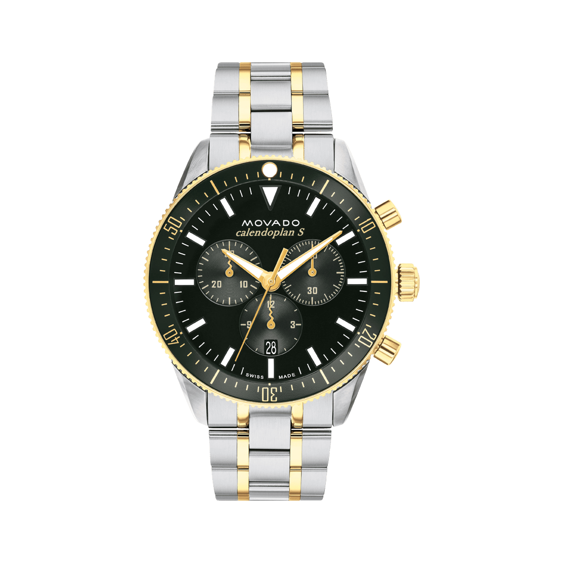 Iconic mid-century design gets a fresh feel. First introduced in 1950, this contemporary-cool design is inspired by our archives with a modern sporty feel. This timepiece features a two-tone 42mm case in classic stainless steel accented by yellow gold ion-plating with a green unidirectional rotating bezel. The green chronograph dial...