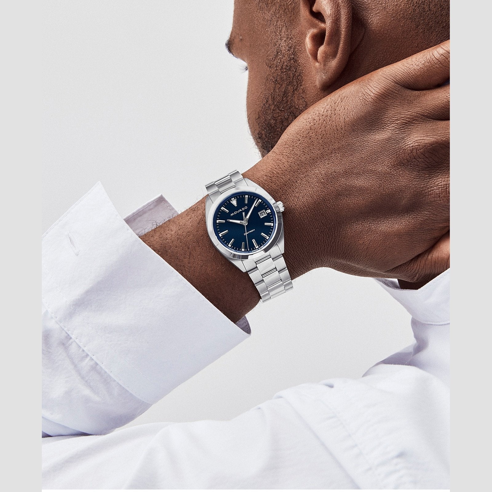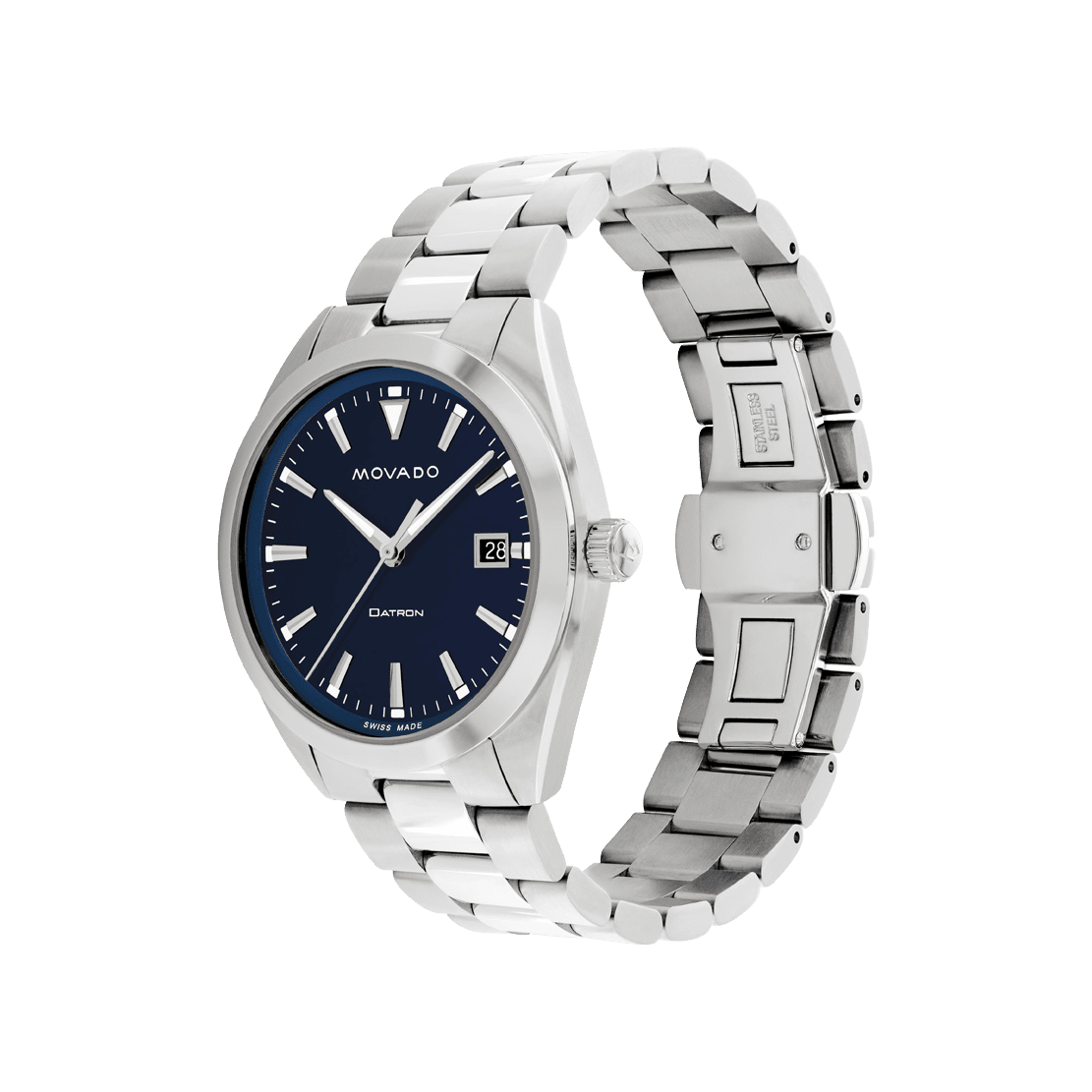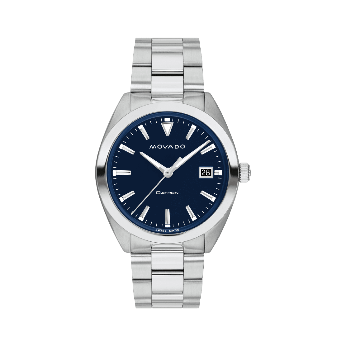 Retro-cool design defined by timeless styling and a distinctive case have defined the Datron Collection for over 50 years. Inspired by our archives, this design features a 39mm case of stainless steel housing a deep blue dial fitted with Swiss Super-LumiNova® accents and a date window. A fluid H-link bracelet in matching stainless steel and effortless push-button deployment clasp complete this essential piece.