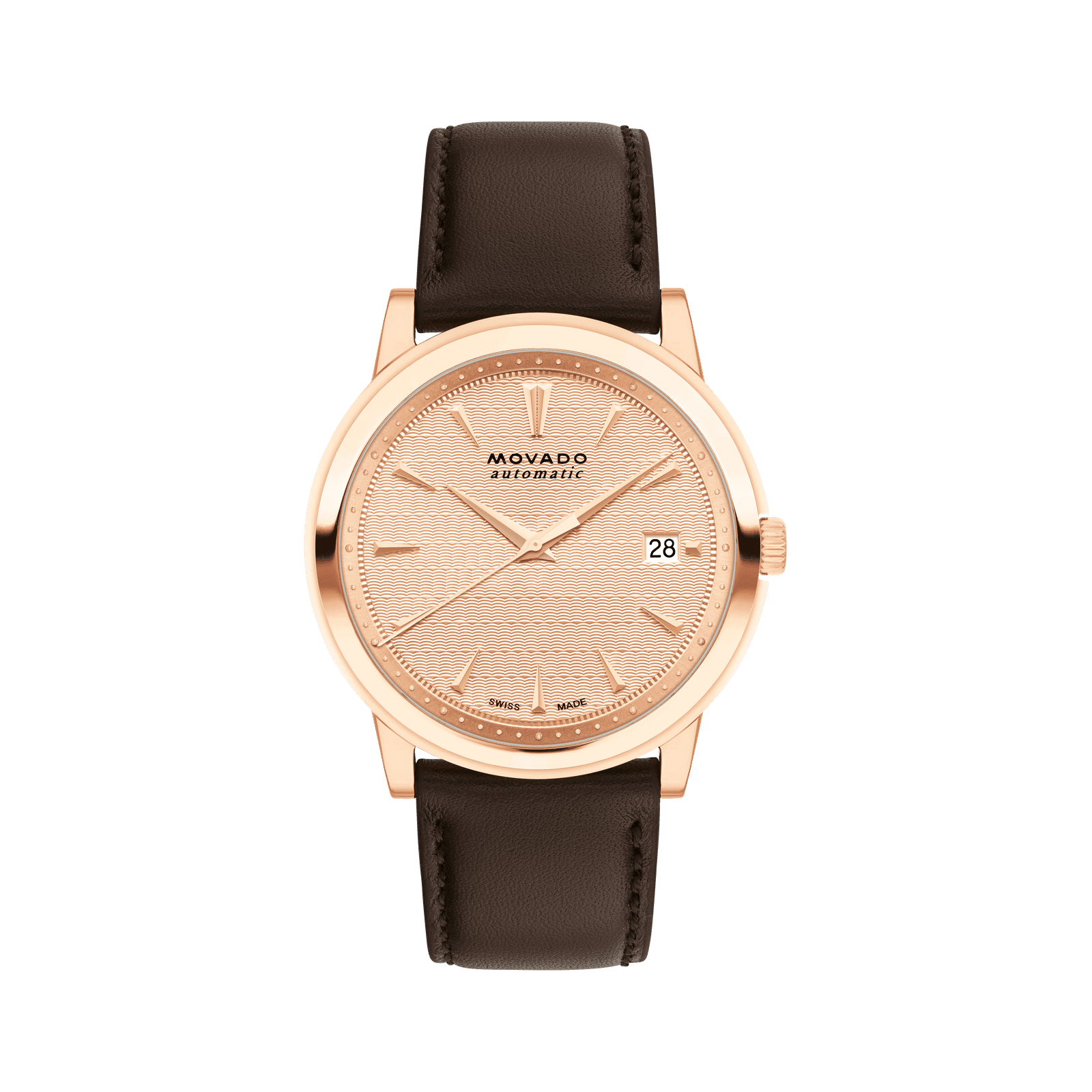 Movado Heritage Series Disco Volante Automatic, 40 mm rose gold ion-plated stainless steel case with rose gold stamped dial on a brown leather strap. Caseback features an exposed automatic movement. Automatic watches do not contain batteries. They are charged by the movement of your wrist. If the watch is not...