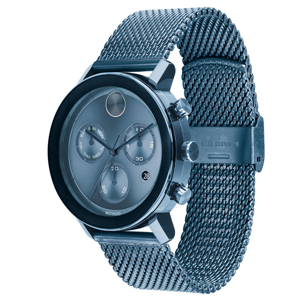 Bold Statement in Blue: This Movado Men's Bold Round Chronograph Watch makes a powerful statement with its striking blue design. The 42mm stainless steel case houses a cool blue dial featuring three chronograph subdials for measuring elapsed time. The signature Movado Museum element is reimagined here with a single blue dot at 12 o'clock, echoing the bold color scheme. The mesh bracelet complements the blue dial and adds a touch of sophistication. This Movado watch is a great choice for the man who appreciates a bold, sporty timepiece with stopwatch functionality