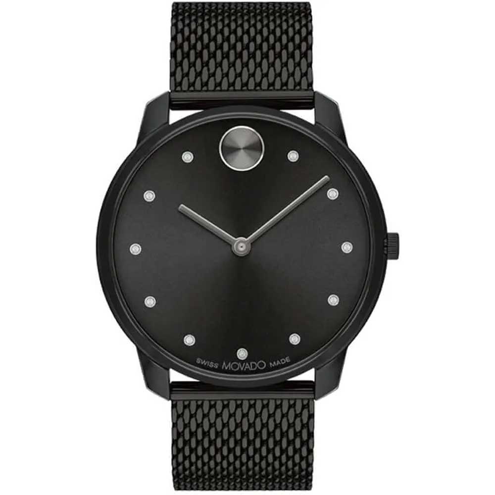 This Movado Bold Thin watch combines classic elements with a contemporary design. The black ion-plated stainless steel construction offers a sleek and modern look, while the crystal hour markers add a touch of sophistication . The Swiss quartz movement ensures accurate timekeeping, and the black mesh bracelet provides a comfortable fit. This timepiece combines style and function, making it a great everyday watch for individuals.