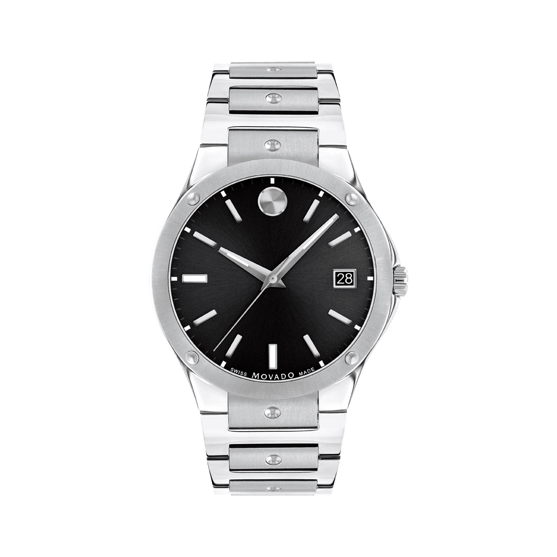Movado SE, 41mm dual finished stainless steel case and bracelet with silver concave polished dot accents and black sunray dial. Features Sapphire crystal, date window detailing, and Swiss Super-LumiNova® hands, hour markers & indices at 6:00 and 9:00.