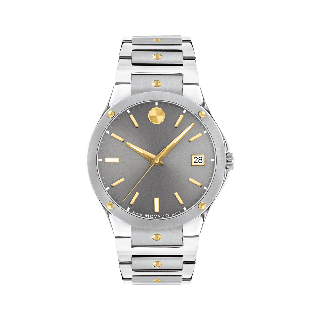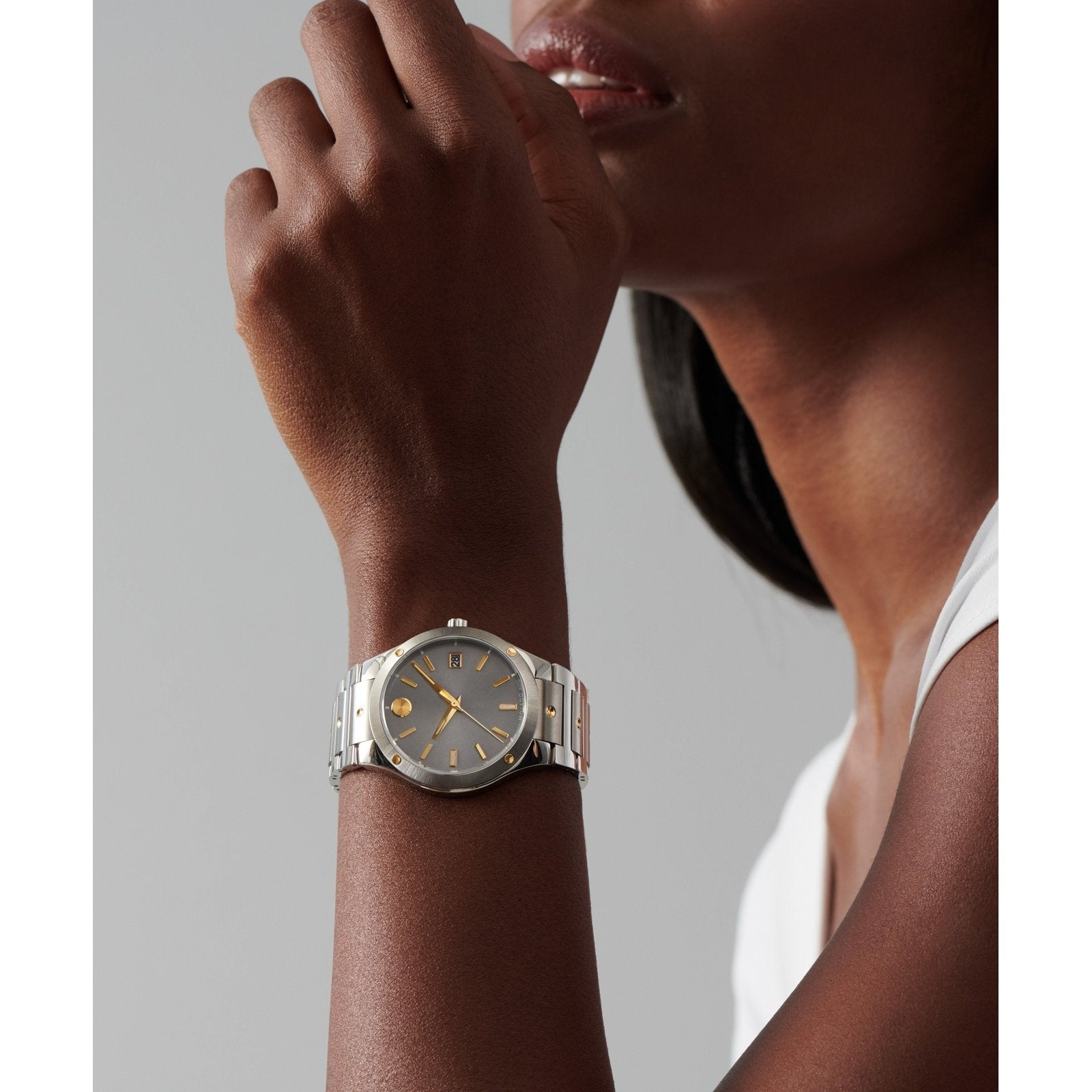 Movado SE, 41mm dual finished stainless steel case and bracelet with yellow gold PVD-finished concave polished dot accents and mid-grey sunray dial. Features Sapphire crystal, date window detailing, and Swiss Super-LumiNova® hands, hour markers & indices at 6:00 and 9:00.
