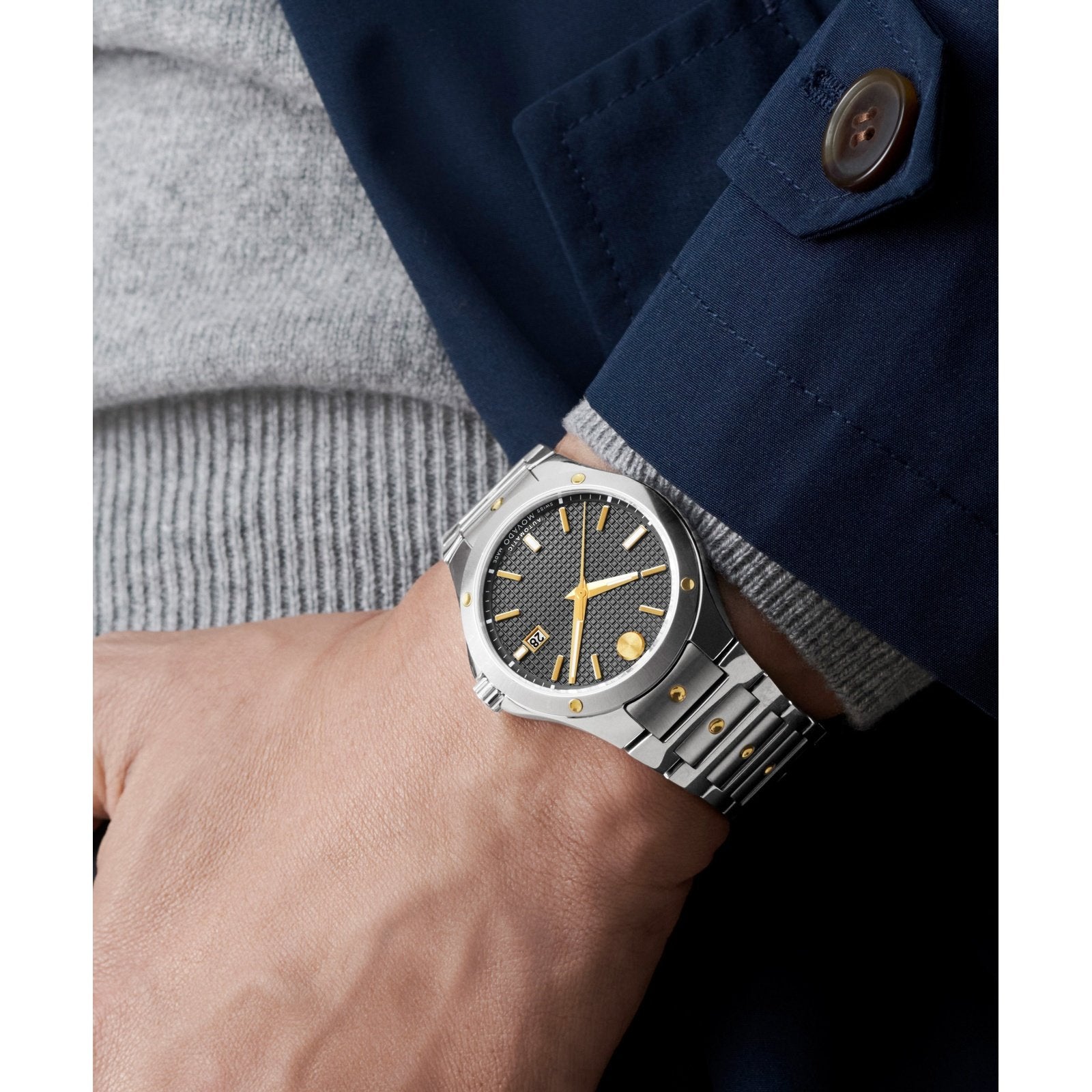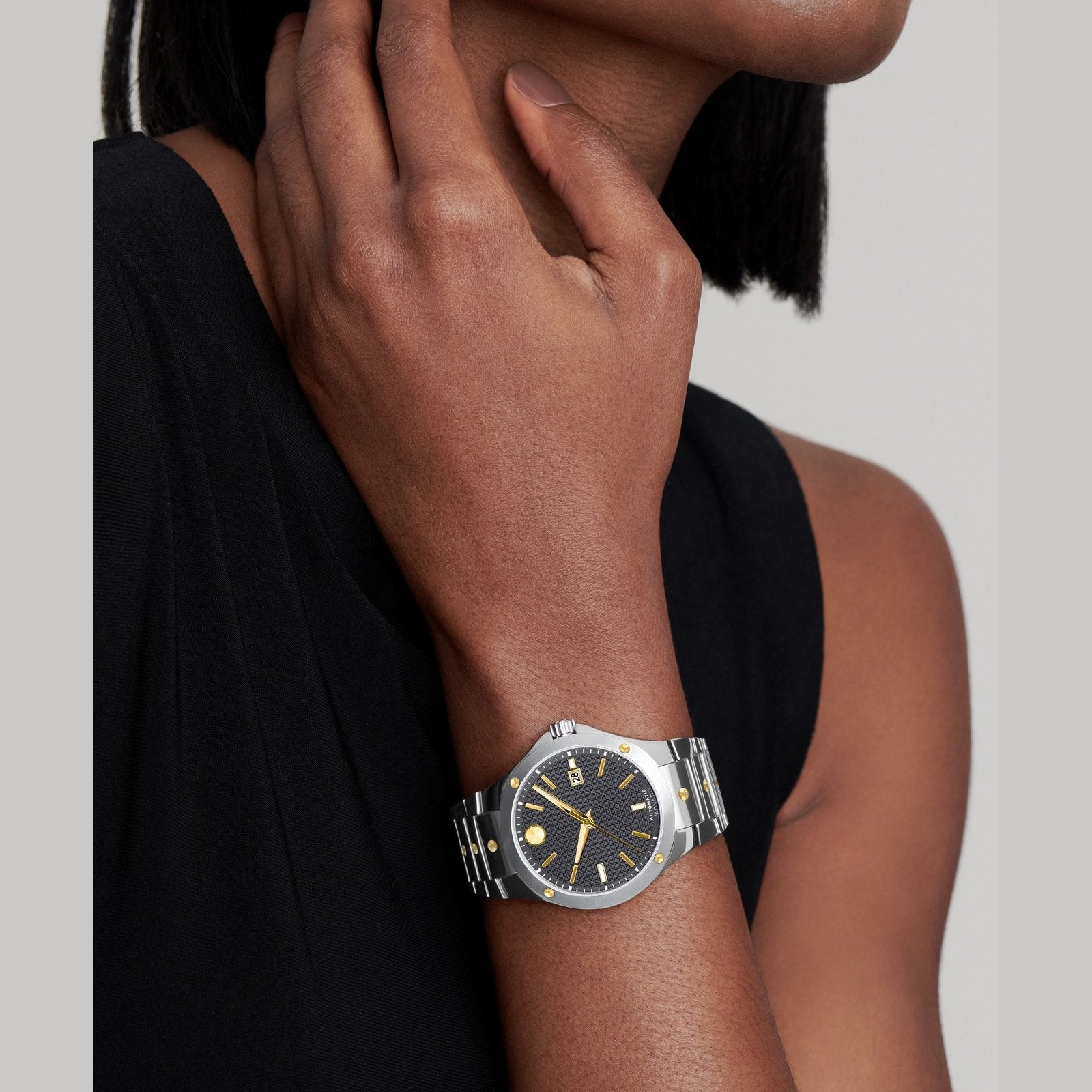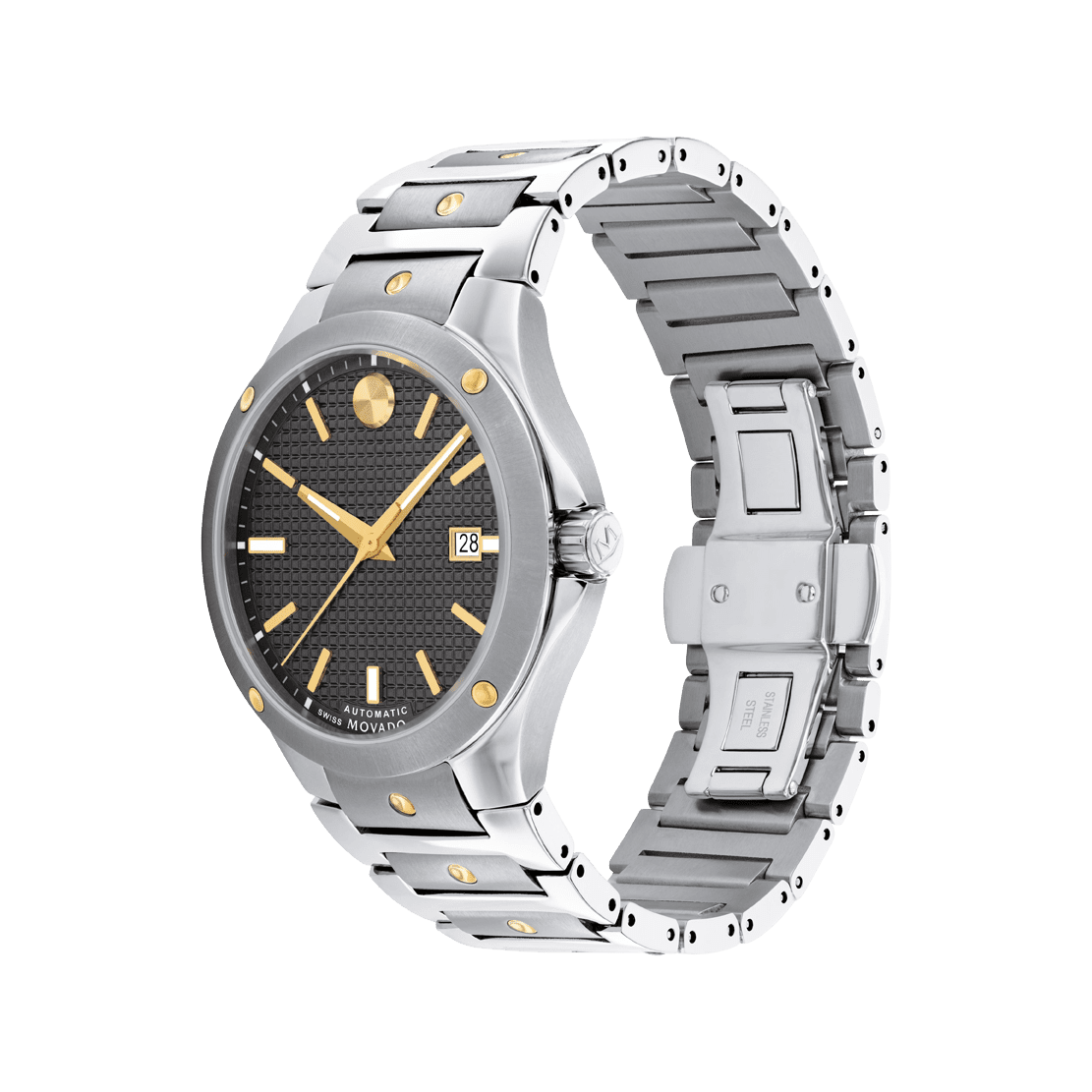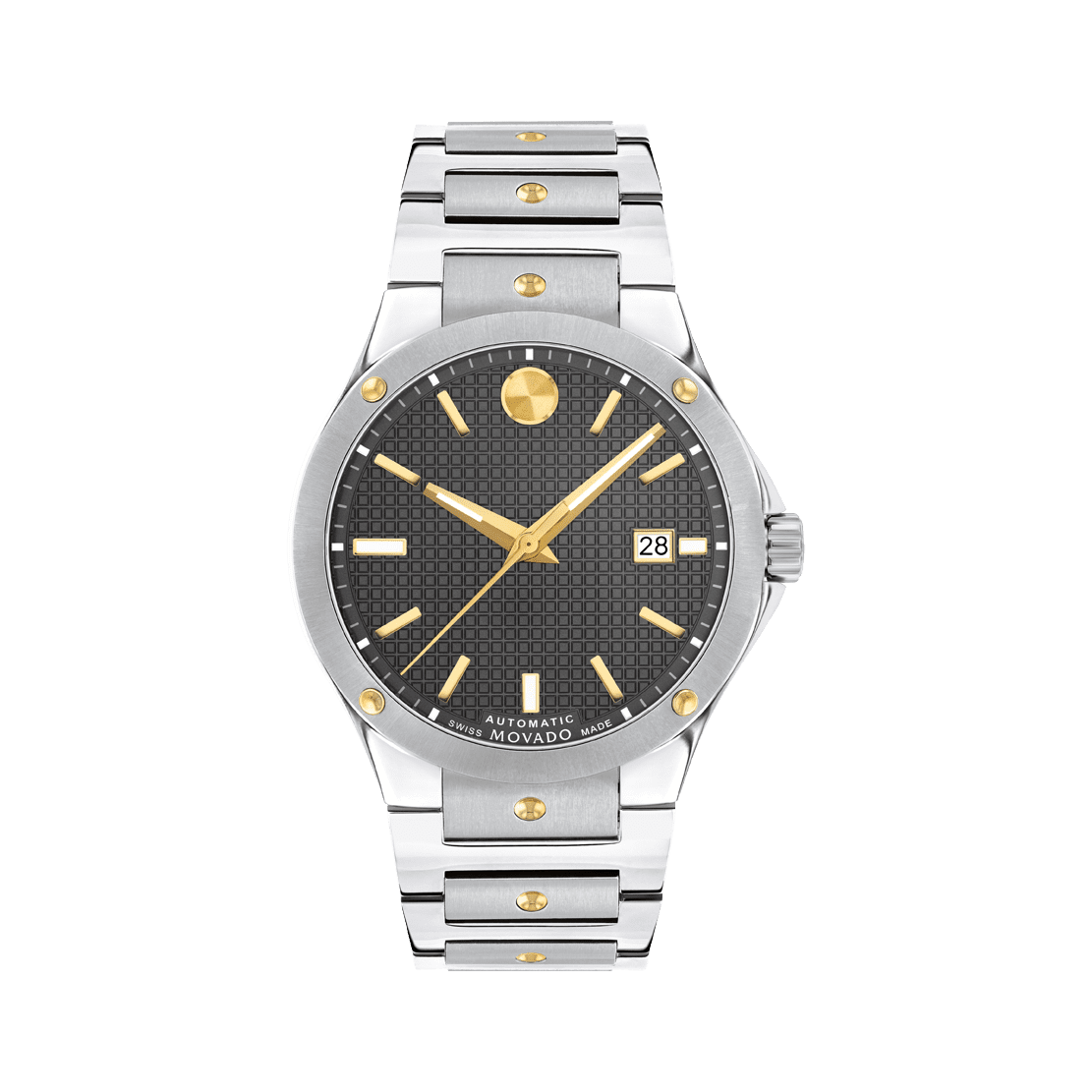 Movado SE Automatic, 41mm dual finished stainless steel case and bracelet with yellow gold PVD-finished concave polished dot accents and Dura904 steel bezel. Features a grey Pavés de Paris dial, anti-reflective Sapphire crystal, anti-corrosive bezel, screw down crown, date window, and Swiss Super-LumiNova® hands, hour markers & indices at 3:00, 6:00 and 9:00. Powered by the 608A caliber automatic movement with a quick setting calendar date, stop-second function and rapid reset mechanism showcased through an exhibition caseback.