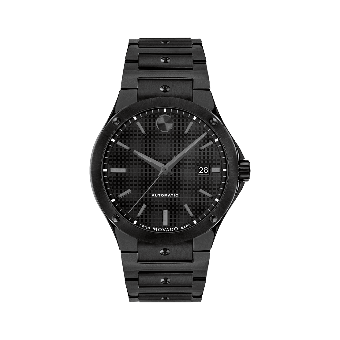 Exquisite Swiss craftsmanship meets modern, sporty design in the SE Automatic watch. Powered by the motion of your body, this watch is driven by a 608A caliber automatic movement housed in a 41mm black PVD case with a stunning exhibition caseback. Its bezel is crafted of Dura904, an innovative steel prized for its nearly indestructible nature, comfort on the skin, and ability to hold a beautiful polish. We’ve added a signature touch with our iconic dot motif displayed at 12 o’clock and in subtle concave accents at the anti-corrosive bezel and bracelet. Covered in anti-reflective sapphire crystal, the dial features a bold, geometric Pavés de Paris pattern in black, a date window and Swiss Super-LumiNova® hands, hour markers and indices at 3:00, 6:00 and 9:00.