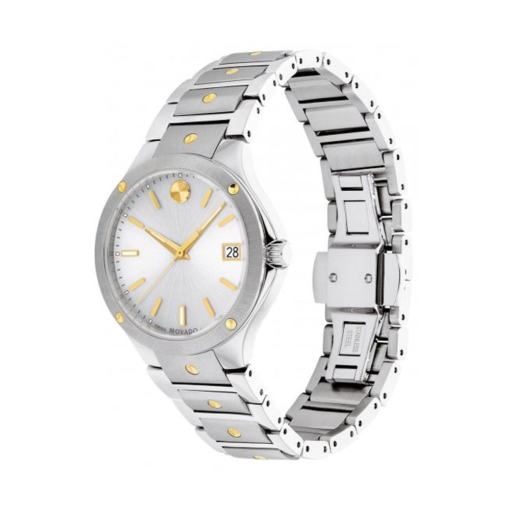 Stainless steel case with a stainless steel bracelet. Fixed stainless steel bezel. Silver dial with luminous gold-tone hands and index hour markers. Minute markers around the outer rim. Movado dot appears at the 12 o'clock position. Dial Type: Analog. Luminescent hands and markers. Date display at the 3 o'clock position....