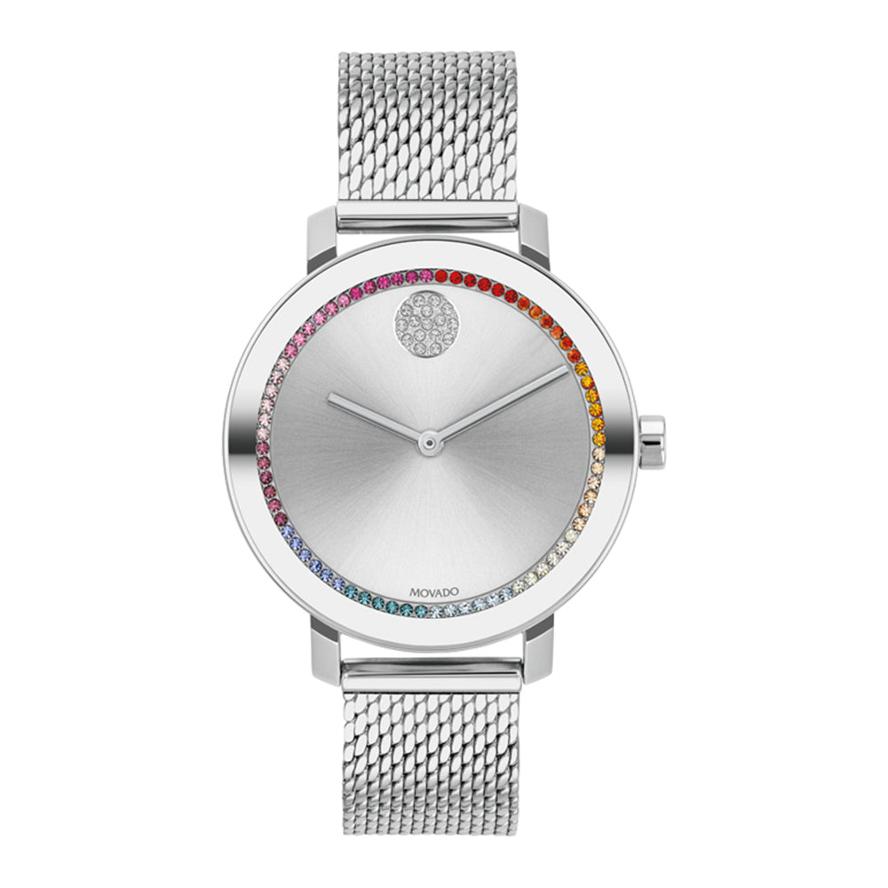This Movado Bold Ladies Watch offers a striking and modern look. The 34mm stainless steel case and bracelet boast a sleek silver finish. The captivating dial features a mother-of-pearl center surrounded by a circle of multicolored stones, adding a touch of brilliance. A single, slender silver hand minimalistically indicates the hour, while the signature Movado dot with silver stones sits at 12 o'clock. Powered by a reliable quartz movement, this Movado watch is water resistant up to 30 meters, making it a stylish and versatile timepiece for everyday wear.