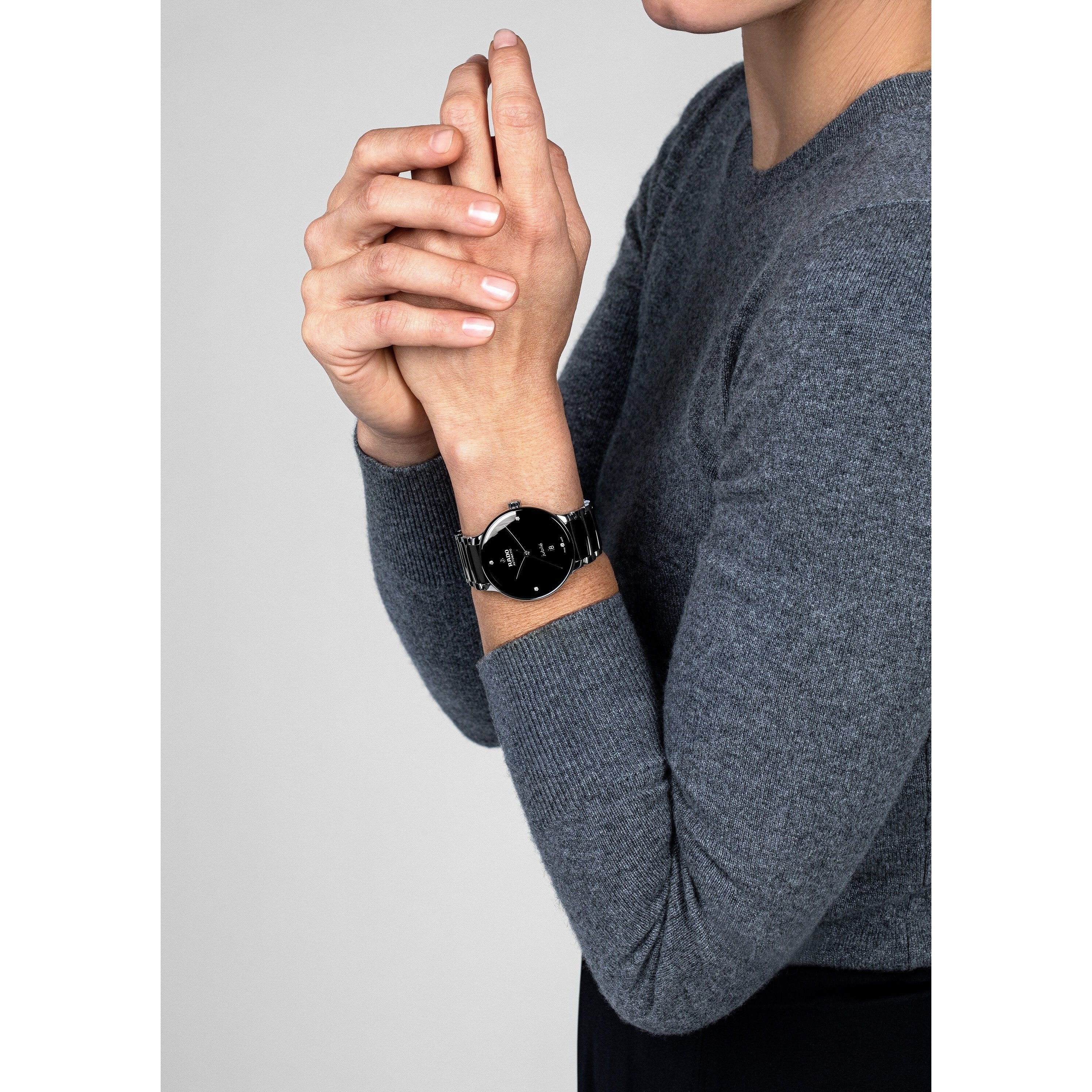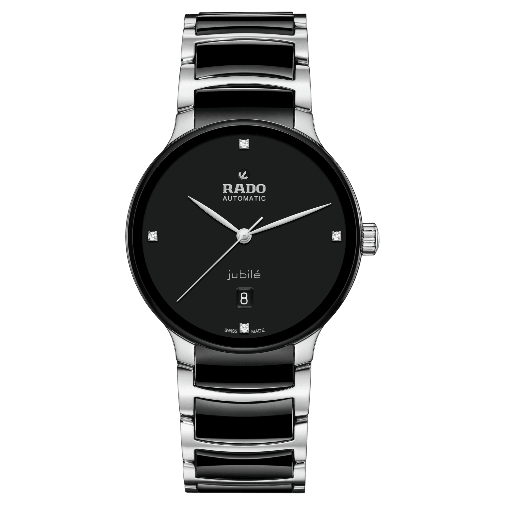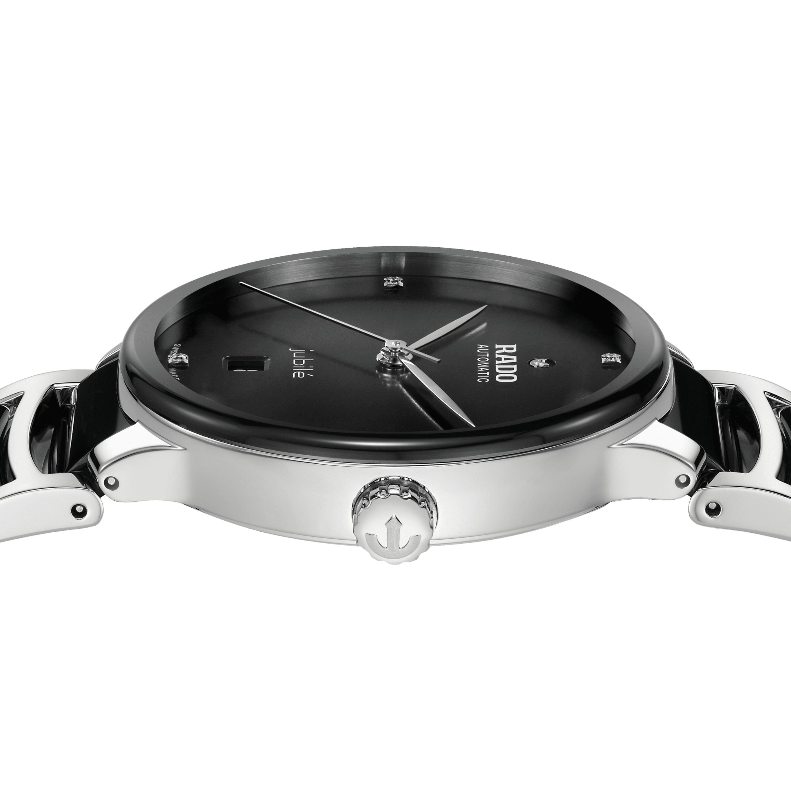 The classic Centrix Automatic Diamonds watch has been reworked not only technically, but also aesthetically. The modified model has a rounded sapphire crystal that extends all the way to the edge, as well as a curved case blending with the curved crystal edge. The adjusted case lugs and the bracelet made of polished stainless steel with black high-tech ceramic middle links complete the overall appearance of this iconic timepiece. The black lacquered dial with 4 diamonds, emphasised with the printed “jubilé” logo, matches perfectly with the rhodium-coloured hands. Inside, the three-hand calibre R763 movement exceeds standard accuracy test requirements from 3 to 5 positions, thanks to its antimagnetic Nivachron™ hairspring for increased reliability and accuracy. The watch is water resistant down to 50 m and offers 80 hours of power reserve.