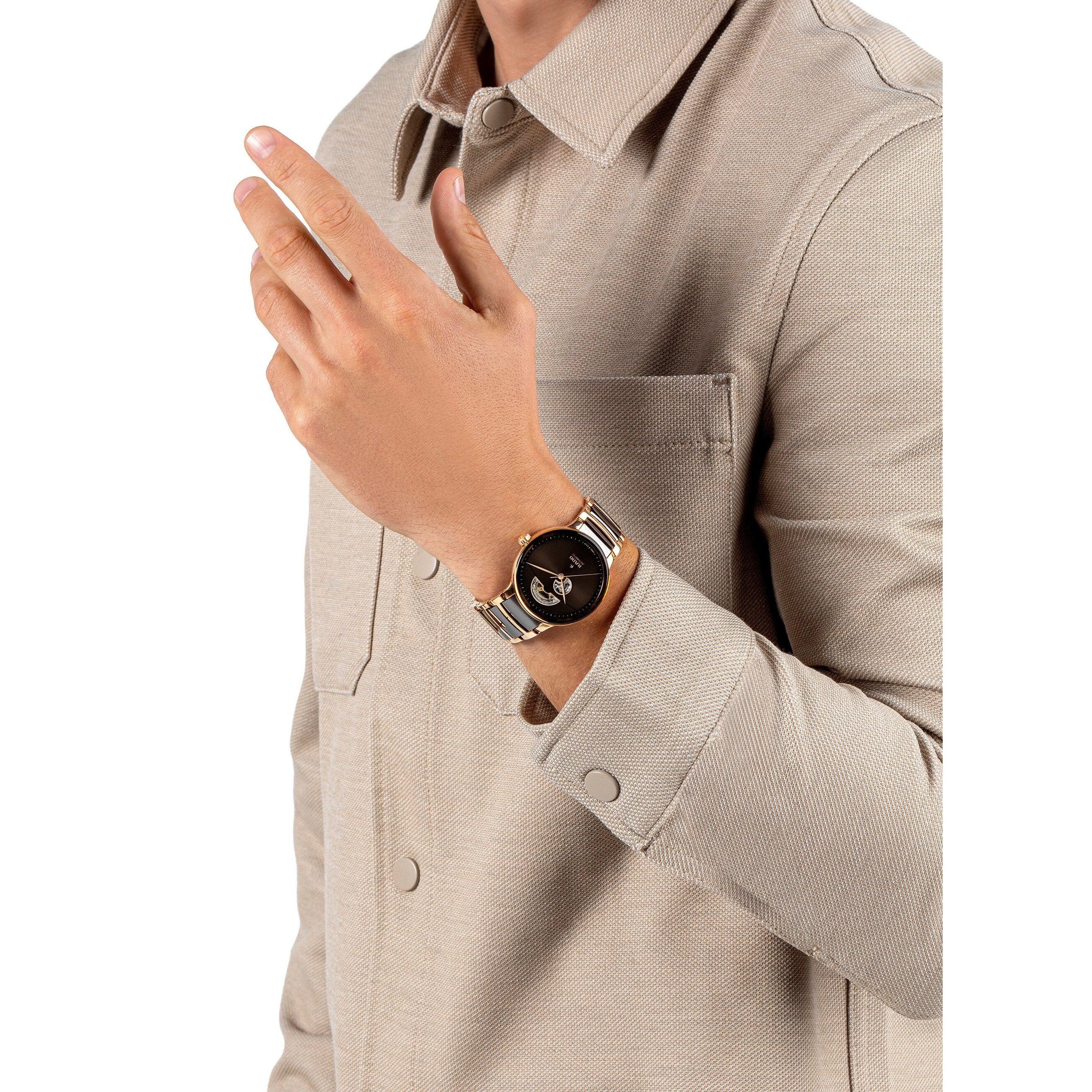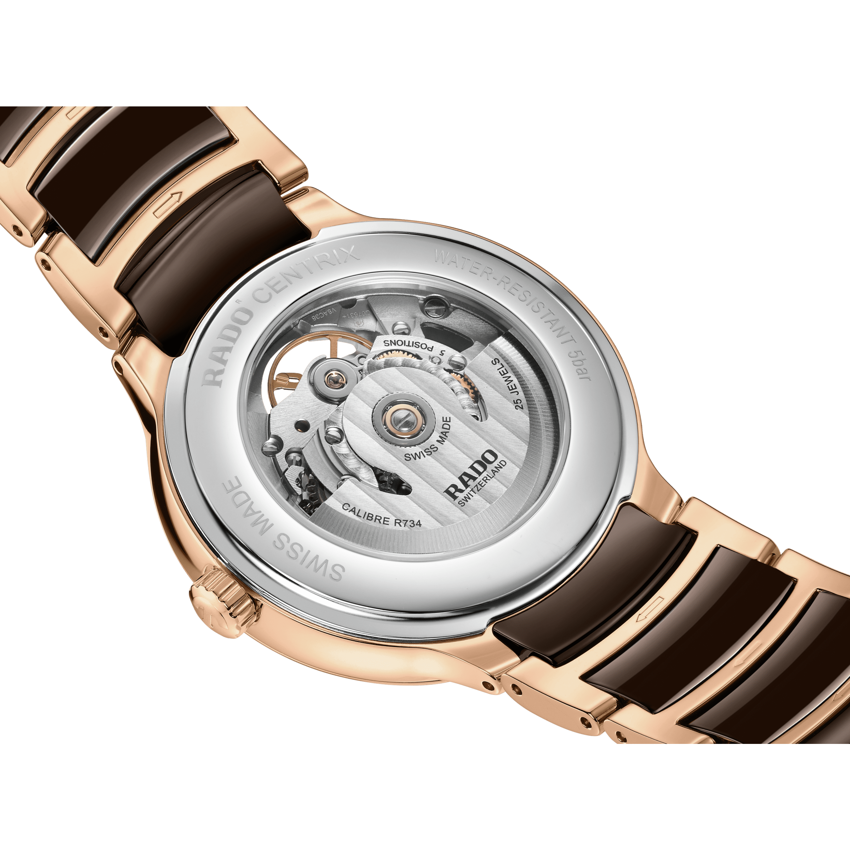 Discover the perfect harmony of innovation and aesthetics with the Rado Centrix Automatic Open Heart. At the heart of this masterpiece beats the Automatic Rado calibre R734 movement, producing impeccable precision and reliability. With an impressive 80-hour power reserve, this watch ensures uninterrupted performance. The antimagnetic Nivachronâ„¢ hairspring and adjustment in five positions further enhance its accuracy. Encased in a polished rose gold coloured stainless steel case, measuring a refined 39.5 mm, the Centrix Automatic Open Heart showcases meticulous craftsmanship. The polished stainless steel case back, fitted with a sapphire crystal, offers a glimpse into the mesmerizing inner workings of the watch. The dial exhibits a captivating brown gradient, adding depth and allure to the watch's design. Complemented by rose gold coloured hands, the dial ensures excellent legibility and a touch of elegance. The bracelet features polished rose gold coloured stainless steel and brown high-tech ceramic middle links, creating a striking contrast.