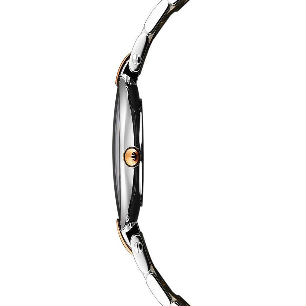 A re-visitation of the original Rado Coupole series from 1987, this beautiful unisex watch boasts of a stainless steel bracelet, with distinct rose-gold PVD coated centre links. Lightweight and tapering, this bracelet is secured with a deployment clasp. Adding charm to the bracelet is its polished finish, which complements the...