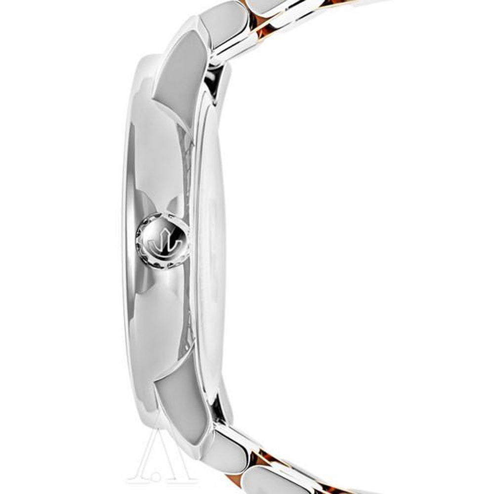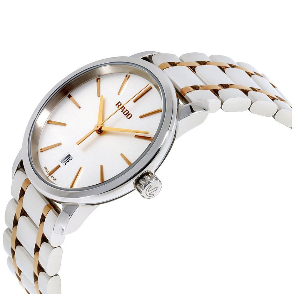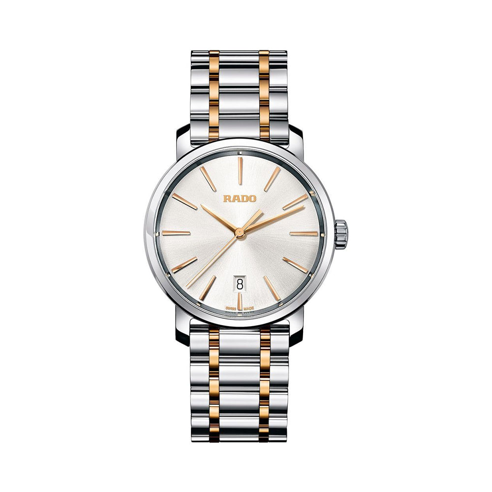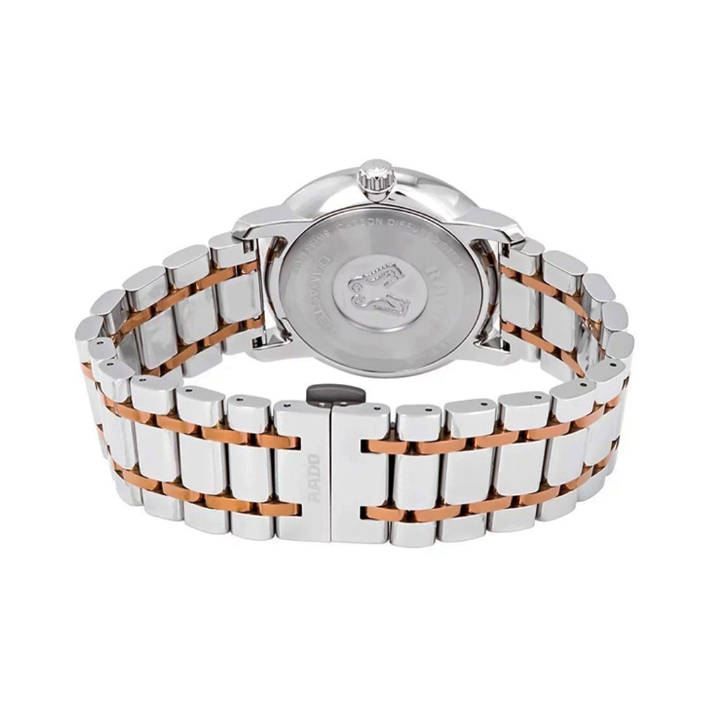 With a stainless steel bracelet interspersed with rose-gold PVD coated links, this wrist-watch model R14078103 for women from the Rado Diamaster collection oozes beauty in every part.  Delicate as well as resilient, the subtle aesthetic of this piece appeals to everyone. Carbon diffused steel makes up the 40 mm case encasing a large, round, silver dial. The increased size enables easy visibility. Rose gold-toned watch hands and stick hour indices set off its matte sheen to create a look of elegant minimalism. Rado’s customary scratch-resistant sapphire crystal ensures the endurance of the brand-new appearance of the watch.