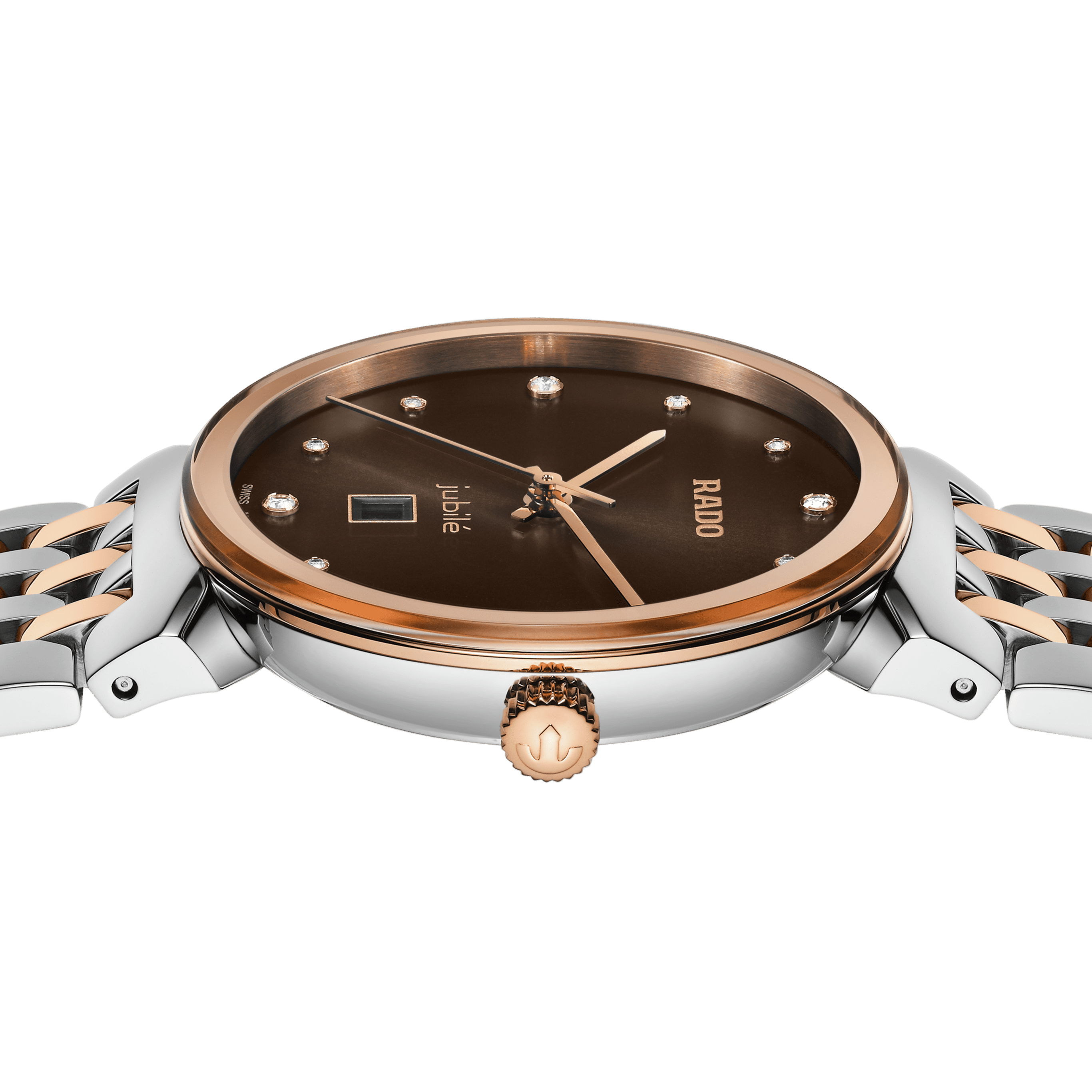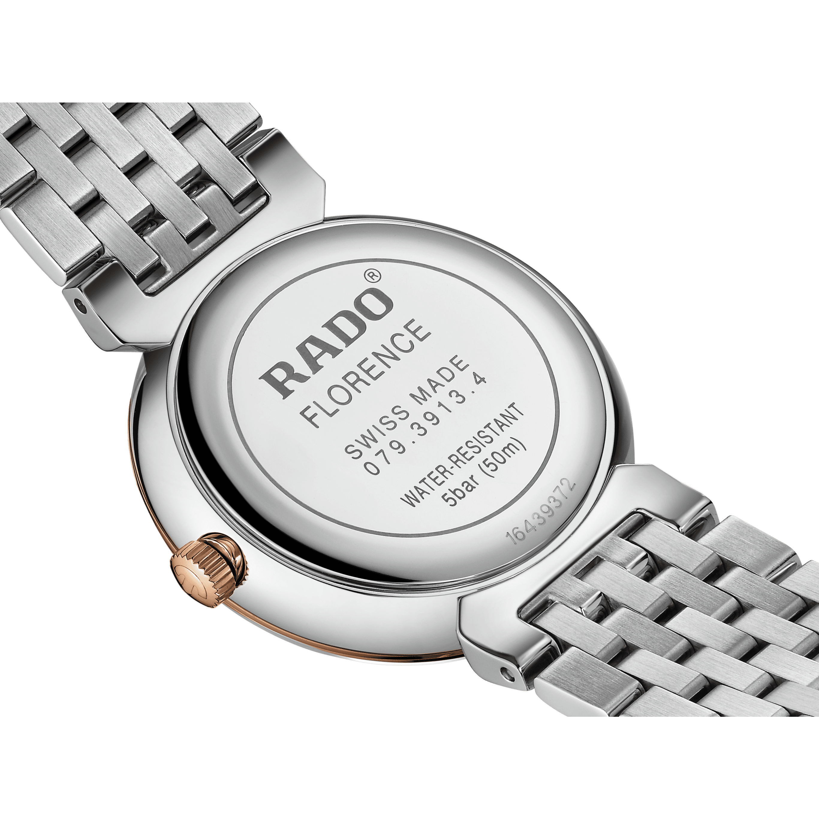 The harmonious design of the Rado Florence Classic calls to mind the elegant domes and towers of the city from which the collection takes its name. The 30 mm watch has an edge-to-edge-bevelled, curved sapphire crystal. The bracelet made of polished stainless steel with rose gold-coloured middle links completes the...