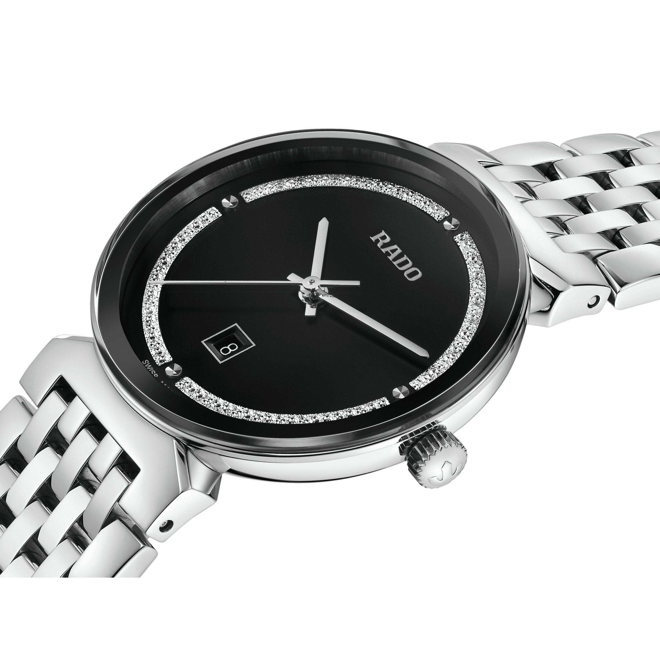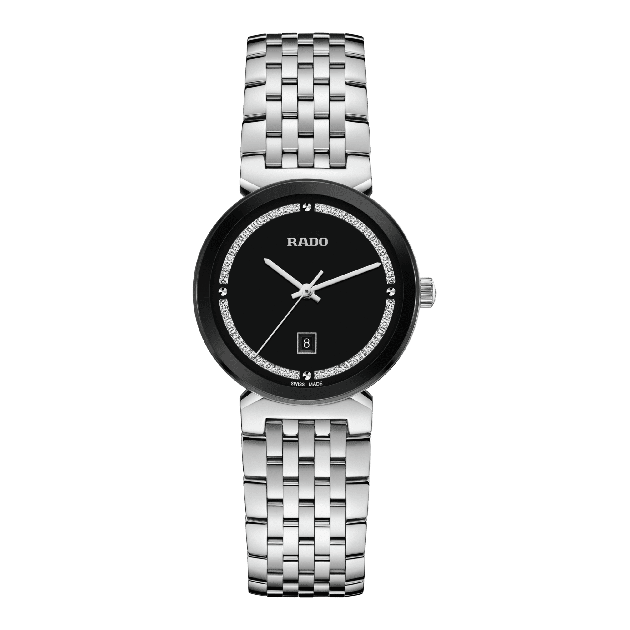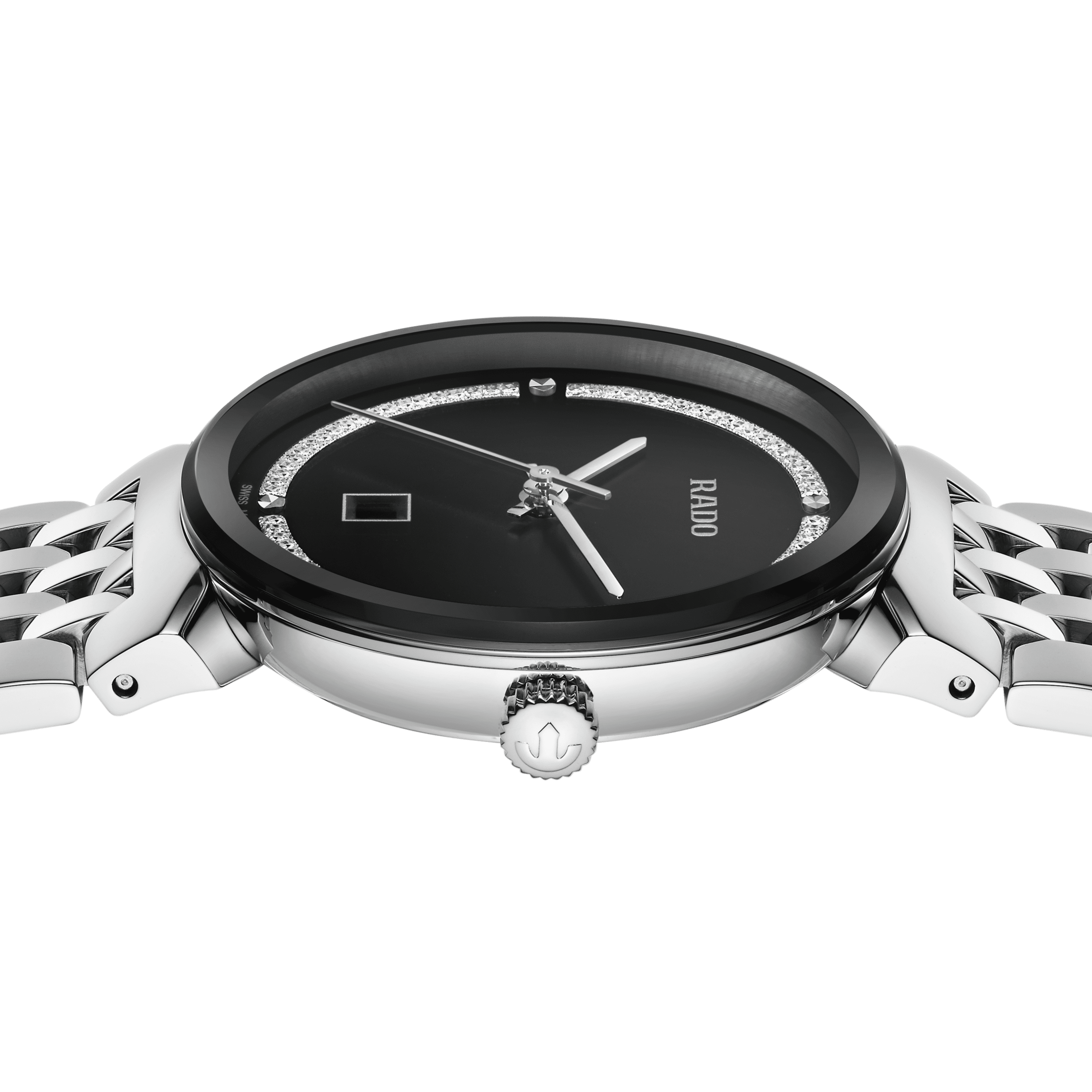 The harmonious design of the Rado Florence calls to mind the elegant domes and towers of the city from which the collection takes its name. Powered by a reliable three-hand Quartz Rado calibre R079 movement, this watch ensures greater accuracy and resistance to shocks. The 30 mm watch has an edge-to-edge-bevelled, curved sapphire crystal. The watch boasts a polished stainless steel case, crown, bezel and case back. The bracelet made of polished stainless steel completes the overall appearance of this classic timepiece. The black dial with rhodium glitter decoration, emphasised with the silver coloured printed “Rado” logo, matches perfectly with the rhodium coloured hands. The watch is water resistant down to 50 m and is also available in L size, which makes it an ideal couples’ watch.