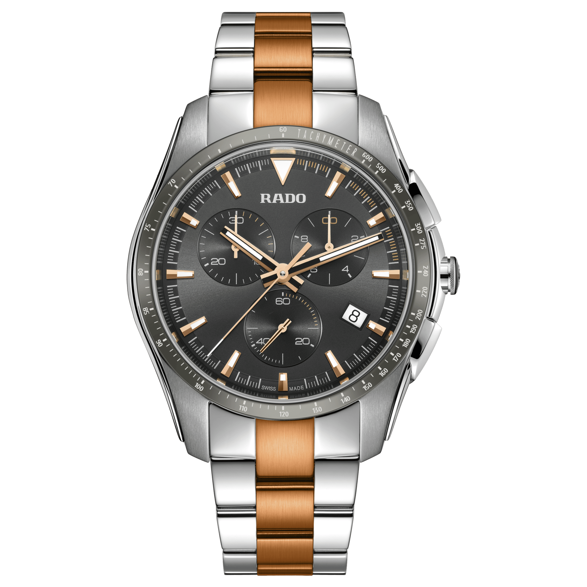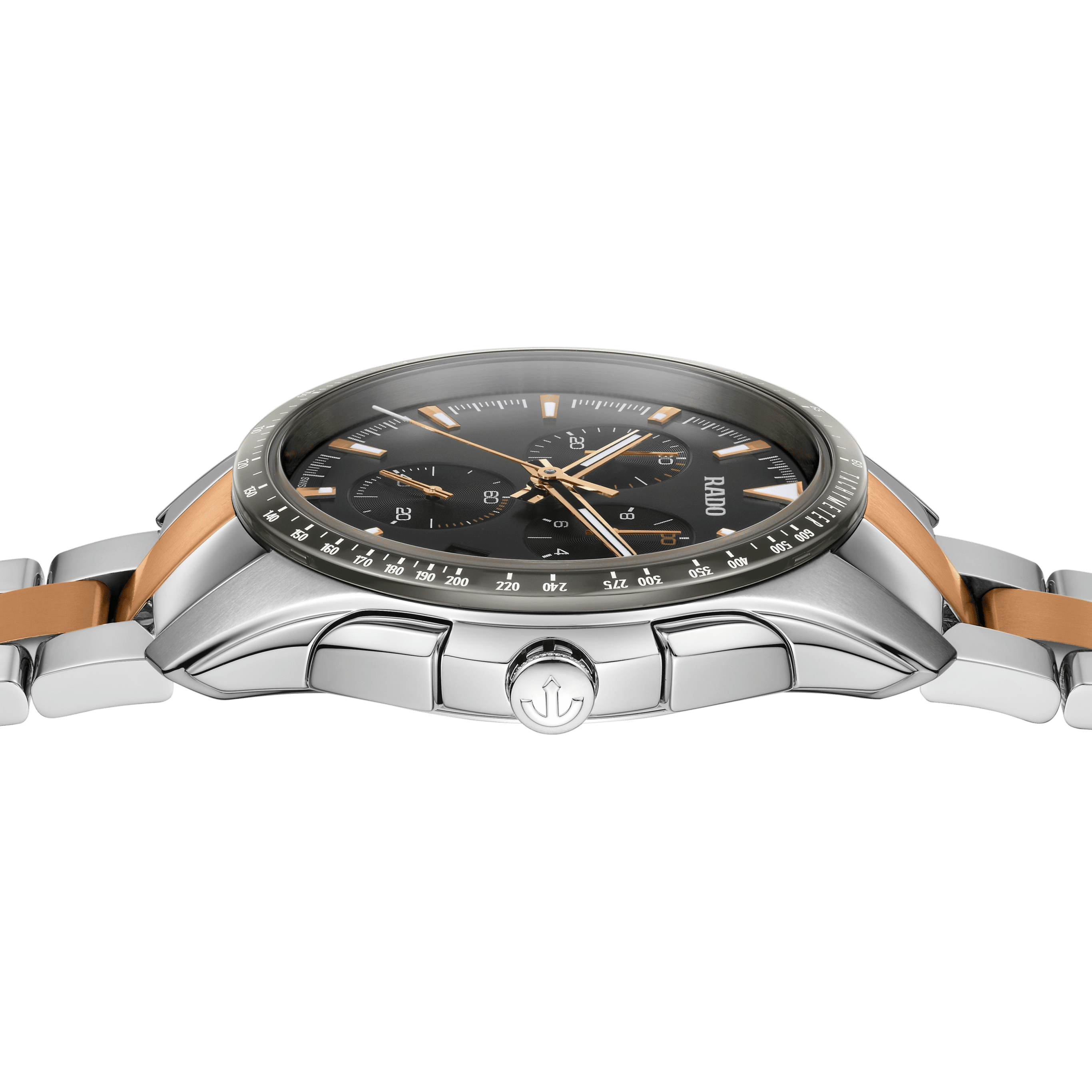 This 45 mm HyperChrome Chronograph with the Rado R312 quartz movement inside comes with a dark grey dial, which perfectly matches the 3-row polished stainless steel bracelet with rose gold coloured brushed middle links. The rose gold coloured hands and indexes with white Super-LumiNova® ensure excellent visibility. The case is made of polished and brushed stainless steel whereas the bezel with engraved tachymeter is made of polished plasma high-tech ceramic. The watch is water resistant down to 100 m.