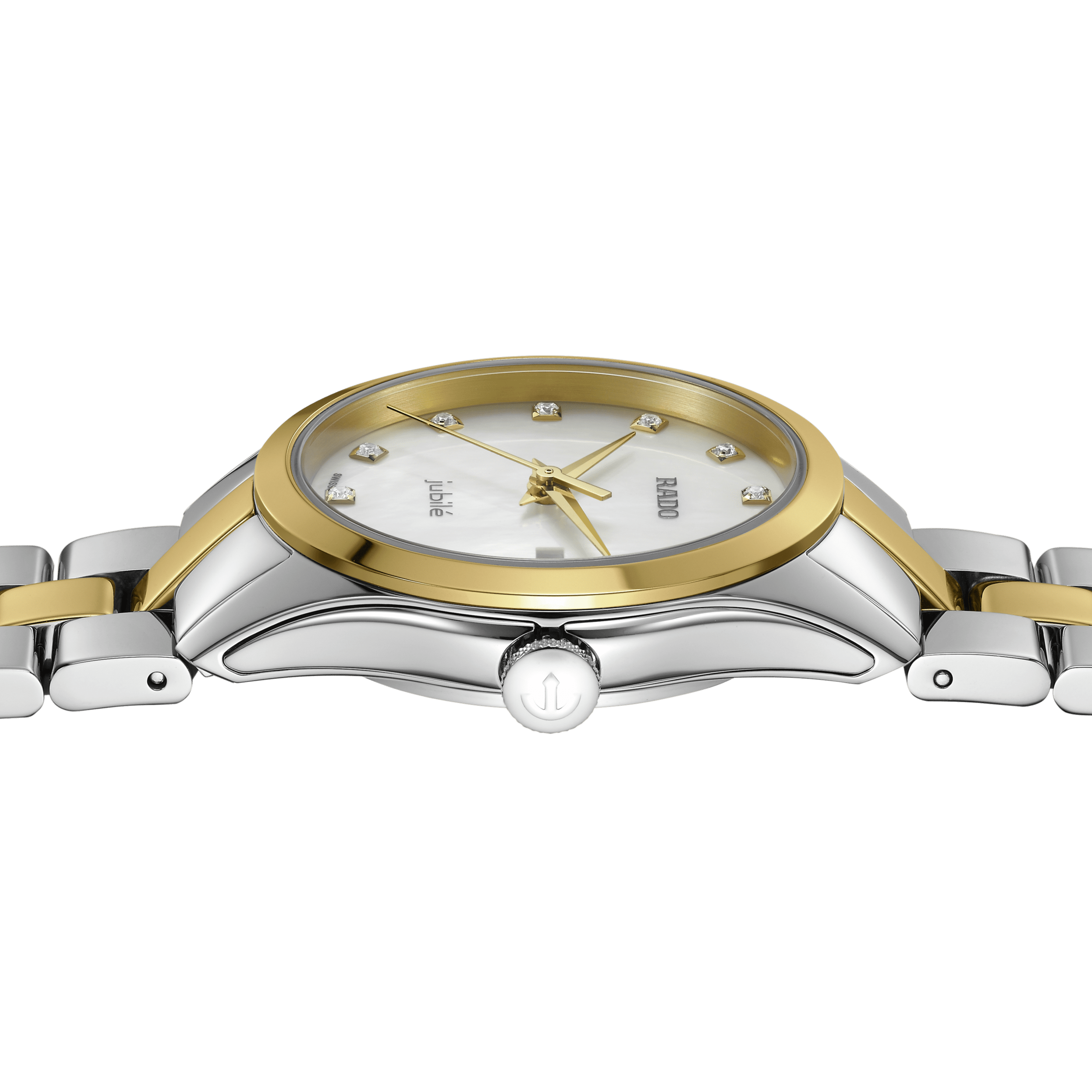 The HyperChrome Quartz features a 30mm polished stainless-steel case and crown and a polished yellow gold coloured Ceramos™ bezel, which matches with the 3-row polished stainless steel bracelet with yellow gold coloured Ceramos™ middle links. The white mother-of-pearl dial with 12 diamonds is covered by a curved sapphire crystal with...