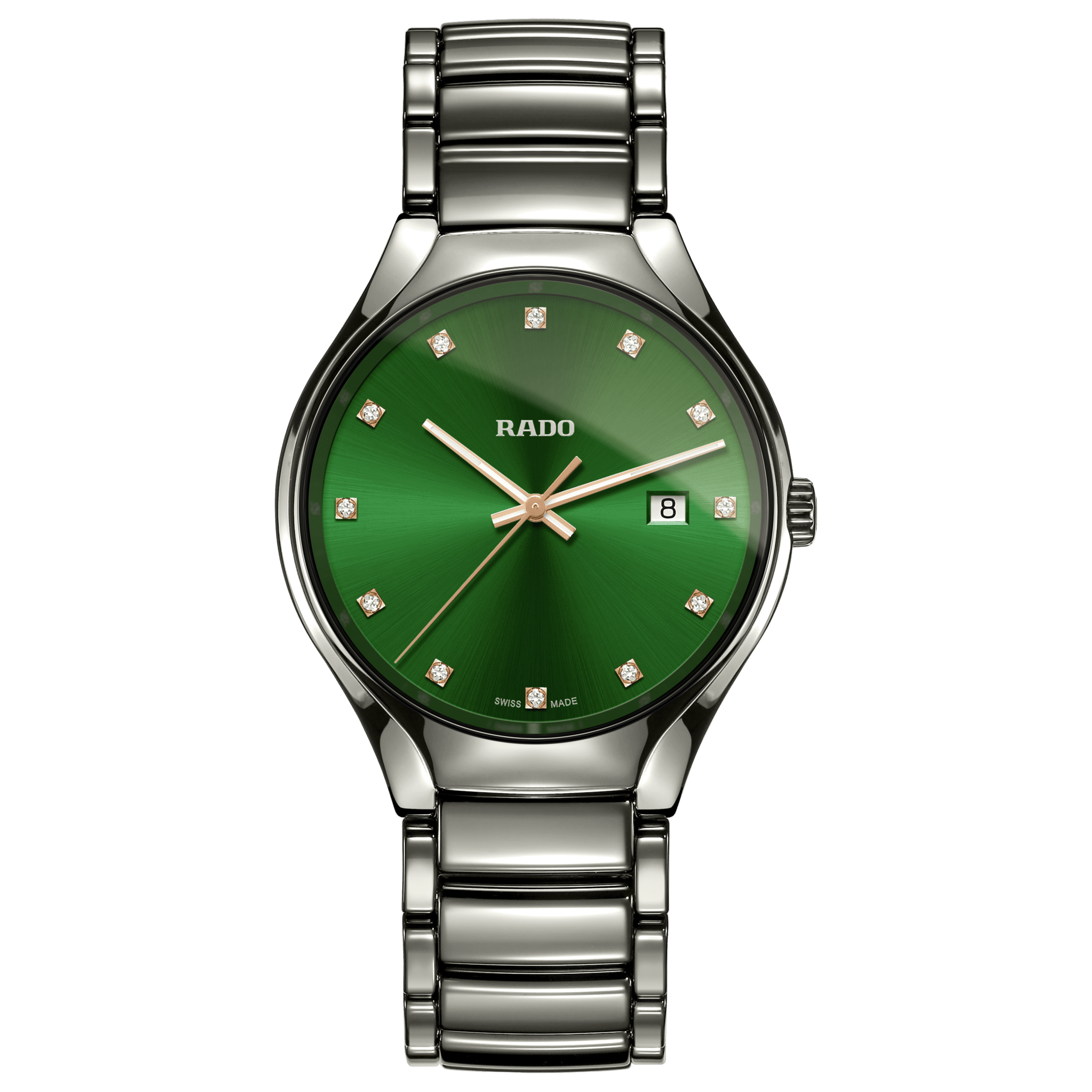 The True Quartz features a 40mm polished plasma high-tech ceramic monobloc case which matches perfectly with the green dial. The dial with 12 diamonds is covered by a curved sapphire crystal. The rose gold coloured hands with white veneer are coated with white Super-Luminova® to ensure excellent visibility. The watch...