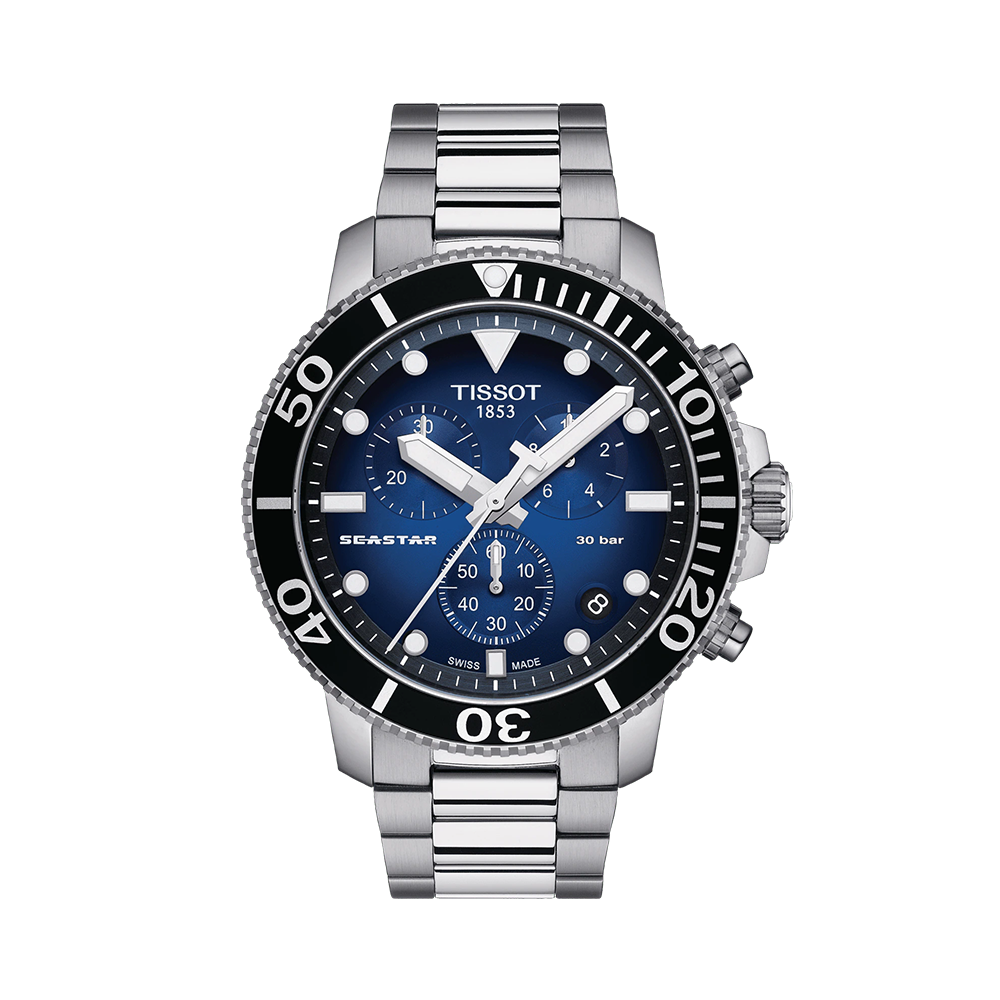 The Tissot Seastar 1000 merges style and performance without compromising either. The diving inspiration shapes both the appearance and the functionality of this watch. It maintains its performance to a pressure of 30 bar (300m/1'000ft), combining underwater sports and a preference for a sophisticated Swiss timepiece.