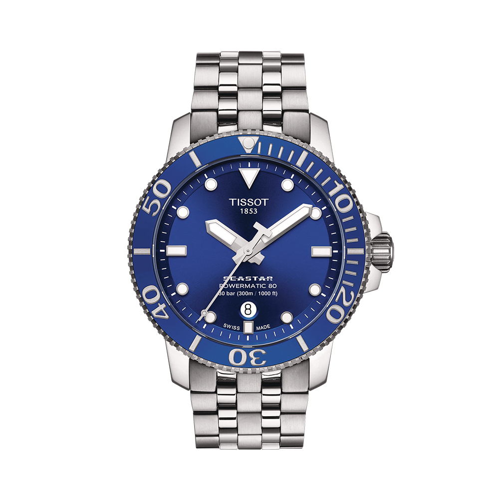 The automatic choice for divers. With its high water-resistance up to a pressure of 30 bar (300 m/1000 ft), screw-down crown and caseback as well as its unidirectional ceramic bezel, the Tissot Seastar 1000 is the ultimate diving watch, now combined with the energy of the Powermatic 80 movement.