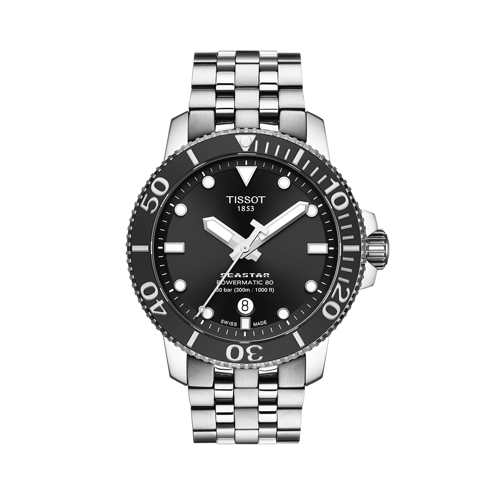 The automatic choice for divers. With its high water-resistance up to a pressure of 30 bar (300 m/1000 ft), screw-down crown and caseback as well as its unidirectional ceramic bezel, the Tissot Seastar 1000 is the ultimate diving watch, now combined with the energy of the Powermatic 80 movement.