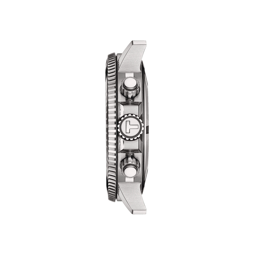 The Tissot Seastar 1000 Chronograph is the instinctive choice for water sports lovers. Its impressive water-resistance up to a pressure of 30 bar (300 m/1000 ft) is combined with the energy of a Swiss-made quartz movement. And features all the element required in a useful instrument: screw-down crown and case back, unidirectional steel bezel with aluminium ring and highly luminescent material for excellent readability in the dark.