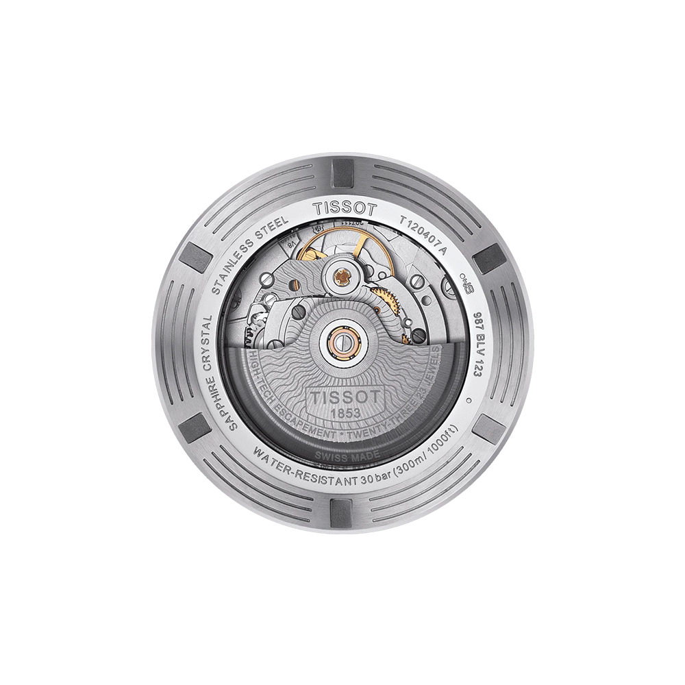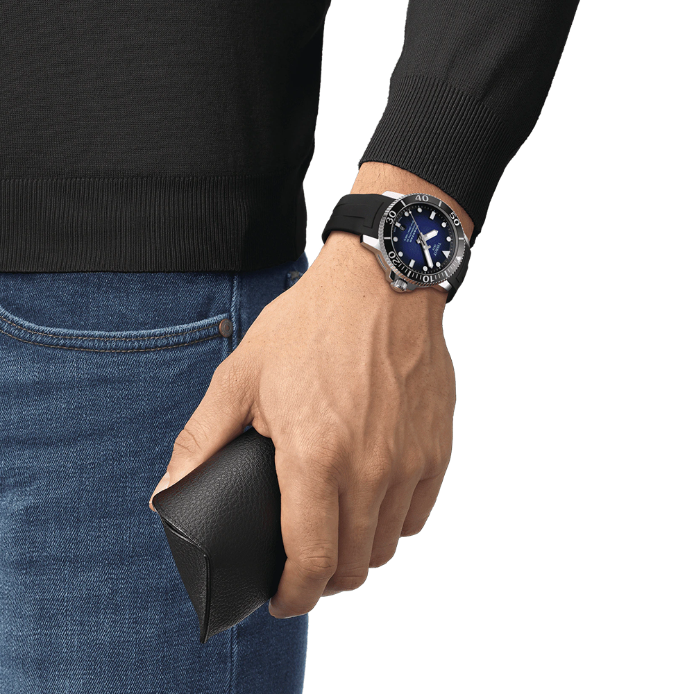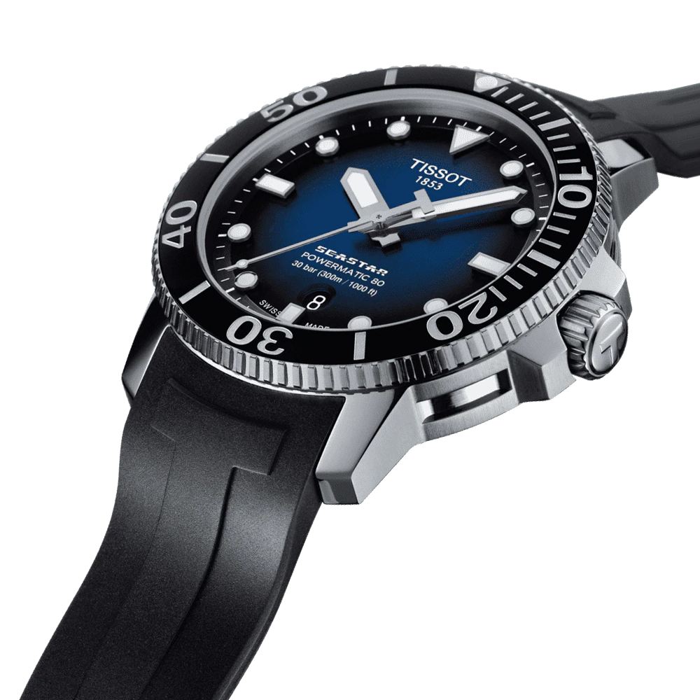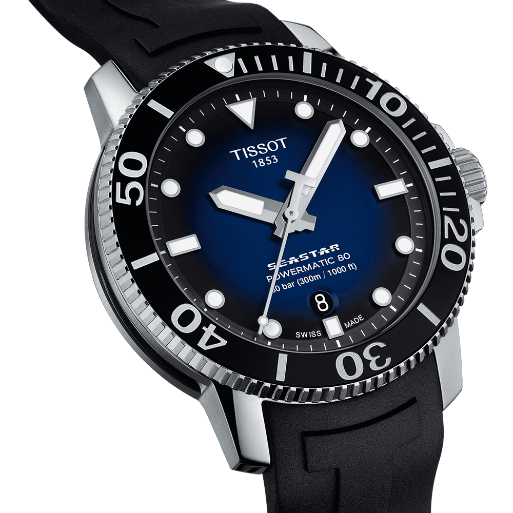 The Tissot Seastar 1000 merges style and performance without compromising either. The diving inspiration shapes both the appearance and the functionality of this watch. It maintains its performance to a pressure of 30 bar (300m/1'000ft), combining underwater sports and a preference for a sophisticated Swiss timepiece. The diving theme continues through elements such as a unidirectional bezel, a strap with a divers' buckle and extension, plus luminescent hands and markings.