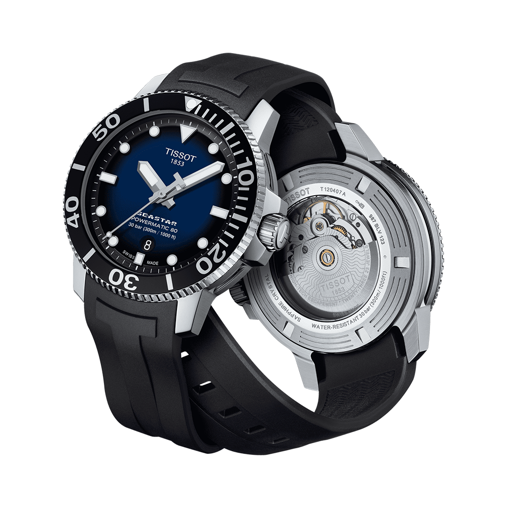 The Tissot Seastar 1000 merges style and performance without compromising either. The diving inspiration shapes both the appearance and the functionality of this watch. It maintains its performance to a pressure of 30 bar (300m/1'000ft), combining underwater sports and a preference for a sophisticated Swiss timepiece. The diving theme continues...